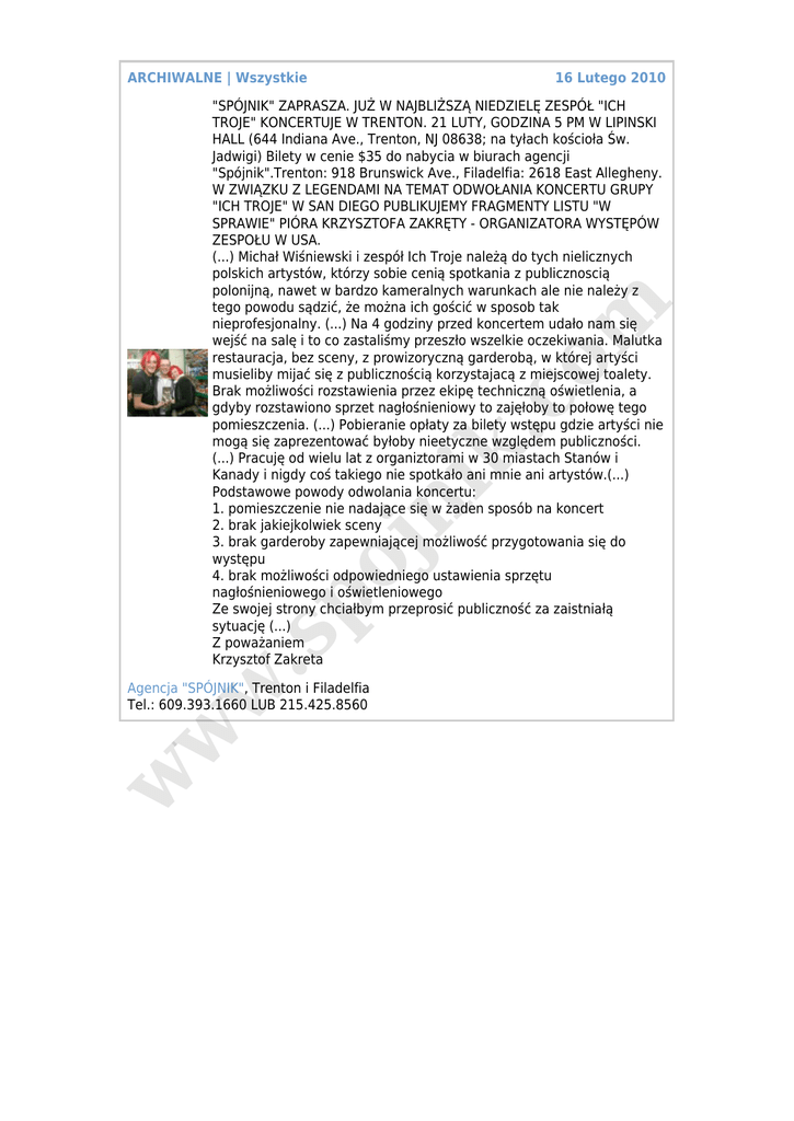 ARCHIWALNE | Wszystkie 16 Lutego 2010 .s po jn ik .c o m "SPÓJNIK" ZAPRASZA. JUŻ W NAJBLIŻSZĄ NIEDZIELĘ ZESPÓŁ "ICH TROJE" KONCERTUJE W TRENTON. 21 LUTY, GODZINA 5 PM W LIPINSKI HALL (644 Indiana Ave., Trenton, NJ 08638; na tyłach kościoła Św. Jadwigi) Bilety w cenie $35 do nabycia w biurach agencji "Spójnik".Trenton: 918 Brunswick Ave., Filadelfia: 2618 East Allegheny. W ZWIĄZKU Z LEGENDAMI NA TEMAT ODWOŁANIA KONCERTU GRUPY "ICH TROJE" W SAN DIEGO PUBLIKUJEMY FRAGMENTY LISTU "W SPRAWIE" PIÓRA KRZYSZTOFA ZAKRĘTY - ORGANIZATORA WYSTĘPÓW ZESPOŁU W USA. (...) Michał Wiśniewski i zespół Ich Troje należą do tych nielicznych polskich artystów, którzy sobie cenią spotkania z publicznoscią polonijną, nawet w bardzo kameralnych warunkach ale nie należy z tego powodu sądzić, że można ich gościć w sposob tak nieprofesjonalny. (...) Na 4 godziny przed koncertem udało nam się wejść na salę i to co zastaliśmy przeszło wszelkie oczekiwania. Malutka restauracja, bez sceny, z prowizoryczną garderobą, w której artyści musieliby mijać się z publicznością korzystajacą z miejscowej toalety. Brak możliwości rozstawienia przez ekipę techniczną oświetlenia, a gdyby rozstawiono sprzet nagłośnieniowy to zajęłoby to połowę tego pomieszczenia. (...) Pobieranie opłaty za bilety wstępu gdzie artyści nie mogą się zaprezentować byłoby nieetyczne względem publiczności. (...) Pracuję od wielu lat z organiztorami w 30 miastach Stanów i Kanady i nigdy coś takiego nie spotkało ani mnie ani artystów.(...) Podstawowe powody odwolania koncertu: 1. pomieszczenie nie nadające się w żaden sposób na koncert 2. brak jakiejkolwiek sceny 3. brak garderoby zapewniającej możliwość przygotowania się do występu 4. brak możliwości odpowiedniego ustawienia sprzętu nagłośnieniowego i oświetleniowego Ze swojej strony chciałbym przeprosić publiczność za zaistniałą sytuację (...) Z poważaniem Krzysztof Zakreta w w w Agencja "SPÓJNIK", Trenton i Filadelfia Tel.: 609.393.1660 LUB 215.425.8560