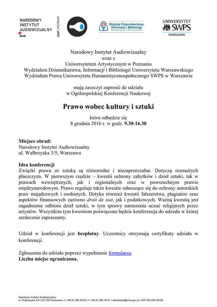 Narodowy Instytut Audiowizualny wraz z Uniwersytetem Artystycznym w Poznaniu Wydziałem Dziennikarstwa, Informacji i Bibliologii Uniwersytetu Warszawskiego Wydziałem Prawa Uniwersytetu Humanistycznospołecznego SWPS w Warszawie mają zaszczyt zaprosić do udziału w Ogólnopolskiej Konferencji Naukowej Prawo wobec kultury i sztuki która odbędzie się 8 grudnia 2016 r. w godz. 9.30-16.30 Miejsce obrad: Narodowy Instytut Audiowizualny ul. Wałbrzyska 3/5, Warszawa Idea konferencji Związki prawa ze sztuką są różnorodne i niezaprzeczalne. Dotyczą rozmaitych płaszczyzn. W pierwszym rzędzie – kwestii ochrony zabytków i dzieł sztuki, tak w prawach wewnętrznych, jak i regionalnych oraz w powszechnym prawie międzynarodowym. Prawo reguluje także kwestie odnoszące się do ochrony autorskich praw majątkowych i osobistych. Dotyka również kwestii fałszerstwa, plagiatów oraz aspektów finansowych zarówno droit de suit, jak i podatkowych. Ważną kwestią jest zagadnienie odbioru dzieł sztuki, w tym sprawy naruszenia uczuć religijnych przez artystów. Wszystkim tym kwestiom poświęcone będzie konferencja do udziału w której serdecznie zapraszamy. Udział w konferencji jest bezpłatny. Uczestnicy otrzymają certyfikaty udziału w konferencji. Zgłoszenia do udziału poprzez wypełnienie formularza. Liczba miejsc ograniczona. Narodowy Instytut Audiowizualny ul. Wałbrzyska 3/5 | 02-739 Warszawa | t: +48 22 380 49 00 | f: +48 22 380 49 01 | [email protected] | NIP 525-234-20-56