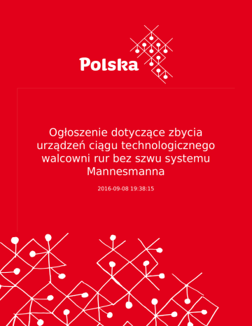Ogłoszenie dotyczące zbycia urządzeń ciągu technologicznego walcowni rur bez szwu systemu Mannesmanna 2016-09-08 19:38:15 2 Zarząd Towarzystwa Finansowego Silesia Sp. z o.o. informuje, że na zasadach określonych w przepisach prawa polskiego istnieje możliwość nabycia od uprawnionego do sprzedaży składników majątkowych Walcowni Rur Jedność Sp. z o.o. Wszystkie zbywane składniki majątkowe są wolne od obciążeń (sprzedaż na zasadach egzekucyjnych). Przedmiotem sprzedaży będą w szczególności urządzenia ciągu technologicznego walcowni rur bez szwu systemu Mannesmanna. Potencjalni inwestorzy mogą zapoznać się ze szczegółowym wykazem przedmiotu sprzedaży sporządzonym w języku polskim i w języku angielskim zamieszczonym na stronach internetowych TF Silesia Sp. z o.o. pod adresem: www.tfsilesia.pl W toku procesu negocjacji potencjalny inwestor będzie mógł ocenić we własnym zakresie stan nabywanego majątku oraz zapoznać się z posiadaną dokumentacją. Odpowiedzi na niniejsze ogłoszenie powinny zostać przekazane w zapieczętowanych kopertach w dwóch egzemplarzach osobiście lub kurierem w nieprzekraczalnym terminie nie dłuższym niż miesiąc od ukazania się ogłoszenia, do godziny 14:00 czasu lokalnego (GMT+1), na poniższy adres: Towarzystwo Finansowe Silesia Sp. z o.o., ul. Ligocka 103, sekretariat Spółki, 40-568 Katowice, Polska. Niniejsze ogłoszenie nie stanowi oferty ani zaproszenia do składania ofert ze strony Towarzystwa Finansowego Silesia Sp. z o.o. W przypadku jakichkolwiek pytań lub wątpliwości dotyczących składnia odpowiedzi na niniejsze ogłoszenie proszę kontaktować się z zarządem TFS, tel.: +48 32 494 5748, fax: +48 32 494 5756 e-mail: [email protected] 3