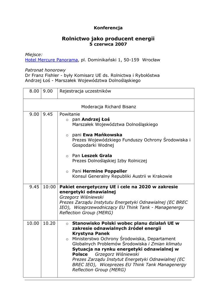 Konferencja Rolnictwo jako producent energii 5 czerwca 2007 Miejsce: Hotel Mercure Panorama, pl. Dominikański 1, 50-159 Wrocław Patronat honorowy Dr Franz Fishler - były Komisarz UE ds. Rolnictwa i Rybołóstwa Andrzej Łoś - Marszałek Województwa Dolnośląskiego 8.00 9.00 Rejestracja uczestników Moderacja Richard Bisanz 9.00 9.45 Powitanie o pan Andrzej Łoś Marszałek Województwa Dolnośląskiego o pani Ewa Mańkowska Prezes Wojewódzkiego Funduszy Ochrony Środowiska i Gospodarki Wodnej o Pan Leszek Grala Prezes Dolnośląskiej Izby Rolniczej o Pani Hermine Poppeller Konsul Generalny Republiki Austrii w Krakowie 9.45 10:00 Pakiet energetyczny UE i cele na 2020 w zakresie energetyki odnawialnej Grzegorz Wiśniewski Prezes Zarządu Instytutu Energetyki Odnawialnej (EC BREC IEO), Wiceprzewodniczący EU Think Tank - Managenergy Reflection Group (MERG) 10.00 10.20 o Stanowisko Polski wobec planu działań UE w zakresie odnawialnych źródeł energii Krystyna Panek o Ministerstwo Ochrony Środowiska, Departament Globalnych Problemów Środowiska i Zmian klimatu Sytuacja na rynku energetyki odnawialnej w Polsce Grzegorz Wiśniewski Prezes Zarządu Instytut Energetyki Odnawialnej (EC BREC IEO), Wiceprezes EU Think Tank Managenergy Reflection Group (MERG) 10.20 10.40 Sytuacja rolnictwa w Polsce - przegląd Jan Krzysztof Jardnaowski, Podsekretarz Stanu, Ministerstwa Rolnictwa RP 11.00 11.15 Przerwa na kawę 11.15 12.00 Regionalna współpraca Polska- Austria, austriacka strategia wykorzystania i promowania odnawialnych źródeł energii oraz stanowisko Austrii wobec planu działań UE Gerhard Burian Dyrektor Departamentu w Ministerstwie Gospodarki i Pracy Republiki Austrii 12.00 12.45 Produkcja energii szansą dla rolnictwa Heinz Kopetz Prezes Austriackiego Związku Biomasy 12.45 13.00 Dyskusja i podsumowanie 13.00 14.00 Lunch Zwiedzanie stoisk informacyjnych, Networking 14.00 15.00 Przykłady zastosowania w Austrii o Biogaz Josef Plank Styryjska Izba Rolnicza o Lokalna kontraktacja energii Alexander Karner Austriacki Związek Biomasy o Region samowystarczalny energetycznie – przykład Güssing Gerhard Burian Dyrektor Departamentu w Ministerstwie Gospodarki i Pracy Republiki Austrii o Wydajność energetyczna Alois Geißlhofer Manager klastru Ökobau Cluster Niederösterreich 15.00 15.30 Przykłady zastosowania w Polsce MoŜliwości produkcji biogazu na bazie surowców rolniczych Józef Szlachta, Prorektor ds. Nauki, Uniwersytet Przyrodniczy we Wrocławiu MoŜliwości produkcji bioetanolu w duŜych zakładach Przedstawiciel firmy DUDA S.A. 15.30 15.45 Przerwa na kawę 15.45 17.00 Dyskusja panelowa Produkcja energii szansą dla polskiego rolnictwa Uczestnicy panelu: o Leszek Grala Prezes Dolnośląskiej Izby Rolniczej o Ewa Mańkowska Prezes Wojewódzkiego Funduszy Ochrony Środowiska i Gospodarki Wodnej o Heinz Kopetz, Prezes Austriackiego Związku Biomasy o Gerhard Burian Dyrektor Departamentu w Ministerstwie Gospodarki i Pracy Republiki Austrii o Grzegorz Wiśniewski Prezes Zarządu Instytut Energetyki Odnawialnej (EC BREC IEO), Wiceprezes EU Think Tank Managenergy Reflection Group (MERG) 17.00 17.30 Podsumowanie oraz prezentacja „Energy Globe Award“ (w fazie ustaleń)