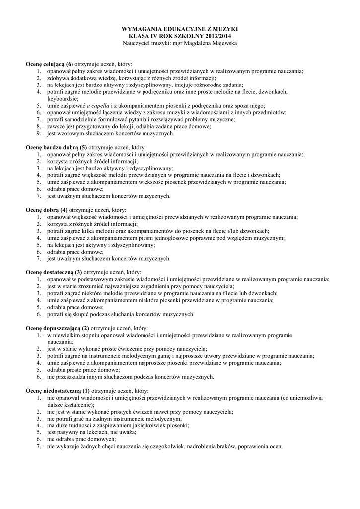 WYMAGANIA EDUKACYJNE Z MUZYKI KLASA IV ROK SZKOLNY 2013/2014 Nauczyciel muzyki: mgr Magdalena Majewska Ocenę celującą (6) otrzymuje uczeń, który: 1. opanował pełny zakres wiadomości i umiejętności przewidzianych w realizowanym programie nauczania; 2. zdobywa dodatkową wiedzę, korzystając z różnych źródeł informacji; 3. na lekcjach jest bardzo aktywny i zdyscyplinowany, inicjuje różnorodne zadania; 4. potrafi zagrać melodie przewidziane w podręczniku oraz inne proste melodie na flecie, dzwonkach, keyboardzie; 5. umie zaśpiewać a capella i z akompaniamentem piosenki z podręcznika oraz spoza niego; 6. opanował umiejętność łączenia wiedzy z zakresu muzyki z wiadomościami z innych przedmiotów; 7. potrafi samodzielnie formułować pytania i rozwiązywać problemy muzyczne; 8. zawsze jest przygotowany do lekcji, odrabia zadane prace domowe; 9. jest wzorowym słuchaczem koncertów muzycznych. Ocenę bardzo dobrą (5) otrzymuje uczeń, który: 1. opanował pełny zakres wiadomości i umiejętności przewidzianych w realizowanym programie nauczania; 2. korzysta z różnych źródeł informacji; 3. na lekcjach jest bardzo aktywny i zdyscyplinowany; 4. potrafi zagrać większość melodii przewidzianych w programie nauczania na flecie i dzwonkach; 5. umie zaśpiewać z akompaniamentem większość piosenek przewidzianych w programie nauczania; 6. odrabia prace domowe; 7. jest uważnym słuchaczem koncertów muzycznych. Ocenę dobrą (4) otrzymuje uczeń, który: 1. opanował większość wiadomości i umiejętności przewidzianych w realizowanym programie nauczania; 2. korzysta z różnych źródeł informacji; 3. potrafi zagrać kilka melodii oraz akompaniamentów do piosenek na flecie i/lub dzwonkach; 4. umie zaśpiewać z akompaniamentem pieśni jednogłosowe poprawnie pod względem muzycznym; 5. na lekcjach jest aktywny i zdyscyplinowany; 6. odrabia prace domowe; 7. jest uważnym słuchaczem koncertów muzycznych. Ocenę dostateczną (3) otrzymuje uczeń, który: 1. opanował w podstawowym zakresie wiadomości i umiejętności przewidziane w realizowanym programie nauczania; 2. jest w stanie zrozumieć najważniejsze zagadnienia przy pomocy nauczyciela; 3. potrafi zagrać niektóre melodie przewidziane w programie nauczania na f1ecie lub dzwonkach; 4. umie zaśpiewać z akompaniamentem niektóre piosenki przewidziane w programie nauczania; 5. odrabia prace domowe; 6. potrafi się skupić podczas słuchania koncertów muzycznych. Ocenę dopuszczającą (2) otrzymuje uczeń, który: 1. w niewielkim stopniu opanował wiadomości i umiejętności przewidziane w realizowanym programie nauczania; 2. jest w stanie wykonać proste ćwiczenie przy pomocy nauczyciela; 3. potrafi zagrać na instrumencie melodycznym gamę i najprostsze utwory przewidziane w programie nauczania; 4. umie zaśpiewać z akompaniamentem najprostsze piosenki przewidziane w programie nauczania; 5. odrabia proste prace domowe; 6. nie przeszkadza innym słuchaczom podczas koncertów muzycznych. Ocenę niedostateczną (1) otrzymuje uczeń, który: 1. nie opanował wiadomości i umiejętności przewidzianych w realizowanym programie nauczania (co uniemożliwia dalsze kształcenie); 2. nie jest w stanie wykonać prostych ćwiczeń nawet przy pomocy nauczyciela; 3. nie potrafi grać na żadnym instrumencie melodycznym; 4. ma duże trudności z zaśpiewaniem jakiejkolwiek piosenki; 5. jest pasywny na lekcjach, nie uważa; 6. nie odrabia prac domowych; 7. nie wykazuje żadnych chęci nauczenia się czegokolwiek, nadrobienia braków, poprawienia ocen.