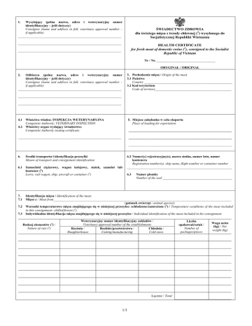 1. Wysyłający (pełna nazwa, adres i weterynaryjny numer identyfikacyjny – jeśli dotyczy) Consignor (name and address in full, veterinary approval number – if applicable) _____________________________________________________________ ŚWIADECTWO ZDROWIA dla świeŜego mięsa z trzody chlewnej (1) wysyłanego do Socjalistycznej Republiki Wietnamu _____________________________________________________________ HEALTH CERTIFICATE for fresh meat of domestic swine (1), consigned to the Socialist Republic of Vietnam _____________________________________________________________ Nr / No ___________________________________ ORYGINAŁ / ORIGINAL 2. Odbiorca (pełna nazwa, adres i weterynaryjny numer identyfikacyjny – jeśli dotyczy) Consignee (name and address in full, veterinary approval number – if applicable) _____________________________________________________________ 3. Pochodzenie mięsa / Origin of the meat 3.1 Państwo Country ____________________________________________________ 3.2 Kod terytorium Code of territory_____________________________________________ _____________________________________________________________ _____________________________________________________________ 4.1 Właściwa władza: INSPEKCJA WETERYNARYJNA Competent Authority: VETERINARY INSPECTION 4.2 Właściwy organ wydający świadectwo: Competent Authority issuing certificate: 5. Miejsce załadunku w celu eksportu Place of loading for exportation _____________________________________________________________ _____________________________________________________________ _____________________________________________________________ _____________________________________________________________ 6. Środki transportu i identyfikacja przesyłki Means of transport and consignment identification 6.1 Samochód cięŜarowy, wagon kolejowy, statek, samolot lub kontener (2) Lorry, rail wagon, ship, aircraft or container (2) 6.2 Numer(y) rejestracyjny(e), nazwa statku, numer lotu, numer kontenera Registration number(s), ship name, flight number or container number ______________________________________________________________ 6.3 Numer plomby Number of the seal _________________________________________ 7. Identyfikacja mięsa / Identification of the meat: 7.1 Mięso z / Мeat from_________________________________________________________________________________________________________ (gatunek zwierząt / animal species) 7.2 Warunki temperaturowe mięsa znajdującego się w niniejszej przesyłce: schłodzone/zamroŜone (2) / Temperature conditions of the meat included in this consignment: chilled/frozen (2) 7.3 Indywidualna identyfikacja mięsa znajdującego się w niniejszej przesyłce / Individual identification of the meat included in his consignment Rodzaj elementów (3) / Nature of cuts (3) Weterynaryjny numer identyfikacyjny zakładów / Veterinary approval number of the establishments Rzeźnia / Rozbiór/przetwórstwo / Chłodnia / Slaughterhouse Cutting/manufacturing Cold store Łącznie / Total 1/3 Liczba opakowań/sztuk / Number of packages/pieces Waga netto (kg) / Net weight (kg) 8. Poświadczenie zdrowia publicznego / Public health attestation: Ja, niŜej podpisany urzędowy lekarz weterynarii, niniejszym poświadczam, Ŝe: / I, the undersigned official veterinarian, hereby certify, that: 8.1 świeŜe mięso otrzymano, przygotowano, poddano obróbce i przechowywano przy zachowaniu warunków sanitarnych obowiązujących podczas produkcji i kontroli ustanowionych przez prawodawstwo Wspólnoty Europejskiej i jest uwaŜane z tego powodu za zdatne do spoŜycia przez ludzi; / the fresh meat has been obtained, prepared, handled and stored under the heath conditions governing production and control laid down in European Community legislation and it is, therefore, considered as such to be fit for human consumption; 8.2 zgodnie z wynikami krajowego programu monitoringu ustanowionego dla Polski mięso nie zawiera szkodliwych dla zdrowia ludzkiego pozostałości antybiotyków, leków weterynaryjnych, hormonów, pestycydów, mykotoksyn i metali toksycznych / according to the national residue monitoring programme established for Poland meat does not contain antibiotic, veterinary drug, hormone, pesticide, mycotoxin and toxic metal residues; 8.3 świeŜe mięso zaopatrzone jest w urzędowy znak jakości zdrowotnej, a opakowania z mięsem – w znak identyfikacyjny, informujące, Ŝe mięso zostało w całości przygotowane i zbadane w zakładach wymienionych w punkcie 7.3, które znajdują się pod stałym nadzorem właściwych słuŜb weterynaryjnych; / the fresh meat bears an official heath mark, and the packages of meat – an identification mark, to the effect that the meat has been wholly dressed and inspected in the establishments indicated under point 7.3 that are operating under constant supervision of the competent veterinary service; 8.4 środki transportu i warunki załadunku niniejszej przesyłki spełniają wymagania higieniczne ustanowione przez prawodawstwo Wspólnoty Europejskiej; / the means of transport and the loading conditions of this consignment meet the hygiene requirements laid down in European Community legislation; 8.5 odnośnie włośnicy, świeŜe mięso: / with regard to trichinosis, the fresh meat: a) zostało poddane badaniu metodą wytrawiania z wynikiem negatywnym (2), / has been subject to an examination by a digestion method with negative results (2), i/lub / and/or b) 9. zostało poddane obróbce w niskiej temperaturze zgodnie z ustawodawstwem Wspólnoty Europejskiej (2). / has been subject to a cold treatment, according to European Community legislation (2). Poświadczenie zdrowia zwierząt / Animal health attestation: Ja, niŜej podpisany urzędowy lekarz weterynarii, niniejszym poświadczam, Ŝe opisane powyŜej mięso: / I, the undersigned official veterinarian, hereby certify, that the fresh meat described above: 9.1 ... zostało pozyskane na terytorium, które w dniu wystawienia ni