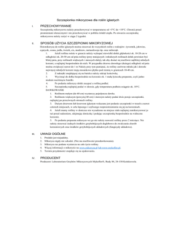 Szczepionka mikoryzowa dla roślin iglastych I. PRZECHOWYWANIE Szczepionkę mikoryzowa należy przechowywać w temperaturze od +5°C do +18°C. Chronić przed promieniami słonecznymi i nie przechowywać w pobliżu źródeł ciepła. Po otwarciu szczepionkę mikoryzowa należy zużyć w ciągu 2 tygodni. II. SPOSÓB UŻYCIA SZCZEPIONKI MIKORYZOWEJ Ektomikoryzę do roślin iglastych można stosować do wszystkich roślin z rodzajów: żywotnik, jałowiec, cyprysik, sosna, jodła, świerk, cis, modrzew, metasekwoja itp. oraz miłorząb. 1. Jeżeli roślina rośnie w gruncie należy wykopać niewielki dołek głębokości ok. 10-20 cm w odległości ok. 20-50 cm od pnia rośliny (przy mniejszych i młodszych roślinach dołek powinien być bliżej pnia, przy roślinach większych i starszych dalej), tak aby dostać się możliwie najbliżej młodych korzeni, a najlepiej bezpośrednio do nich. W przypadku drzewa dorosłego (dużego) odległość od pnia można zwiększyć nawet do 1 m Należy przy tym pamiętać, że rośliny zarówno młode jak i dorosłe najwięcej młodych korzeni mają stosunkowo płytko pod ziemią w granicach 10-40 cm. 2. Z nakrętki znajdującej się na butelce należy odciąć końcówkę. 3. Wycisnąć do dołka bezpośrednio na korzenie ok. 1 małą łyżeczkę preparatu, czyli jedno nieduże naciśnięcie butelki. 4. Po podaniu mikoryzy dołek zasypać a roślinę podlać. 5. Szczepionkę najlepiej podać w okresie, gdy temperatura podłoża osiągnie ok. 10°C. DAWKOWANIE 1. Roślinom małym (do 60 cm) wystarczy pojedyncza dawka. 2. Roślinom większym (powyżej 60 cm) i starszym należy podać dwie porcje szczepionki, najlepiej po przeciwnych stronach rośliny. 3. Dużym drzewom lub krzewom iglastym wskazane jest podanie szczepionki w trzech a nawet czterech miejscach, w celu lepszego i szybszego rozprzestrzenienia się jej na korzeniach. 4. Jeżeli mamy rośliny w doniczce nie wysadzone na miejsce stałe najlepiej zamikoryzować je tuż przed sadzeniem, zdejmując doniczkę i podając szczepionkę bezpośrednio na widoczne korzenie. 5. Po podaniu preparatu mikoryzo we go nie należy nawozić rośliny przez 2 miesiące. Nie należy stosować żadnych środków grzybobójczych doglebowo do zwalczania chorób korzeniowych oraz środków grzybobójczych układowych (fungicydy układowe). III. UWAGI OGÓLNE 1. 2. 3. 4. 5. IV. Produkt jest niejadalny. Mikoryza nigdy nie szkodzi. (Nie ma możliwości przedawkowania). Mikoryza raz podana wystarcza na całe życie rośliny. Więcej informacji o mikoryzie na www.mikoryza.pl lub www.mykoflor.pl. Termin przydatności znajduje się na opakowaniu. PRODUCENT Producent: Laboratorium Grzybów Mikoryzowych Mykoflor®, Rudy 84, 24-130 Końskowola.