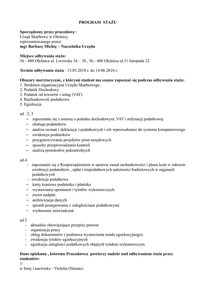 PROGRAM STAŻU Sporządzony przez pracodawę : Urząd Skarbowy w Oleśnicy reprezentowanego przez: mgr Barbarę Michtę – Naczelnika Urzędu Miejsce odbywania stażu: 56 - 400 Oleśnica ul. Lwowska 34 – 38 , 56 - 400 Oleśnica ul.11 listopada 22 Termin odbywania stażu : 15.03.2010 r. do 14.06.2010 r. Obszary merytoryczne, z którymi student ma szanse zapoznać się podczas odbywania stażu: 1. Struktura organizacyjna Urzędu Skarbowego. 2. Podatek Dochodowy 3. Podatek od towarów i usług (VAT) 4. Rachunkowość podatkowa 5. Egzekucja ad . 2, 3 – zapoznanie się z ustawą o podatku dochodowym, VAT i ordynacji podatkowej – obsługa podatników – analiza zeznań ( deklaracji ) podatkowych i ich wprowadzanie do systemu komputerowego – ewidencja podatników – przygotowywanie projektów pism urzędowych – sposoby przeprowadzania kontroli – analiza protokołów pokontrolnych ad.4 - zapoznanie się z Rozporządzeniem w sprawie zasad rachunkowości i planu kont w zakresie ewidencji podatników , opłat i niepodatkowych należności budżetowych w organach podatkowych - ewidencja podatkowa – karty kontowe podatnika i płatnika – wystawianie upomnień i tytułów wykonawczych – zwrot nadpłat – archiwizacja danych – sposób postępowania z zaległościami podatkowymi – wydawanie zaświadczeń ad.5 - aktualnie obowiązujące przepisy prawne organizacja pracy obieg dokumentów ( podstawa wystawienia tutułu egzekucyjnego) ewidencja tytułów egzekucyjnych egzekucja zaległości podatkowych objętych tytułem wykonawczym Dane opiekuna , któremu Pracodawca powierzy nadzór nad odbywaniem stażu przez studentów: 1/ a/ Imię i nazwisko - Violetta Oleniacz b/ stanowisko pracy - Kierownik Referatu 2/ a/ Imię i nazwisko - wz Teresa Wróblewska b/ stanowisko pracy – Specjalista Osoby , które odbędą staż , po ukończeniu studiów będą mogły przystępować do konkursu na wolne stanowisko pracy. Informacja o wolnym stanowisku pracy umieszczana jest w miejscu powszechnie dostępnym w siedzibie urzędu, w Biuletynie Informacji Publicznej urzędu, zwanym dalej „Biuletynem urzędu”, oraz w Biuletynie Informacji Publicznej Kancelarii Prezesa Rady Ministrów, zwanym dalej „Biuletynem Kancelarii”. - Ustawa z dnia 21 listopada 2008 r. o służbie cywilnej ( Dz.U. z 2008 r. Nr 227 , poz.1505 ze zm. ) Podpis w oryginale : Naczelnik Urzędu Skarbowego w Oleśnicy mgr Barbara Michta