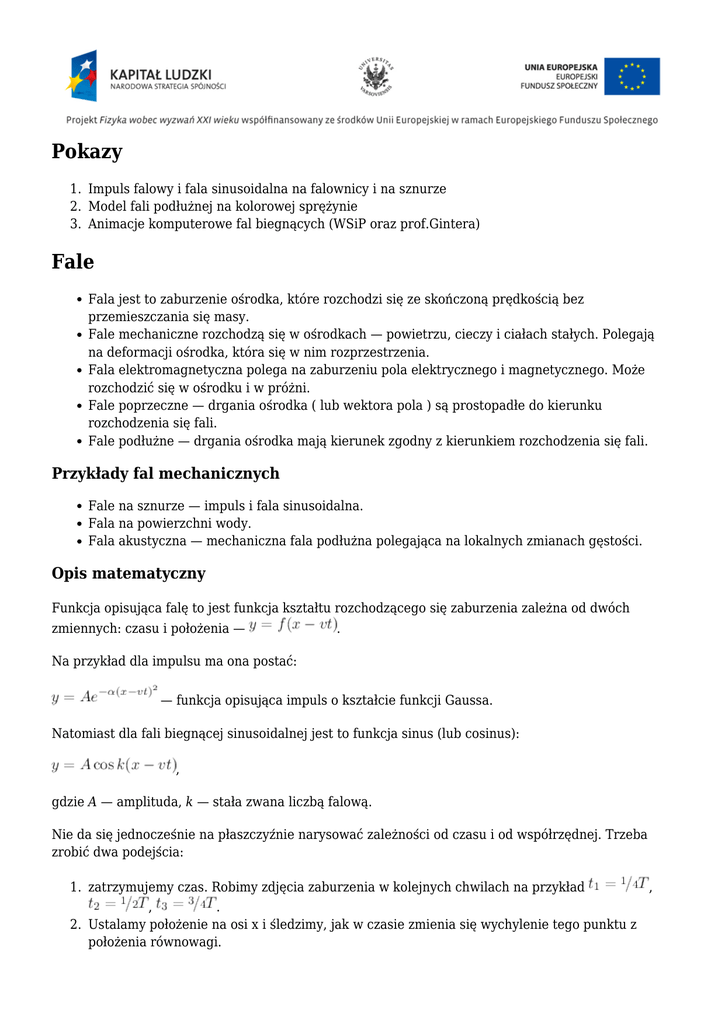 Pokazy 1. Impuls falowy i fala sinusoidalna na falownicy i na sznurze 2. Model fali podłużnej na kolorowej sprężynie 3. Animacje komputerowe fal biegnących (WSiP oraz prof.Gintera) Fale Fala jest to zaburzenie ośrodka, które rozchodzi się ze skończoną prędkością bez przemieszczania się masy. Fale mechaniczne rozchodzą się w ośrodkach — powietrzu, cieczy i ciałach stałych. Polegają na deformacji ośrodka, która się w nim rozprzestrzenia. Fala elektromagnetyczna polega na zaburzeniu pola elektrycznego i magnetycznego. Może rozchodzić się w ośrodku i w próżni. Fale poprzeczne — drgania ośrodka ( lub wektora pola ) są prostopadłe do kierunku rozchodzenia się fali. Fale podłużne — drgania ośrodka mają kierunek zgodny z kierunkiem rozchodzenia się fali. Przykłady fal mechanicznych Fale na sznurze — impuls i fala sinusoidalna. Fala na powierzchni wody. Fala akustyczna — mechaniczna fala podłużna polegająca na lokalnych zmianach gęstości. Opis matematyczny Funkcja opisująca falę to jest funkcja kształtu rozchodzącego się zaburzenia zależna od dwóch zmiennych: czasu i położenia — . Na przykład dla impulsu ma ona postać: — funkcja opisująca impuls o kształcie funkcji Gaussa. Natomiast dla fali biegnącej sinusoidalnej jest to funkcja sinus (lub cosinus): , gdzie A — amplituda, k — stała zwana liczbą falową. Nie da się jednocześnie na płaszczyźnie narysować zależności od czasu i od współrzędnej. Trzeba zrobić dwa podejścia: 1. zatrzymujemy czas. Robimy zdjęcia zaburzenia w kolejnych chwilach na przykład , , . 2. Ustalamy położenie na osi x i śledzimy, jak w czasie zmienia się wychylenie tego punktu z położenia równowagi. Jaki jest sens fizyczny stałej k? — długość fali — odległość między najbliższymi punktami tak samo wychylonymi, czyli będącymi w tej samej fazie. z definicji — liczba falowa ale a czyli czyli: najbardziej powszechnie stosowana postać funkcji opisującej falę biegnąca: A — amplituda x — położenie t — czas k — liczba falowa &mdash częstość kołowa — faza początkowa — okres — czas, w którym dowolny element ośrodka wykonuje jedno pełne drganie Prędkość fazowa fali — z taką prędkością porusza się faza fali — zaburzenie. Grzbiet fali przesunął się w czasie o . W granicy przesunął się wzdłuż osi x, ale z inną prędkością wzdłuż osi y. . Element sznura nie Zależność dyspersyjna (faza fali) (dla fali biegnącej w prawo) (klasyczna zależnośc dyspersyjna) Wykład w znaczącej części przeznaczony na pokazy doświadczeń i animacji komputerowych.