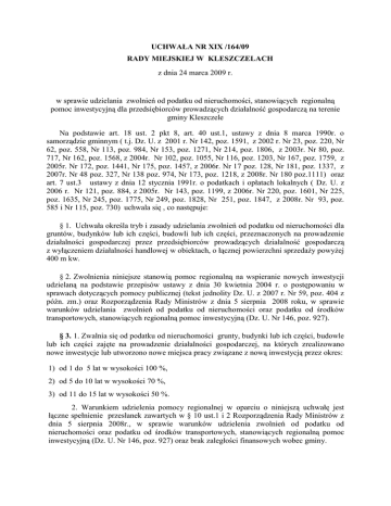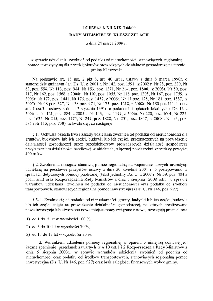 UCHWAŁA NR XIX /164/09 RADY MIEJSKIEJ W KLESZCZELACH z dnia 24 marca 2009 r. w sprawie udzielania zwolnień od podatku od nieruchomości, stanowiących regionalną pomoc inwestycyjną dla przedsiębiorców prowadzących działalność gospodarczą na terenie gminy Kleszczele Na podstawie art. 18 ust. 2 pkt 8, art. 40 ust.1, ustawy z dnia 8 marca 1990r. o samorządzie gminnym ( t.j. Dz. U. z 2001 r. Nr 142, poz. 1591, z 2002 r. Nr 23, poz. 220, Nr 62, poz. 558, Nr 113, poz. 984, Nr 153, poz. 1271, Nr 214, poz. 1806, z 2003r. Nr 80, poz. 717, Nr 162, poz. 1568, z 2004r. Nr 102, poz. 1055, Nr 116, poz. 1203, Nr 167, poz. 1759, z 2005r. Nr 172, poz. 1441, Nr 175, poz. 1457, z 2006r. Nr 17 poz. 128, Nr 181, poz. 1337, z 2007r. Nr 48 poz. 327, Nr 138 poz. 974, Nr 173, poz. 1218, z 2008r. Nr 180 poz.1111) oraz art. 7 ust.3 ustawy z dnia 12 stycznia 1991r. o podatkach i opłatach lokalnych ( Dz. U. z 2006 r. Nr 121, poz. 884, z 2005r. Nr 143, poz. 1199, z 2006r. Nr 220, poz. 1601, Nr 225, poz. 1635, Nr 245, poz. 1775, Nr 249, poz. 1828, Nr 251, poz. 1847, z 2008r. Nr 93, poz. 585 i Nr 115, poz. 730) uchwala się , co następuje: § 1. Uchwała określa tryb i zasady udzielania zwolnień od podatku od nieruchomości dla gruntów, budynków lub ich części, budowli lub ich części, przeznaczonych na prowadzenie działalności gospodarczej przez przedsiębiorców prowadzących działalność gospodarczą z wyłączeniem działalności handlowej w obiektach, o łącznej powierzchni sprzedaży powyżej 400 m kw. § 2. Zwolnienia niniejsze stanowią pomoc regionalną na wspieranie nowych inwestycji udzielaną na podstawie przepisów ustawy z dnia 30 kwietnia 2004 r. o postępowaniu w sprawach dotyczących pomocy publicznej (tekst jednolity Dz. U. z 2007 r. Nr 59, poz. 404 z późn. zm.) oraz Rozporządzenia Rady Ministrów z dnia 5 sierpnia 2008 roku, w sprawie warunków udzielania zwolnień od podatku od nieruchomości oraz podatku od środków transportowych, stanowiących regionalną pomoc inwestycyjną (Dz. U. Nr 146, poz. 927). § 3. 1. Zwalnia się od podatku od nieruchomości grunty, budynki lub ich części, budowle lub ich części zajęte na prowadzenie działalności gospodarczej, na których zrealizowano nowe inwestycje lub utworzono nowe miejsca pracy związane z nową inwestycją przez okres: 1) od 1 do 5 lat w wysokości 100 %, 2) od 5 do 10 lat w wysokości 70 %, 3) od 11 do 15 lat w wysokości 50 %. 2. Warunkiem udzielenia pomocy regionalnej w oparciu o niniejszą uchwałę jest łączne spełnienie przesłanek zawartych w § 10 ust.1 i 2 Rozporządzenia Rady Ministrów z dnia 5 sierpnia 2008r., w sprawie warunków udzielenia zwolnień od podatku od nieruchomości oraz podatku od środków transportowych, stanowiących regionalną pomoc inwestycyjną (Dz. U. Nr 146, poz. 927) oraz brak zaległości finansowych wobec gminy. § 4. Przedsiębiorca zamierzający skorzystać ze zwolnienia z podatku od nieruchomości zobowiązany jest do zgłoszenia takiego zamiaru w formie pisemnej na formularzu stanowiącym załącznik Nr 1 do niniejszej uchwały. § 5. 1. Przedsiębiorca korzystający ze zwolnienia jest zobowiązany do przedłożenia do 15 stycznia - wraz z deklaracją podatkową każdego roku podatkowego następującego po roku, w którym korzystał z pomocy na podstawie niniejszej uchwały, sprawozdania, z uwzględnieniem informacji określonej w Rozporządzeniu Rady Ministrów z dnia 20 marca 2007 r. w sprawie informacji o otrzymanej pomocy publicznej (Dz. U. Nr 61, poz. 413) oraz informacji dotyczących: 1) Wzrostu poziomu zatrudnienia oraz poniesionych kosztów kwalifikujących się do objęcia pomocą nowo utworzonych miejsc pracy w przypadku pomocy na utworzenie miejsc pracy, 2) Wielkości kosztów inwestycji poniesionych po dniu dokonania zgłoszenia, wielkości pomocy uzyskanej z innych źródeł w przypadku pomocy na inwestycje. 2. Przedsiębiorca jest zobowiązany powiadomić pisemnie organ udzielający pomocy o utracie warunków zwolnienia, lub zmianie mającej wpływ na wielkość udzielanej pomocy, najpóźniej w terminie 14 dni od daty powstania okoliczności powodujących tę utratę lub zmianę. 3. Na podstawie informacji otrzymanych od przedsiębiorcy organ udzielający pomocy dokonuje oceny udzielonej pomocy ze szczególnym uwzględnieniem przekroczenia maksymalnej intensywności tej pomocy. 4. Jeżeli przekroczenie dopuszczalnej intensywności pomocy nastąpiło w związku ze zwolnieniem przedsiębiorcy od podatku od nieruchomości w trybie niniejszej uchwały, kwota udzielona ponad dopuszczalną intensywność podlega zwrotowi. 5. W przypadku utraty prawa do zwolnień, podatnik jest zobowiązany do zapłaty podatku wraz z odsetkami od zaległości podatkowych w terminie 14 dni od dnia, w którym nastąpiły okoliczności powodujące utratę prawa do zwolnienia podatkowego, zgodnie z przepisami ustawy z dnia 29 sierpnia 1997 r. - Ordynacja podatkowa (tekst jednolity Dz. U. z 2005 r. Nr 8, poz. 60 z późn. zm.). 6. Przedsiębiorca, który w ustawowym terminie nie zawiadomi organu udzielającego pomocy o utracie warunków do zwolnienia od podatku od nieruchomości, traci do niego prawo, poczynając od miesiąca, w którym je utracił. 7. Przedsiębiorca, który złożył nieprawdziwe informacje co do spełnienia warunków, od których uzależnione jest zwolnienie od podatku lub nie dokonał w terminie zawiadomienia o utracie warunków do zwolnienia od podatku traci prawo do tego zwolnienia za cały okres zwolnienia. § 6. Po zakończeniu inwestycji przedsiębiorca zobowiązuje się do dostarczenia: 1) oświadczenia o zakończeniu inwestycji na druku stanowiącym załącznik Nr 2 do niniejszej uchwały, 2) oświadczenia o wartości nowej inwestycji, ustalonej według kosztów kwalifikujących się do objęcia pomocą oraz o udziale własnym w nakładach związanych z nową inwestycjąna druku stanowiącym załącznik Nr 3 do niniejszej uchwały. § 7. Wyrażone w eur