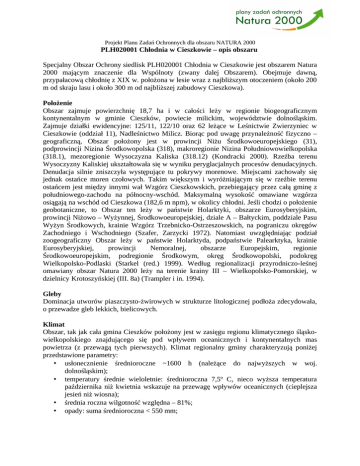 Projekt Planu Zadań Ochronnych dla obszaru NATURA 2000 PLH020001 Chłodnia w Cieszkowie – opis obszaru Specjalny Obszar Ochrony siedlisk PLH020001 Chłodnia w Cieszkowie jest obszarem Natura 2000 mającym znaczenie dla Wspólnoty (zwany dalej Obszarem). Obejmuje dawną, przypałacową chłodnię z XIX w. położona w lesie wraz z najbliższym otoczeniem (około 200 m od skraju lasu i około 300 m od najbliższej zabudowy Cieszkowa). Położenie Obszar zajmuje powierzchnię 18,7 ha i w całości leży w regionie biogeograficznym kontynentalnym w gminie Cieszków, powiecie milickim, województwie dolnośląskim. Zajmuje działki ewidencyjne: 125/11, 122/10 oraz 62 leżące w Leśnictwie Zwierzyniec w Cieszkowie (oddział 11), Nadleśnictwo Milicz. Biorąc pod uwagę przynależność fizyczno – geograficzną, Obszar położony jest w prowincji Niżu Środkowoeuropejskiego (31), podprowincji Nizina Środkowopolska (318), makroregionie Nizina Południowowielkopolska (318.1), mezoregionie Wysoczyzna Kaliska (318.12) (Kondracki 2000). Rzeźba terenu Wysoczyzny Kaliskiej ukształtowała się w wyniku peryglacjalnych procesów denudacyjnych. Denudacja silnie zniszczyła występujące tu pokrywy morenowe. Miejscami zachowały się jednak ostańce moren czołowych. Takim większym i wyróżniającym się w rzeźbie terenu ostańcem jest między innymi wał Wzgórz Cieszkowskich, przebiegający przez całą gminę z południowego-zachodu na północny-wschód. Maksymalną wysokość omawiane wzgórza osiągają na wschód od Cieszkowa (182,6 m npm), w okolicy chłodni. Jeśli chodzi o położenie geobotaniczne, to Obszar ten leży w państwie Holarktyki, obszarze Eurosyberyjskim, prowincji Niżowo – Wyżynnej, Środkowoeuropejskiej, dziale A – Bałtyckim, poddziale Pasu Wyżyn Środkowych, krainie Wzgórz Trzebnicko-Ostrzeszowskich, na pograniczu okręgów Zachodniego i Wschodniego (Szafer, Zarzycki 1972). Natomiast uwzględniając podział zoogeograficzny Obszar leży w państwie Holarktyda, podpaństwie Palearktyka, krainie Eurosyberyjskiej, prowincji Nemoralnej, obszarze Europejskim, regionie Środkowoeuropejskim, podregionie Środkowym, okręg Środkowopolski, podokręg Wielkopolsko-Podlaski (Starkel (red.) 1999). Według regionalizacji przyrodniczo-leśnej omawiany obszar Natura 2000 leży na terenie krainy III – Wielkopolsko-Pomorskiej, w dzielnicy Krotoszyńskiej (III. 8a) (Trampler i in. 1994). Gleby Dominacja utworów piaszczysto-żwirowych w strukturze litologicznej podłoża zdecydowała, o przewadze gleb lekkich, bielicowych. Klimat Obszar, tak jak cała gmina Cieszków położony jest w zasięgu regionu klimatycznego śląskowielkopolskiego znajdującego się pod wpływem oceanicznych i kontynentalnych mas powietrza (z przewagą tych pierwszych). Klimat regionalny gminy charakteryzują poniżej przedstawione parametry: • usłonecznienie średnioroczne ~1600 h (należące do najwyższych w woj. dolnośląskim); • temperatury średnie wieloletnie: średnioroczna 7,5º C, nieco wyższa temperatura października niż kwietnia wskazuje na przewagę wpływów oceanicznych (cieplejsza jesień niż wiosna); • średnia roczna wilgotność względna – 81%; • opady: suma średnioroczna < 550 mm; liczba dni z pokrywą śnieżną 50-60, średnia grubość pokrywy śnieżnej 10-15 cm, maksymalna – do 40 cm; • klimatyczny bilans wodny: od 0 do -20 mm, gmina należy do najsuchszych rejonów województwa; • wiatry: dominujący kierunek – W (22%) i NW (16%). Na tle województwa dolnośląskiego klimat gminy wyróżnia się względnie wysokim usłonecznieniem oraz większą suchością. • Wody powierzchniowe Przez Obszar przepływa ciek wodny, który łączy się z ciekiem Borownica, który uchodzi do Rowu Śląskiego który wpływa do Orlej będącej prawobrzeżnym dopływem Baryczy. Wał Wzgórz Cieszkowskich stanowi lokalny wododział oddzielający zlewnię Rowu Śląskiego od zlewni Baryczy. Na terenie Obszaru, po obu stronach drogi leśnej prowadzącej od skraju lasu pod chłodnię, są obniżenia terenu, które w deszczowe lata napełniają się wodą tworząc płytkie, okresowe zbiorniki. Istniejące i proponowane formy ochrony przyrody zlokalizowane na terenie Obszaru Na terenie Obszaru nie ma innych form ochrony przyrody. Również nie przewiduje się objęcia Obszaru, czy jego części inną formą ochrony niż sieć Natura 2000. Przedmioty ochrony obszaru Obszar został powołany dla ochrony występujących w nim gatunków nietoperzy: mopka (do 200 osobników zimujących - hibernujących) i nocka dużego (10-15 osobników), wymienionych w Załączniku II Dyrektywy Rady 92/43/EWG w sprawie ochrony siedlisk przyrodniczych oraz dzikiej fauny i flory (tzw. dyrektywa siedliskowa). Poza tymi gatunkami nietoperzy występują również gatunki wymienione w Załączniku IV w/w Dyrektywy: mroczek późny, nocek rudy, nocek Natterera, gacek brunatny, gacek szary. Listy przedmiotów ochrony Obszaru nie należy traktować jako ostatecznej. Może ona ulec zmianom w toku prac na sporządzeniem projektu planu zadań ochronnych dla Obszaru.