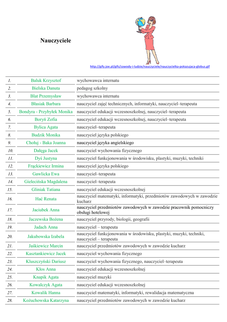 Nauczyciele http://gify.joe.pl/gifs/zawody-i-ludzie/nauczyciele/nauczycielka-pokazujaca-globus.gif 1. Baluk Krzysztof wychowawca internatu 2. Bielska Danuta pedagog szkolny 3. Blat Przemysław wychowawca internatu 4. Błasiak Barbara nauczyciel zajęć technicznych, informatyki, nauczyciel–terapeuta 5. Bondyra - Przybyłek Monika nauczyciel edukacji wczesnoszkolnej, nauczyciel–terapeuta 6. Boryń Zofia nauczyciel edukacji wczesnoszkolnej, nauczyciel–terapeuta 7. Bylica Agata nauczyciel–terapeuta 8. Budzik Monika 9. Chołuj - Baka Joanna 10. Dałęga Jacek nauczyciel wychowania fizycznego 11. Dyś Justyna nauczyciel funkcjonowania w środowisku, plastyki, muzyki, techniki 12. Frąckiewicz Irmina 13. Gawlicka Ewa nauczyciel–terapeuta 14. Gielecińska Magdalena nauczyciel–terapeuta 15. Gliniak Tatiana 16. Hać Renata 17. Jaciubek Anna 18. Jaczewska Bożena 19. Jadach Anna 20. Jakubowska Izabela 21. Jaśkiewicz Marcin 22. Kasztankiewicz Jacek nauczyciel wychowania fizycznego 23. Kluszczyński Dariusz nauczyciel wychowania fizycznego, nauczyciel–terapeuta 24. Kłos Anna 25. Knapik Agata 26. Kowalczyk Agata 27. Kowalik Hanna 28. Kożuchowska Katarzyna nauczyciel języka polskiego nauczyciel języka angielskiego nauczyciel języka polskiego nauczyciel edukacji wczesnoszkolnej nauczyciel matematyki, informatyki, przedmiotów zawodowych w zawodzie kucharz nauczyciel przedmiotów zawodowych w zawodzie pracownik pomocniczy obsługi hotelowej nauczyciel przyrody, biologii, geografii nauczyciel – terapeuta nauczyciel funkcjonowania w środowisku, plastyki, muzyki, techniki, nauczyciel – terapeuta nauczyciel przedmiotów zawodowych w zawodzie kucharz nauczyciel edukacji wczesnoszkolnej nauczyciel muzyki nauczyciel edukacji wczesnoszkolnej nauczyciel matematyki, informatyki, rewalidacja matematyczna nauczyciel przedmiotów zawodowych w zawodzie kucharz 29. Lankiewicz Teresa wychowawca półinternatu 30. Liptak Katarzyna nauczyciel geografii, przyrody, wychowawca półinternatu 31. Marczak Maria 32. Matuszczak Adrianna wychowawca półinternatu 33. Michałczenko Sylwia nauczyciel edukacji wczesnoszkolnej 34. Moczydłowska Marta nauczyciel przedmiotów zawodowych w zawodzie kucharz 35. Moryc Elżbieta nauczyciel–terapeuta 36. Olchowik Maria nauczyciel edukacji wczesnoszkolnej 37. Pelinko Katarzyna nauczyciel wychowania fizycznego, nauczyciel–terapeuta 38. Peplak Bernardetta nauczyciel funkcjonowania w środowisku, plastyki, muzyki, techniki 39. Pękała Urszula 40. Posyłek Katarzyna 41. Prusińska Anna 42. Salamonik Przemysław 43. Słupska Marta 44. Smoczyńska Zofia nauczyciel matematyki , fizyki 45. Sobieraj Olga nauczyciel języka angielskiego 46. Sołonowicz Kamil 47. Staśkiewicz Katarzyna 48. Sternik Paweł 49. Szlendak Zuzanna psycholog 50. Szmigiel Monika nauczyciel–terapeuta 51. Szymanowicz Daria 52. Tkaczyk Renata 53. nauczyciel funkcjonowania w środowisku, plastyki, muzyki, techniki nauczyciel religii nauczyciel języka angielskiego psycholog nauczyciel historii i wiedzy o społeczeństwie, wychowania do życia w rodzinie, nauczyciel–terapeuta nauczyciel plastyki wychowawca internatu nauczyciel języka polskiego, historii i wiedzy o społeczeństwie wychowawca internatu psycholog nauczyciel religii Wasilewska - Bachura Natalia psycholog 54. Wrzesińska Katarzyna 55. Zygmunt - Skorupska Edyta 56. Żmuda Bożena 57. Żmudzka - Szyprzak Joanna nauczyciel przedmiotów zawodowych w zawodzie kucharz nauczyciel funkcjonowania w środowisku, plastyki, muzyki, techniki bibliotekarz, nauczyciel chemii nauczyciel–terapeuta http://jozefrobotnik.katowice.pl/wp-content/uploads/2013/01/Ludzie-Pracownicy-1.gif Pomoc nauczyciela Pracownicy administracji i obsługi 1. Chojnacka – Skorupska Mariola 1. Adaszewski Grzegorz 2. Domańska Joanna 2. Aronowicz Bogusława 3. Fałek Wiesława 3. Brzezińska Iwona 4. Fudali Małgorzata 4. Jarek Dorota 5. Jędrzejczak Jacek 5. Kalmus Małgorzata 6. Marczak Krystyna 6. Kowalska Barbara 7. Nowicka Sylwia 7. Lewandowska Teresa 8. Potocki Jan 8. Lubedkin Bożenna 9. Sawicka Edyta 9. Myszkowski Wojciech 10. Urbaniak Ewa 10. Moskalewicz Joanna 11. Wieczorek Małgorzata 11. Nowak Joanna 12. Wróblewska Olga 12. Przybylska Anna 13. Sikorska Jadwiga 14. Zielińska Elzbieta