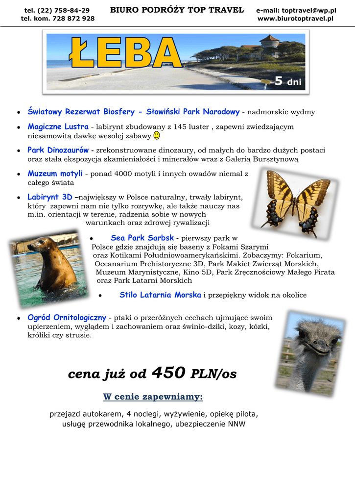 tel. (22) 758-84-29 tel. kom. 728 872 928 BIURO PODRÓŻY TOP TRAVEL e-mail: [email protected] www.biurotoptravel.pl 5 dni Światowy Rezerwat Biosfery - Słowiński Park Narodowy - nadmorskie wydmy Magiczne Lustra - labirynt zbudowany z 145 luster , zapewni zwiedzającym niesamowitą dawkę wesołej zabawy Park Dinozaurów - zrekonstruowane dinozaury, od małych do bardzo dużych postaci oraz stała ekspozycja skamieniałości i minerałów wraz z Galerią Bursztynową Muzeum motyli - ponad 4000 motyli i innych owadów niemal z całego świata Labirynt 3D –największy w Polsce naturalny, trwały labirynt, który zapewni nam nie tylko rozrywkę, ale także nauczy nas m.in. orientacji w terenie, radzenia sobie w nowych warunkach oraz zdrowej rywalizacji Sea Park Sarbsk - pierwszy park w Polsce gdzie znajdują się baseny z Fokami Szarymi oraz Kotikami Południowoamerykańskimi. Zobaczymy: Fokarium, Oceanarium Prehistoryczne 3D, Park Makiet Zwierząt Morskich, Muzeum Marynistyczne, Kino 5D, Park Zręcznościowy Małego Pirata oraz Park Latarni Morskich Stilo Latarnia Morska i przepiękny widok na okolice Ogród Ornitologiczny - ptaki o przeróżnych cechach ujmujące swoim upierzeniem, wyglądem i zachowaniem oraz świnio-dziki, kozy, kózki, króliki czy strusie. cena już od 450 PLN/os W cenie zapewniamy: przejazd autokarem, 4 noclegi, wyżywienie, opiekę pilota, usługę przewodnika lokalnego, ubezpieczenie NNW