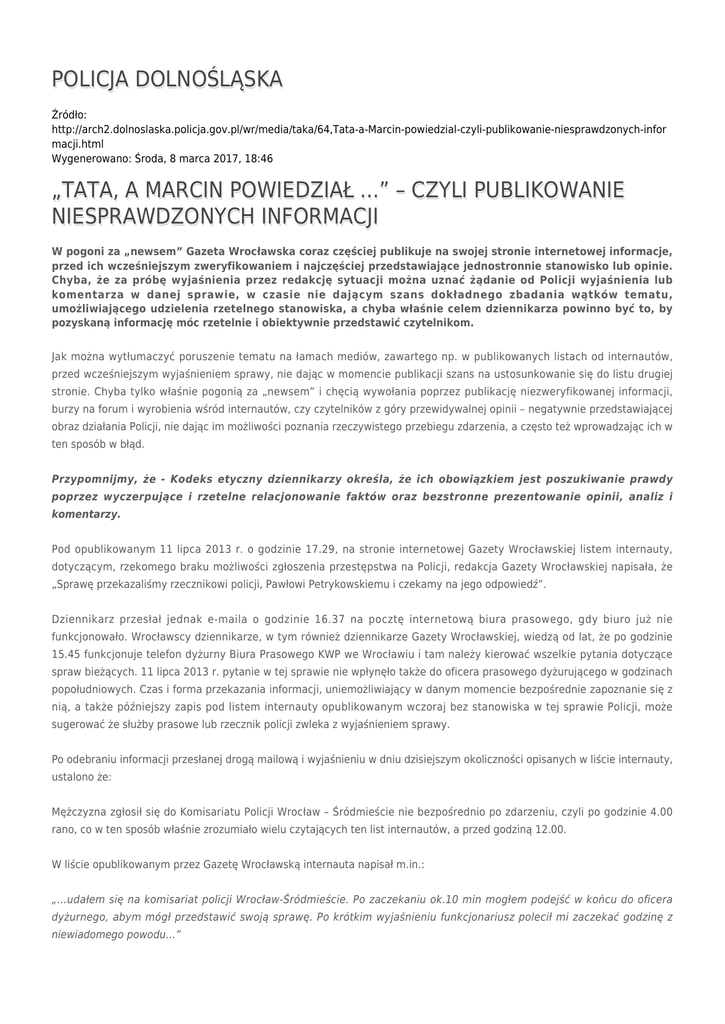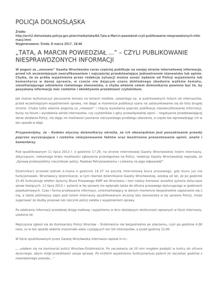 POLICJA DOLNOŚLĄSKA Źródło: http://arch2.dolnoslaska.policja.gov.pl/wr/media/taka/64,Tata-a-Marcin-powiedzial-czyli-publikowanie-niesprawdzonych-infor macji.html Wygenerowano: Środa, 8 marca 2017, 18:46 „TATA, A MARCIN POWIEDZIAŁ ...” – CZYLI PUBLIKOWANIE NIESPRAWDZONYCH INFORMACJI W pogoni za „newsem” Gazeta Wrocławska coraz częściej publikuje na swojej stronie internetowej informacje, przed ich wcześniejszym zweryfikowaniem i najczęściej przedstawiające jednostronnie stanowisko lub opinie. Chyba, że za próbę wyjaśnienia przez redakcję sytuacji można uznać żądanie od Policji wyjaśnienia lub komentarza w danej sprawie, w czasie nie dającym szans dokładnego zbadania wątków tematu, umożliwiającego udzielenia rzetelnego stanowiska, a chyba właśnie celem dziennikarza powinno być to, by pozyskaną informację móc rzetelnie i obiektywnie przedstawić czytelnikom. Jak można wytłumaczyć poruszenie tematu na łamach mediów, zawartego np. w publikowanych listach od internautów, przed wcześniejszym wyjaśnieniem sprawy, nie dając w momencie publikacji szans na ustosunkowanie się do listu drugiej stronie. Chyba tylko właśnie pogonią za „newsem” i chęcią wywołania poprzez publikację niezweryfikowanej informacji, burzy na forum i wyrobienia wśród internautów, czy czytelników z góry przewidywalnej opinii – negatywnie przedstawiającej obraz działania Policji, nie dając im możliwości poznania rzeczywistego przebiegu zdarzenia, a często też wprowadzając ich w ten sposób w błąd. Przypomnijmy, że - Kodeks etyczny dziennikarzy określa, że ich obowiązkiem jest poszukiwanie prawdy poprzez wyczerpujące i rzetelne relacjonowanie faktów oraz bezstronne prezentowanie opinii, analiz i komentarzy. Pod opublikowanym 11 lipca 2013 r. o godzinie 17.29, na stronie internetowej Gazety Wrocławskiej listem internauty, dotyczącym, rzekomego braku możliwości zgłoszenia przestępstwa na Policji, redakcja Gazety Wrocławskiej napisała, że „Sprawę przekazaliśmy rzecznikowi policji, Pawłowi Petrykowskiemu i czekamy na jego odpowiedź”. Dziennikarz przesłał jednak e-maila o godzinie 16.37 na pocztę internetową biura prasowego, gdy biuro już nie funkcjonowało. Wrocławscy dziennikarze, w tym również dziennikarze Gazety Wrocławskiej, wiedzą od lat, że po godzinie 15.45 funkcjonuje telefon dyżurny Biura Prasowego KWP we Wrocławiu i tam należy kierować wszelkie pytania dotyczące spraw bieżących. 11 lipca 2013 r. pytanie w tej sprawie nie wpłynęło także do oficera prasowego dyżurującego w godzinach popołudniowych. Czas i forma przekazania informacji, uniemożliwiający w danym momencie bezpośrednie zapoznanie się z nią, a także późniejszy zapis pod listem internauty opublikowanym wczoraj bez stanowiska w tej sprawie Policji, może sugerować że służby prasowe lub rzecznik policji zwleka z wyjaśnieniem sprawy. Po odebraniu informacji przesłanej drogą mailową i wyjaśnieniu w dniu dzisiejszym okoliczności opisanych w liście internauty, ustalono że: Mężczyzna zgłosił się do Komisariatu Policji Wrocław – Śródmieście nie bezpośrednio po zdarzeniu, czyli po godzinie 4.00 rano, co w ten sposób właśnie zrozumiało wielu czytających ten list internautów, a przed godziną 12.00. W liście opublikowanym przez Gazetę Wrocławską internauta napisał m.in.: „…udałem się na komisariat policji Wrocław-Śródmieście. Po zaczekaniu ok.10 min mogłem podejść w końcu do oficera dyżurnego, abym mógł przedstawić swoją sprawę. Po krótkim wyjaśnieniu funkcjonariusz polecił mi zaczekać godzinę z niewiadomego powodu…” „…Po ponad godzinie czekania znów zgłosiłem się do oficera dyżurnego. Ponownie przedstawiłem pokrótce swoją sprawę, gdyż na stanowisku była już inna osoba, ale usłyszałem mniej więcej coś podobnego niż wcześniej…” „…Po kilkunastu minutach czekania i obserwowania policjantów krzątających się na prawo i lewo, uśmiechniętych i pogodnych doszedłem do wniosku, że pobyt w tym miejscu jest zwykłą stratą czasu…” Po dokładnym sprawdzeniu opisywanej sytuacji, popartym zapisami z monitoringu, okazało się, że mężczyzna był w komisariacie dwukrotnie. Pierwszy raz przed godziną 12.00 i przebywał w jednostce 6 minut, po czym wyszedł z komisariatu, a drugi raz po godzinie 13.00 i przebywał w jednostce 14 minut, ponownie wychodząc z jednostki. Za pierwszym razem mężczyzna został poinformowany, że musi zaczekać, gdyż dyżurujący policjant pionu dochodzeniowego przyjmował zawiadomienie w innej sprawie. W tym czasie na przyjęcie zawiadomienia czekały również trzy inne osoby. Gdy przyszła kolej na przyjęcie zawiadomienia od mężczyzny okazało się, że nie było go na poczekalni. Dyżurujący policjant zaczął obsługiwać więc kolejną osobę oczekującą. Pragnę zauważyć, że mężczyzna był jedyną osobą z poczekalni, która opuściła jednostkę przed przyjęciem zgłoszenia. Łącznie mężczyzna przebywał w jednostce policji aż … 20 minut, a nie jak sugeruje w liście - około 1,5 godziny. Z oficerem dyżurnym jednostki rozmawiał wbrew temu co sugeruje w liście tylko raz. Jeżeli chodzi o próbę złożenia zawiadomienia w Komisariacie Policji Wrocław – Krzyki, to być może mężczyzna pojawił się w jednostce, nie mniej jednak nikt w tym okresie nie zgłaszał dyżurnemu opisywanego w liście przestępstwa. Pragnę zauważyć, że na stanowisku kierowania pełniło cały czas służbę i było obecnych dwóch funkcjonariuszy, a dyżurująca policjantka pionu dochodzeniowego na bieżąco przyjmowała zawiadomienia. Rzecznik Prasowy Komendanta Wojewódzkiego Policji we Wrocławiu asp. Paweł Petrykowski Ocena: 0/5 (0) Tweetnij