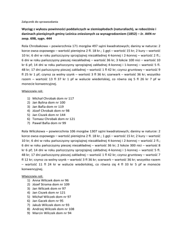 Załącznik do sprawozdania Wyciąg z wykazu powinności poddańczych w ziemiopłodach (naturaliach), w robociźnie i daninach pieniężnych gminy Leśnica zniesionych za wynagrodzeniem (1852) – źr. AKN nr zesp. 698, sygn. 444 Rola Chrobakowa – powierzchnia 171 morgów 497 sążni kwadratowych; daniny w naturze: 2 korce owsa ospowego – wartość pieniężna 2 fl. 18 kr.; 1 gęś – wartość 15 kr; 2 kury – wartość 10 kr; 6 dni w roku pańszczyzny sprzężajnej niezakładnej 4-konnej i 2-konnej – wartość 2 fl.; 6 dni w roku pańszczyzny pieszej niezakładnej – wartość 36 kr; 3 łokcie 100 nici – wartość 10 kr 6 pf; 14 dni w roku pańszczyzny sprzężajnej zakładnej 4-konnej i 1-konnej – wartość 5 fl. 48 kr; 17 dni pańszczyzny pieszej zakładnej – wartość 1 fl 42 kr; czynsz gruntowy – wartość 9 fl 25 kr 1 pf; czynsz za wolny szynk – wartość 3 fl 36 kr; szarwark – wartość 36 kr; wszystko razem – wartość 13 fl 37 kr 1 pf w walucie wiedeńskiej, co równa się 5 fl 26 kr 7 pf w monecie konwencyjnej. Właściciele roli: 1) 2) 3) 4) 5) 6) 7) Michał Chrobak dom nr 117 Jan Bylina dom nr 100 Jan Bafia dom nr 119 Józef Chrobak dom nr 98 Jan Ciszek dom nr 144 Tomasz Chrobak dom nr 121 Paweł Bafia dom nr 99 Rola Wilczkowa – powierzchnia 106 morgów 1307 sążni kwadratowych; daniny w naturze: 2 korce owsa ospowego – wartość pieniężna 2 fl. 18 kr.; 1 gęś – wartość 15 kr; 2 kury – wartość 10 kr; 6 dni w roku pańszczyzny sprzężajnej niezakładnej 4-konnej i 2-konnej – wartość 2 fl.; 6 dni w roku pańszczyzny pieszej niezakładnej – wartość 36 kr; 2 łokcie 300 nici – wartość 8 kr 6 pf; 14 dni w roku pańszczyzny sprzężajnej zakładnej 4-konnej i 1-konnej – wartość 5 fl. 48 kr; 17 dni pańszczyzny pieszej zakładnej – wartość 1 fl 42 kr; czynsz gruntowy – wartość 7 fl 12 kr; czynsz za wolny szynk – wartość 3 fl 36 kr; szarwark – wartość 36 kr; wszystko razem – wartość 11 fl 24 kr w walucie wiedeńskiej, co równa się 4 fl 33 kr 5 pf w monecie konwencyjnej. Właściciele roli: 1) 2) 3) 4) 5) 6) 7) 8) 9) Anna Wilczek dom nr 96 Józef Strama dom nr 109 Jan Wilczek dom nr 97 Jan Ciszek dom nr 121 Michał Wilczek dom nr 97 Jan Gacek dom nr 95 Jakub Wilczek dom nr 93 Andrzej Wilczek dom nr 108 Marcin Wilczek dom nr 94 10) Jan Wilczek dom nr 91 11) Józef Wilczek dom nr 91 12) Jan Komperda dom nr 107 13) Bartłomiej Łaś dom nr 50