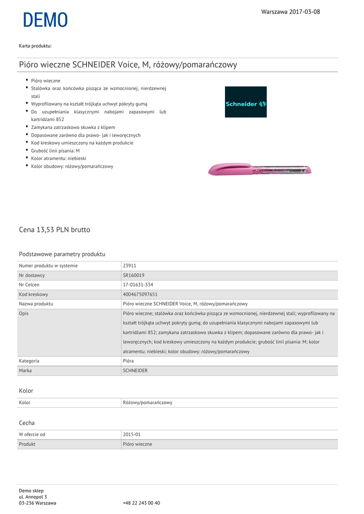 Warszawa 2017-03-08 Karta produktu: Pióro wieczne SCHNEIDER Voice, M, różowy/pomarańczowy Pióro wieczne Stalówka oraz końcówka pisząca ze wzmocnionej, nierdzewnej stali Wyprofilowany na kształt trójkąta uchwyt pokryty gumą Do uzupełniania klasycznymi nabojami zapasowymi lub kartridżami 852 Zamykana zatrzaskowo skuwka z klipem Dopasowane zarówno dla prawo- jak i leworęcznych Kod kreskowy umieszczony na każdym produkcie Grubość linii pisania: M Kolor atramentu: niebieski Kolor obudowy: różowy/pomarańczowy Cena 13,53 PLN brutto Podstawowe parametry produktu Numer produktu w systemie 23911 Nr dostawcy SR160019 Nr Celcen 17-01631-334 Kod kreskowy 4004675097651 Nazwa produktu Pióro wieczne SCHNEIDER Voice, M, różowy/pomarańczowy Opis Pióro wieczne; stalówka oraz końcówka pisząca ze wzmocnionej, nierdzewnej stali; wyprofilowany na kształt trójkąta uchwyt pokryty gumą; do uzupełniania klasycznymi nabojami zapasowymi lub kartridżami 852; zamykana zatrzaskowo skuwka z klipem; dopasowane zarówno dla prawo- jak i leworęcznych; kod kreskowy umieszczony na każdym produkcie; grubość linii pisania: M; kolor atramentu: niebieski; kolor obudowy: różowy/pomarańczowy Kategoria Pióra Marka SCHNEIDER Kolor Kolor Różowy/pomarańczowy Cecha W ofercie od 2015-01 Produkt Pióro wieczne Demo sklep ul. Annopol 3 03-236 Warszawa +48 22 243 00 40 Warszawa 2017-03-08 Karta katalogowa produktu cd. Pióro wieczne SCHNEIDER Voice, M, różowy/pomarańczowy Wspólny słownik zamówień CPV 30192122-2 Pióra wieczne Certyfikaty Nowy produkt w ofercie Standard Hit Standard Serdecznie zapraszamy do współpracy Demo sklep zespół. Demo sklep ul. Annopol 3 03-236 Warszawa +48 22 243 00 40