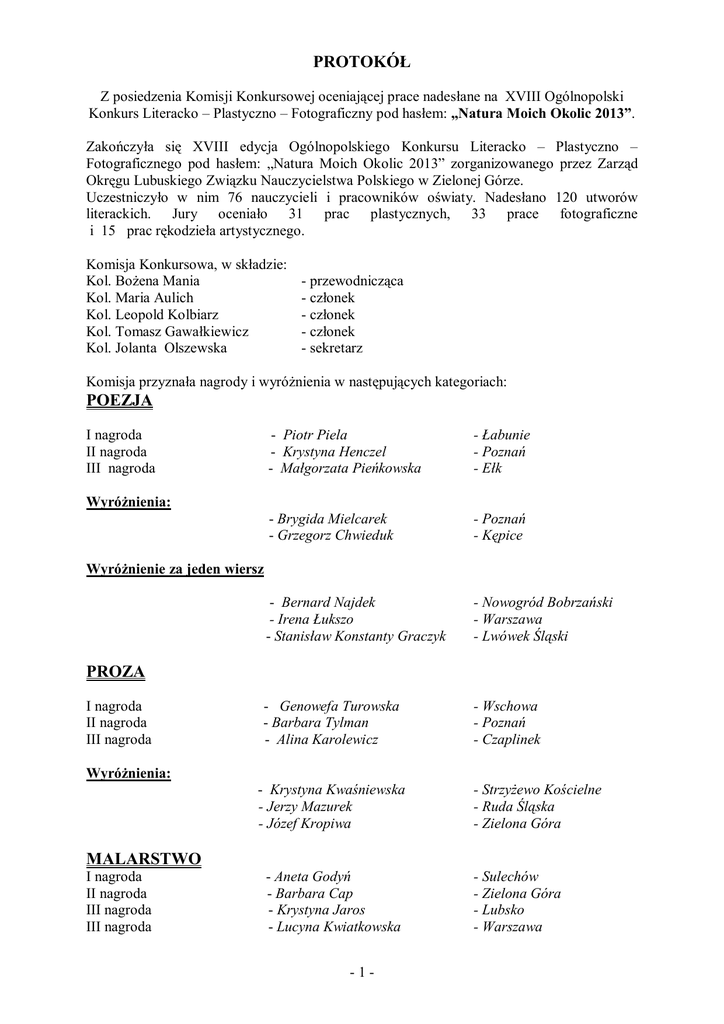 PROTOKÓŁ Z posiedzenia Komisji Konkursowej oceniającej prace nadesłane na XVIII Ogólnopolski Konkurs Literacko – Plastyczno – Fotograficzny pod hasłem: „Natura Moich Okolic 2013”. Zakończyła się XVIII edycja Ogólnopolskiego Konkursu Literacko – Plastyczno – Fotograficznego pod hasłem: „Natura Moich Okolic 2013” zorganizowanego przez Zarząd Okręgu Lubuskiego Związku Nauczycielstwa Polskiego w Zielonej Górze. Uczestniczyło w nim 76 nauczycieli i pracowników oświaty. Nadesłano 120 utworów literackich. Jury oceniało 31 prac plastycznych, 33 prace fotograficzne i 15 prac rękodzieła artystycznego. Komisja Konkursowa, w składzie: Kol. Bożena Mania Kol. Maria Aulich Kol. Leopold Kolbiarz Kol. Tomasz Gawałkiewicz Kol. Jolanta Olszewska - przewodnicząca - członek - członek - członek - sekretarz Komisja przyznała nagrody i wyróżnienia w następujących kategoriach: POEZJA - Piotr Piela - Krystyna Henczel - Małgorzata Pieńkowska - Łabunie - Poznań - Ełk - Brygida Mielcarek - Grzegorz Chwieduk - Poznań - Kępice - Bernard Najdek - Irena Łukszo - Stanisław Konstanty Graczyk - Nowogród Bobrzański - Warszawa - Lwówek Śląski - Genowefa Turowska - Barbara Tylman - Alina Karolewicz - Wschowa - Poznań - Czaplinek I nagroda II nagroda III nagroda Wyróżnienia: Wyróżnienie za jeden wiersz PROZA I nagroda II nagroda III nagroda Wyróżnienia: - Krystyna Kwaśniewska - Jerzy Mazurek - Józef Kropiwa - Strzyżewo Kościelne - Ruda Śląska - Zielona Góra MALARSTWO I nagroda II nagroda III nagroda III nagroda - Aneta Godyń - Barbara Cap - Krystyna Jaros - Lucyna Kwiatkowska -1- - Sulechów - Zielona Góra - Lubsko - Warszawa Wyróżnienia: - Janina Lis - Urszula Bujakiewicz - Liwia Litecka - Cecylia Januszkiewicz – Wojtysiak RYSUNEK – GRAFIKA Wyróżnienie - Felicja Wołyńska - Sulechów - Wolsztyn - Racula - Łódź - Kamieniec Ząbkowicki KORZENIOPLASTYKA Wyróżnienie - Jerzy Płachta - Kalisz Pomorski FOTOGRAFIA I nagroda II nagroda - Bolesława Płachta - Anna Lis - Kalisz Pomorski - Gniezno Wyróżnienie: - Jerzy Mazurek - Ruda Śląska - Zofia Głogowska - Lubsko - Ewa Grzywacz - Lubsko HAFT RICHELIEU Wyróżnienie HAFT KRZYŻYKOWY Wyróżnienie ROBÓTKI RĘCZNE Wyróżnienia - Bronisława Bobek - Teresa Kaczan – Karczewska - Maria Klauz - Wieliczka - Augustów - Lubsko Wszystkim nagrodzonym i wyróżnionym serdecznie gratulujemy i zapraszamy do udziału w naszym konkursie w przyszłym roku. Otrzymacie Szanowni Państwo pocztą lub na plenerze dyplomy, upominki rzeczowe i katalogi. Za Komisję Bożena Mania -2-