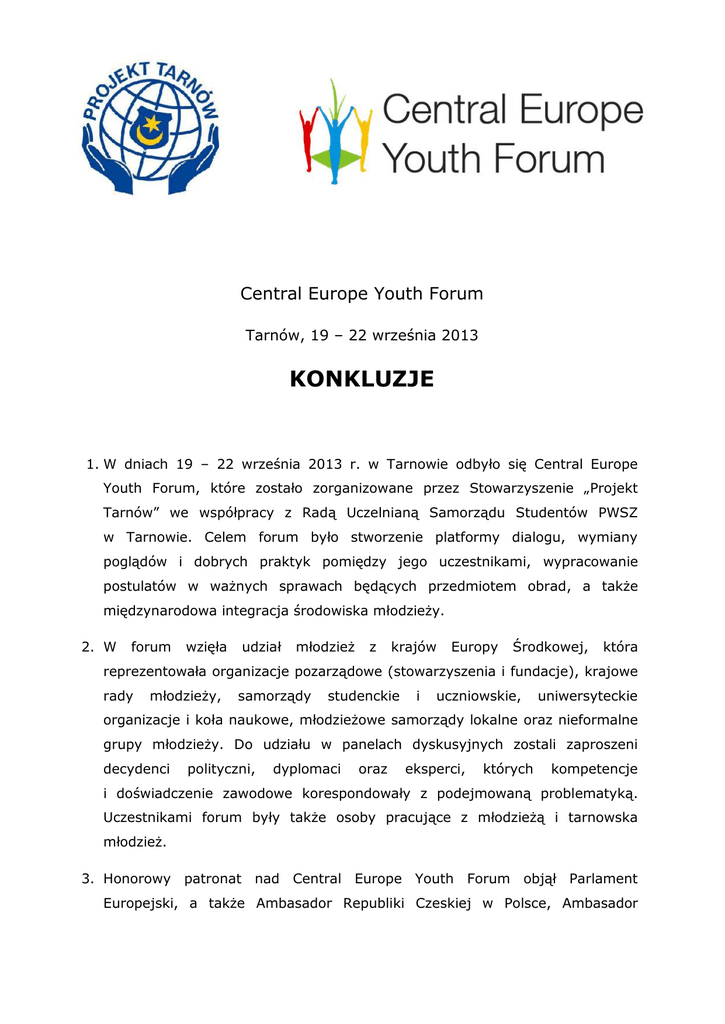 Central Europe Youth Forum Tarnów, 19 – 22 września 2013 KONKLUZJE 1. W dniach 19 – 22 września 2013 r. w Tarnowie odbyło się Central Europe Youth Forum, które zostało zorganizowane przez Stowarzyszenie „Projekt Tarnów” we współpracy z Radą Uczelnianą Samorządu Studentów PWSZ w Tarnowie. Celem forum było stworzenie platformy dialogu, wymiany poglądów i dobrych praktyk pomiędzy jego uczestnikami, wypracowanie postulatów w ważnych sprawach będących przedmiotem obrad, a także międzynarodowa integracja środowiska młodzieży. 2. W forum wzięła udział młodzież z krajów Europy Środkowej, która reprezentowała organizacje pozarządowe (stowarzyszenia i fundacje), krajowe rady młodzieży, samorządy studenckie i uczniowskie, uniwersyteckie organizacje i koła naukowe, młodzieżowe samorządy lokalne oraz nieformalne grupy młodzieży. Do udziału w panelach dyskusyjnych zostali zaproszeni decydenci polityczni, dyplomaci oraz eksperci, których kompetencje i doświadczenie zawodowe korespondowały z podejmowaną problematyką. Uczestnikami forum były także osoby pracujące z młodzieżą i tarnowska młodzież. 3. Honorowy patronat nad Central Europe Youth Forum objął Parlament Europejski, a także Ambasador Republiki Czeskiej w Polsce, Ambasador Republiki Litewskiej w Polsce, Ambasador Republiki Słowackiej w Polsce, Ambasador Węgier w Polsce, Marszałek Województwa Małopolskiego, Prezydent Miasta Tarnowa, Starosta Tarnowski, Rektor Państwowej Wyższej Szkoły Zawodowej w Tarnowie, Europejska Akademia Dyplomacji oraz Polska Rada Organizacji Młodzieżowych. Do uczestników forum zwrócił się ze specjalnym przesłaniem Czesław Siekierski Poseł do PE, Paweł Kowal Poseł do PE, Jan Sechter Ambasador Nadzwyczajny i Pełnomocny Republiki Czeskiej w Polsce, Krzysztof Szczerski Poseł na Sejm RP oraz Andrzej Seremet Prokurator Generalny RP i Prezydent Sieci Prokuratorów Generalnych lub ekwiwalentnych instytucji UE. 4. Tematyka forum koncentrowała się na następujących zagadnieniach: rola i znaczenie krajów Europy Środkowej w procesie integracji europejskiej; obywatelstwo UE; polityka młodzieżowa UE; działalność w organizacjach pozarządowych; przyszłość UE. 5. Uczestnicy forum: - podkreślili z satysfakcją, że forum stworzyło znakomitą przestrzeń do wymiany poglądów, postulatów i poznania swoich rówieśników z innych państw Europy Środkowej; - w zdecydowanej większości uznali, że obywatelstwo UE jest czynnikiem integrującym Europejczyków i budującym ich wspólną tożsamość twierdząc, iż sami czują się Obywatelami UE. Docenili praktyczny wymiar tej instytucji wskazując na liczne przywileje z niej płynące, chociażby na prawo do swobodnego przemieszczania się i przebywania na terytorium państw członkowskich UE. Stwierdzili, że relacja subsydiarności obywatelstwa UE w stosunku do krajowego jest właściwą konstrukcją prawną. Część osób zgodziła się z poglądem, iż ustanowienie obywatelstwa UE prowadzi docelowo do utworzenia Stanów Zjednoczonych Europy. To zaś sprowokowało pytanie, czy jest to właściwy kierunek i czy tego rodzaju projekt byłby dla Europy korzystny. Okazało się, że młodzież nie jest zgodna w tej kwestii, aczkolwiek przeważył nieznacznie pogląd, iż UE nie powinna dążyć do federalizacji, gdyż to spowodowałoby marginalizację polityczną mniejszych krajów w UE, takich jak właśnie kraje Europy Środkowej. Co więcej, taki projekt polityczny wydaje się być nie możliwy do zrealizowania z uwagi na różnice kulturowe i tradycję poszczególnych państw; - w perspektywie zbliżających się wyborów do PE, postulowali zintensyfikowanie działań promujących udział Europejczyków we wspomnianej elekcji. Uczestnicy zatroskani szczególnie o frekwencję wśród swoich rówieśników stwierdzili, że najlepszym sposobem skutecznego motywowania do uczestnictwa w wyborach europejskich jest przybliżanie instytucji PE opinii publicznej i jej ogromnego wpływu na naszą codzienność. Powinno się to odbywać już od najmłodszych lat w szkołach w ramach edukacji obywatelskiej, gdzie nauczyciele propagowaliby wśród uczniów postawy propaństwowe i prospołeczne. Do tego jednak potrzebna jest częściowa zmiana systemu edukacji i odmiana mentalności nauczycieli. Dużą rolę w tym zakresie mają także do odegrania Posłowie do PE, którzy powinni częściej spotykać się z młodzieżą i poświęcać im więcej uwagi, jak również organizacje pozarządowe, które na tego rodzaju działania mają szansę pozyskiwać granty finansowe. Dodatkowym narzędziem, które byłoby efektywne z punktu widzenia promocji wyborów do PE, jest niewątpliwie Internet i portale społecznościowe. To właśnie za ich pośrednictwem można w bardzo łatwy sposób dotrzeć do wielu młodych ludzi; - wyrazili głębokie zaniepokojenie z powodu dużej liczby tworzonych przez UE regulacji prawnych (często także drobiazgowych) zbytnio ingerujących w sprawy wewnętrzne państw członkowskich UE; - z zadowoleniem podkreślili, że coraz większa grupa młodzieży angażuje się w działalność organizacji pozarządowych i staje się wolontariuszami. Jednak odsetek osób obojętnych w tym obszarze jest ciągle duży. Próbując perswadować młodzież do zmiany postaw i nastawienia w tym zakresie, należy przybliżać jej korzyści, które się z nią wiążą, przede wszystkim: rozwój osobisty, poznawanie nowych ludzi, wzrost kompetencji językowych i interpersonalnych, czy nawet możliwość zwiedzania nowych miejsc na całym świecie; - analizując codzienną rzeczywistość, w której funkcjonują organizacje pozarządowe zgodnie stwierdzili, że problemami, z którymi muszą się one borykać są, m.in.: niski poziom umiejętności pozyskiwania środków finansowych na bieżącą działalność, która miałaby charakter kompleksowy i cykliczny, niż doraźny i jednostkowy; brak 