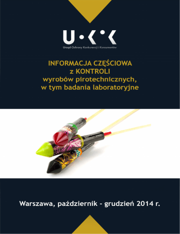 [Rok] DNR–731– ( )/14/AT Warszawa, KONTROLA PRAWIDŁOWOŚCI I RZETELNOŚCI ORGANIZOWANIA PROMOCJI W ZAKRESIE ARTYKUŁÓW ŻYWNOŚCIOWYCH [PODTYTUŁ DOKUMENTU] GSOBCZYNSKI grudzień 2014 r. Informacja z kontroli wyrobów pirotechnicznych INFORMACJA CZĘŚCIOWA Z KONTROLI WYROBÓW PIROTECHNICZNYCH, W TYM BADANIA LABORATORYJNE Termin: 1 października – 5 grudnia 2014 r. Kontrolujący: 11 wojewódzkich inspektoratów Inspekcji Handlowej (WIIH), na terenie których działają producenci i importerzy: Dolnośląski, Lubelski, Lubuski, Łódzki, Kujawsko-Pomorski, Małopolski, Mazowiecki, Podkarpacki, Pomorski, Śląski i Wielkopolski,. Cel: sprawdzenie zgodności wyrobów pirotechnicznych z zasadniczymi wymaganiami określonymi w ustawie z dnia 21 czerwca 2002 r. o materiałach wybuchowych przeznaczonych do użytku cywilnego1. Ponadto do 4 lipca 2017 r. w obrocie mogą znajdować się zarówno wyroby podlegające przepisom umwuc, jak i podlegające przepisom ustawy z dnia 12 grudnia 2003 r. o ogólnym bezpieczeństwie produktów2, zatem kontrolą objęto również te wyroby. Zakres kontroli: w ramach kontroli sprawdzono prawidłowość oznakowania, konstrukcji wyrobów, dostępność i prawidłowość instrukcji obsługi oraz wybrane wyroby poddano badaniom laboratoryjnym (30 próbek). Przedmiot kontroli: wyroby pirotechniczne widowiskowe klasy 1, 2 i 3, które są wyrobami przeznaczonymi dla konsumentów oraz wyroby klasy 4 przeznaczone dla profesjonalistów. Wyniki kontroli: Łącznie skontrolowano 79 przedsiębiorców, w tym: · 6 producentów, · 9 importerów, · 28 hurtowni, · 36 sklepów detalicznych. W trakcie kontroli sprawdzono łącznie 529 rodzajów wyrobów pirotechnicznych (513 rodzajów wyrobów klas 1-3 i 16 rodzajów wyrobów klasy 4), w tym 444 wyroby oznaczone znakiem CE (84 proc. skontrolowanych wyrobów) oraz 85 wyrobów pirotechnicznych podlegających przepisom uobp (16 proc. kontrolowanych wyrobów). 1 2 Dz. U. z 2012 r. poz. 1329, ze zm., dalej: umwuc. Dz. U. Nr 229, poz. 2275, ze zm., dalej: uobp. 1 Informacja z kontroli wyrobów pirotechnicznych Wszystkie skontrolowane wyroby zostały wytworzone w Chinach a wprowadzone do obrotu przez polskich przedsiębiorców, występujących w charakterze producenta (6 podmiotów) lub importera (9 podmiotów) oraz 2 producentów mających siedzibę na terenie Republiki Czeskiej. 2 Informacja z kontroli wyrobów pirotechnicznych Na poniższych wykresach przedstawiono podział skontrolowanych wyrobów na poszczególne typy wyrobów pirotechnicznych. Wykres 1. Wyroby objęte uobp 11% 18% baterie petardy 53% rakiety pozostałe 18% Źródło: opracowanie własne UOKiK na podstawie danych przekazanych przez WIIH Wykres 2. Wyroby objęte umwuc 3% 7% 7% baterie kombinacje 8% petardy rakiety 7% 62% 6% fontanny rzymskie ognie pozostałe Źródło: opracowanie własne UOKiK na podstawie danych przekazanych przez WIIH W wyniku oględzin wyrobów i dokumentacji technicznej zakwestionowano 53 rodzajów wyrobów (10 proc. ogółem skontrolowanych wyrobów), w tym: · 31 rodzajów wyrobów ze znakiem CE, co stanowi 7 proc. wyrobów niezgodnych w tej grupie; · 22 rodzaje wyrobów podlegających uobp, co stanowi 26 proc. wyrobów niezgodnych w tej grupie. 3 Informacja z kontroli wyrobów pirotechnicznych Wykryte niezgodności: Wśród wyrobów oznaczonych znakiem CE niezgodności dotyczyły: · braku niektórych informacji i ostrzeżeń dotyczących bezpieczeństwa użytkowania (17 rodzajów wyrobów), · braku informacji w języku polskim (4), · braku na etykietach takich danych jak typ wyrobu, klasa wyrobu, nazwa producenta, rok produkcji (16), · drobnych uchybień w deklaracji zgodności (2), · nieprawidłowo klasyfikacji wyrobu (2). Wśród wyrobów objętych przepisami uobp niezgodności dotyczyły: · braku niektórych informacji i ostrzeżeń dotyczących bezpieczeństwa użytkowania bądź podania informacji sprzecznych (19), · niewskazania na etykiecie klasy wyrobu (3). Badania laboratoryjne: na 30 zbadanych próbek, niezgodności stwierdzono jedynie w 2 rodzajach wyrobów (oba wyroby podlegają przepisom uobp): · petardzie błyskowej – z uwagi na zastosowanie niedozwolonego środka inicjującego (główki tarciowej) oraz przekroczenie dozwolonego (120 dB) poziomu natężenia emitowanego dźwięku; · baterii wyrzutni rurowych – z uwagi na brak stabilności. Działania WIIH: w przypadku 21 wyrobów, niezgodności zostały usunięte już w toku kontroli. W pozostałych przypadkach WIIH skierowały do podmiotów wprowadzających wyroby do obrotu wystąpienia o podjęcie dobrowolnych działań naprawczych (łącznie 24 wystąpienia). Do czasu sporządzenia informacji 11 przedsiębiorców zastosowało się do zaleceń zawartych w wystąpieniach, w pozostałych przypadkach działania nie zostały jeszcze zakończone. Podsumowanie: częściowe wyniki kontroli wskazują, że w zakresie badanych cech większość skontrolowanych wyrobów spełniała wymagania określone w obowiązujących aktach prawnych. Niezgodności stwierdzono ogółem w 10 proc. sprawdzonych rodzajach wyrobów. Dotyczyły one głównie nieprawidłowości w zakresie instrukcji obsługi i oznakowania wyrobów (94 proc.). Zdecydowanie większy odsetek wyrobów niezgodnych stwierdzono wśród wyrobów podlegających przepisom ustawy o ogólnym bezpieczeństwie produktów (26 proc.), podczas gdy wśród wyrobów z oznakowaniem CE jedynie 7 proc. Należy podkreślić fakt podejmowania przez przedsiębiorców dobrowolnych działań naprawczych. Opracowanie: Agnieszka Tyc-Siembida, Departament Nadzoru Rynku 4