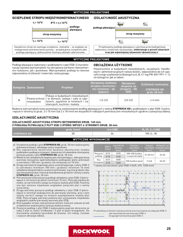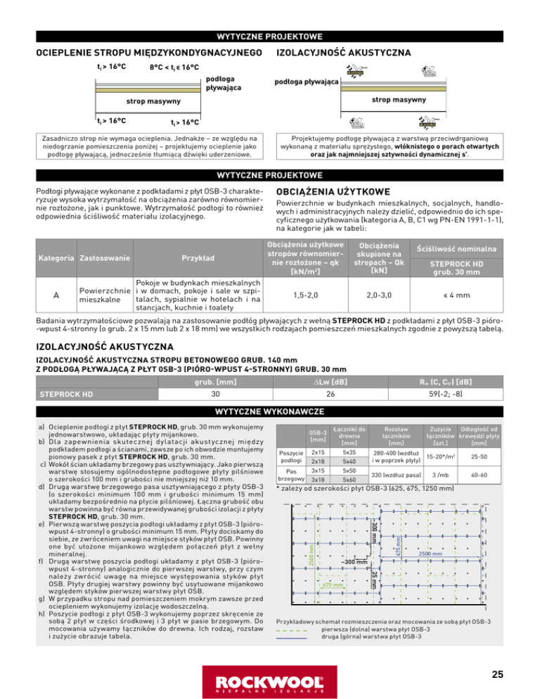 WYTYCZNE PROJEKTOWE OCIEPLENIE STROPU MIĘDZYKONDYGNACYJNEGO ti > 16°C IZOLACYJNOŚĆ AKUSTYCZNA 8°C < ti ≤ 16°C podłoga pływająca podłoga pływająca strop masywny strop masywny ti > 16°C ti > 16°C Zasadniczo strop nie wymaga ocieplenia. Jednakże – ze względu na niedogrzanie pomieszczenia poniżej – projektujemy ocieplenie jako podłogę pływającą, jednocześnie tłumiącą dźwięki uderzeniowe. Projektujemy podłogę pływającą z warstwą przeciwdrganiową wykonaną z materiału sprężystego, włóknistego o porach otwartych oraz jak najmniejszej sztywności dynamicznej s’. WYTYCZNE PROJEKTOWE Podłogi pływające wykonane z podkładami z płyt OSB-3 charakteryzuje wysoka wytrzymałość na obciążenia zarówno równomiernie rozłożone, jak i punktowe. Wytrzymałość podłogi to również odpowiednia ściśliwość materiału izolacyjnego. Kategoria Zastosowanie A Przykład Pokoje w budynkach mieszkalnych Powierzchnie i w domach, pokoje i sale w szpitalach, sypialnie w hotelach i na mieszkalne stancjach, kuchnie i toalety OBCIĄŻENIA UŻYTKOWE Powierzchnie w budynkach mieszkalnych, socjalnych, handlowych i administracyjnych należy dzielić, odpowiednio do ich specyficznego użytkowania (kategoria A, B, C1 wg PN-EN 1991-1-1), na kategorie jak w tabeli: Obciążenia użytkowe stropów równomiernie rozłożone – qk [kN/m2] Obciążenia skupione na stropach – Qk [kN] Ściśliwość nominalna 1,5-2,0 2,0-3,0 ≤ 4 mm STEPROCK HD grub. 30 mm Badania wytrzymałościowe pozwalają na zastosowanie podłóg pływających z wełną STEPROCK HD z podkładami z płyt OSB-3 pióro-wpust 4-stronny (o grub. 2 x 15 mm lub 2 x 18 mm) we wszystkich rodzajach pomieszczeń mieszkalnych zgodnie z powyższą tabelą. IZOLACYJNOŚĆ AKUSTYCZNA IZOLACYJNOŚĆ AKUSTYCZNA STROPU BETONOWEGO GRUB. 140 mm Z PODŁOGĄ PŁYWAJĄCĄ Z PŁYT 0SB-3 (PIÓRO-WPUST 4-STRONNY) GRUB. 30 mm STEPROCK HD grub. [mm] Lw [dB] Rw (C, Ctr) [dB] 30 26 59(-2; -8) WYTYCZNE WYKONAWCZE 0SB-3 [mm] Poszycie podłogi Pas brzegowy Łączniki do drewna [mm] 2x15 5x35 2x18 5x40 3x15 5x50 3x18 5x60 Rozstaw łączników [mm] Zużycie Odległość od łączników krawędzi płyty [szt.] [mm] 280-400 (wzdłuż 15-20*/m2 i w poprzek płyty) 25-50 330 (wzdłuż pasa) 40-60 3 /mb 2500 mm 675 mm * zależy od szerokości płyt OSB-3 (625, 675, 1250 mm) ~300 mm 2500 mm ~300 mm 675 mm 25 mm a) Ocieplenie podłogi z płyt STEPROCK HD, grub. 30 mm wykonujemy jednowarstwowo, układając płyty mijankowo. b) Dla zapewnienia skutecznej dylatacji akust ycznej międz y podkładem podłogi a ścianami, zawsze po ich obwodzie montujemy pionowy pasek z płyt STEPROCK HD, grub. 30 mm. c) Wokół ścian układamy brzegowy pas usztywniający. Jako pierwszą warstwę stosujemy ogólnodostępne podłogowe płyty pilśniowe o szerokości 100 mm i grubości nie mniejszej niż 10 mm. d) Drugą warstwę brzegowego pasa usztywniającego z płyty OSB-3 (o szerokości minimum 100 mm i grubości minimum 15 mm) układamy bezpośrednio na płycie pilśniowej. Łączna grubość obu warstw powinna być równa przewidywanej grubości izolacji z płyty STEPROCK HD, grub. 30 mm. e) Pierwszą warstwę poszycia podłogi układamy z płyt OSB-3 (piórowpust 4-stronny) o grubości minimum 15 mm. Płyty dociskamy do siebie, ze zwróceniem uwagi na miejsce styków płyt OSB. Powinny one być ułożone mijankowo względem połączeń płyt z wełny mineralnej. f) Drugą warstwę poszycia podłogi układamy z płyt OSB-3 (piórowpust 4-stronny) analogicznie do pierwszej warstwy, przy czym należy zwrócić uwagę na miejsce występowania styków płyt OSB. Płyty drugiej warstwy powinny być usytuowane mijankowo względem styków pierwszej warstwy płyt OSB. g) W przypadku stropu nad pomieszczeniem mokrym zawsze przed ociepleniem wykonujemy izolację wodoszczelną. h) Poszycie podłogi z płyt OSB-3 wykonujemy poprzez skręcenie ze sobą 2 płyt w części środkowej i 3 płyt w pasie brzegowym. Do mocowania używamy łączników do drewna. Ich rodzaj, rozstaw i zużycie obrazuje tabela. Przykładowy schemat rozmieszczenia oraz mocowania ze sobą płyt OSB-3 pierwsza (dolna) warstwa płyt OSB-3 druga (górna) warstwa płyt OSB-3 25