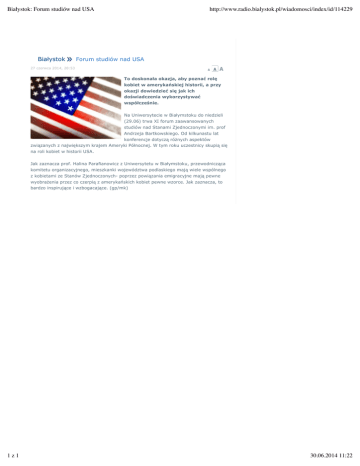 Białystok: Forum studiów nad USA Białystok http://www.radio.bialystok.pl/wiadomosci/index/id/114229 Forum studiów nad USA 27 czerwca 2014, 20:53 To doskonała okazja, aby poznać rolę kobiet w amerykańskiej historii, a przy okazji dowiedzieć się jak ich doświadczenia wykorzystywać współcześnie. Na Uniwersytecie w Białymstoku do niedzieli (29.06) trwa XI forum zaawansowanych studiów nad Stanami Zjednoczonymi im. prof Andrzeja Bartkowskiego. Od kilkunastu lat konferencje dotyczą różnych aspektów związanych z największym krajem Ameryki Północnej. W tym roku uczestnicy skupią się na roli kobiet w historii USA. Jak zaznacza prof. Halina Parafianowicz z Uniwersytetu w Białymstoku, przewodnicząca komitetu organizacyjnego, mieszkanki województwa podlaskiego mają wiele wspólnego z kobietami ze Stanów Zjednoczonych- poprzez powiązania emigracyjne mają pewne wyobrażenia przez co czerpią z amerykańskich kobiet pewne wzorce. Jak zaznacza, to bardzo inspirujące i wzbogacające. (gp/mk) 1z1 30.06.2014 11:22