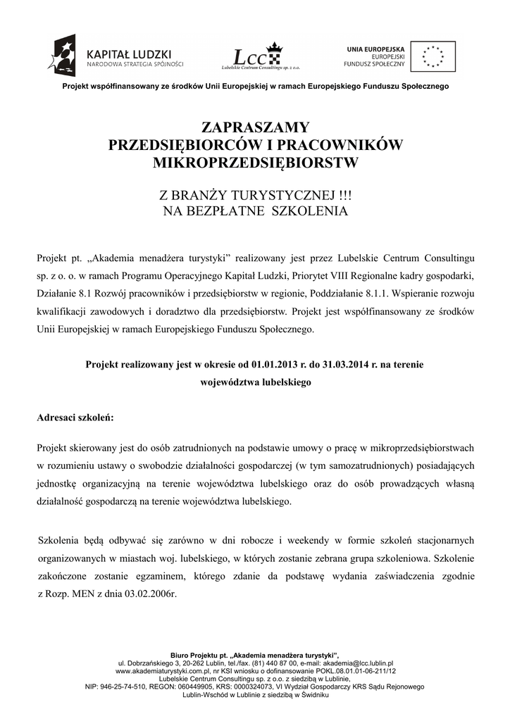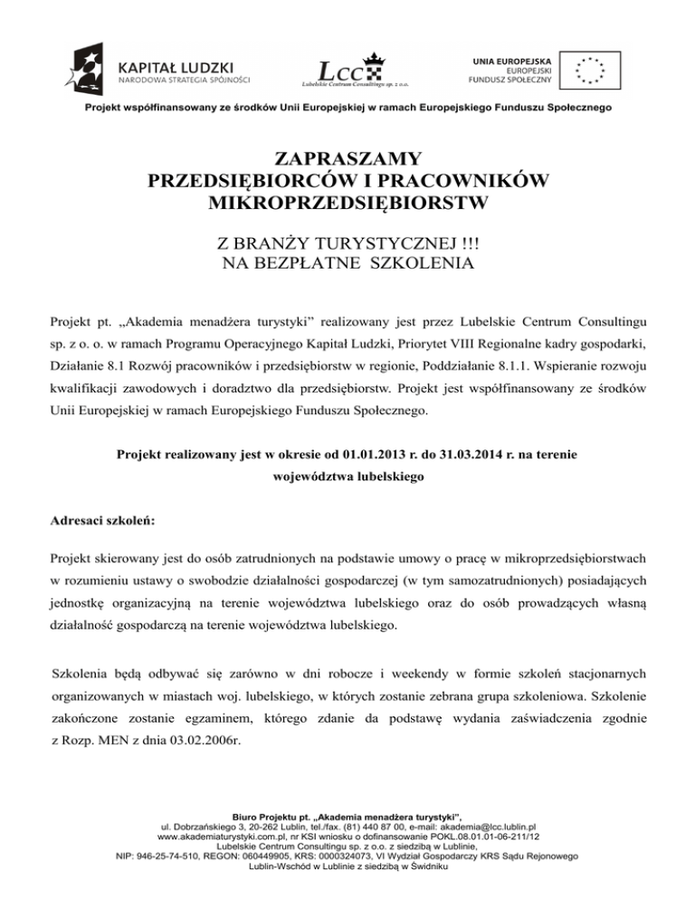 Projekt współfinansowany ze środków Unii Europejskiej w ramach Europejskiego Funduszu Społecznego ZAPRASZAMY PRZEDSIĘBIORCÓW I PRACOWNIKÓW MIKROPRZEDSIĘBIORSTW Z BRANŻY TURYSTYCZNEJ !!! NA BEZPŁATNE SZKOLENIA Projekt pt. „Akademia menadżera turystyki” realizowany jest przez Lubelskie Centrum Consultingu sp. z o. o. w ramach Programu Operacyjnego Kapitał Ludzki, Priorytet VIII Regionalne kadry gospodarki, Działanie 8.1 Rozwój pracowników i przedsiębiorstw w regionie, Poddziałanie 8.1.1. Wspieranie rozwoju kwalifikacji zawodowych i doradztwo dla przedsiębiorstw. Projekt jest współfinansowany ze środków Unii Europejskiej w ramach Europejskiego Funduszu Społecznego. Projekt realizowany jest w okresie od 01.01.2013 r. do 31.03.2014 r. na terenie województwa lubelskiego Adresaci szkoleń: Projekt skierowany jest do osób zatrudnionych na podstawie umowy o pracę w mikroprzedsiębiorstwach w rozumieniu ustawy o swobodzie działalności gospodarczej (w tym samozatrudnionych) posiadających jednostkę organizacyjną na terenie województwa lubelskiego oraz do osób prowadzących własną działalność gospodarczą na terenie województwa lubelskiego. Szkolenia będą odbywać się zarówno w dni robocze i weekendy w formie szkoleń stacjonarnych organizowanych w miastach woj. lubelskiego, w których zostanie zebrana grupa szkoleniowa. Szkolenie zakończone zostanie egzaminem, którego zdanie da podstawę wydania zaświadczenia zgodnie z Rozp. MEN z dnia 03.02.2006r. Biuro Projektu pt. „Akademia menadżera turystyki”, ul. Dobrzańskiego 3, 20-262 Lublin, tel./fax. (81) 440 87 00, e-mail: [email protected] www.akademiaturystyki.com.pl, nr KSI wniosku o dofinansowanie POKL.08.01.01-06-211/12 Lubelskie Centrum Consultingu sp. z o.o. z siedzibą w Lublinie, NIP: 946-25-74-510, REGON: 060449905, KRS: 0000324073, VI Wydział Gospodarczy KRS Sądu Rejonowego Lublin-Wschód w Lublinie z siedzibą w Świdniku Projekt współfinansowany ze środków Unii Europejskiej w ramach Europejskiego Funduszu Społecznego Usługi w ramach projektu: 1. SZKOLENIA MODUŁOWE W ramach zadania przewidziano 4 moduły szkoleniowe. W ramach projektu uczestnicy skorzystają z zajęć organizowanych w ramach wszystkich 4 modułów. Każde szkolenie stanowi zamkniętą całość. Każdy uczestnik projektu skorzysta z 164 godzin szkoleniowych. Moduł I. Język obcy - angielski ( 100 godzin szkoleniowych) 8 grup * 10 osób Moduł II. Marketing i promocja w turystyce ( 40 godzin szkoleniowych) 8 grup * 10 osób Moduł III. Ekologia w turystyce ( 8 godzin szkoleniowych) 8 grupy * 10 osób Moduł IV. Profesjonalna obsługa klienta w turystyce ( 16 godzin szkoleniowych) 8 grupy * 10 osób W ramach projektu zapewniamy: – – – – wysoko wykwalifikowaną kadrę trenerską profesjonalnie przygotowane materiały szkoleniowe, catering podczas szkoleń, zaświadczenia o ukończeniu szkolenia (zgodnie z rozporządzeniem MEN z dnia 3.02.2006 r. w sprawie uzyskiwania oraz uzupełniania przez osoby dorosłe wiedzy ogólnej, umiejętności i kwalifikacji zawodowych w formach pozaszkolnych). Biuro Projektu pt. „Akademia menadżera turystyki”, ul. Dobrzańskiego 3, 20-262 Lublin, tel./fax. (81) 440 87 00, e-mail: [email protected] www.akademiaturystyki.com.pl, nr KSI wniosku o dofinansowanie POKL.08.01.01-06-211/12 Lubelskie Centrum Consultingu sp. z o.o. z siedzibą w Lublinie, NIP: 946-25-74-510, REGON: 060449905, KRS: 0000324073, VI Wydział Gospodarczy KRS Sądu Rejonowego Lublin-Wschód w Lublinie z siedzibą w Świdniku Projekt współfinansowany ze środków Unii Europejskiej w ramach Europejskiego Funduszu Społecznego KONTAKT Biuro projektu pt.„ Akademia menadżera turystyki” ul. Dobrzańskiego 3 20-262 Lublin tel. (81) 440 87 00 kom. 791 222 183 email: [email protected] strona: www.akademiaturystyki.com.pl Biuro Projektu czynne: poniedziałek – piątek: od 8:00 do 16:00 Biuro Projektu pt. „Akademia menadżera turystyki”, ul. Dobrzańskiego 3, 20-262 Lublin, tel./fax. (81) 440 87 00, e-mail: [email protected] www.akademiaturystyki.com.pl, nr KSI wniosku o dofinansowanie POKL.08.01.01-06-211/12 Lubelskie Centrum Consultingu sp. z o.o. z siedzibą w Lublinie, NIP: 946-25-74-510, REGON: 060449905, KRS: 0000324073, VI Wydział Gospodarczy KRS Sądu Rejonowego Lublin-Wschód w Lublinie z siedzibą w Świdniku