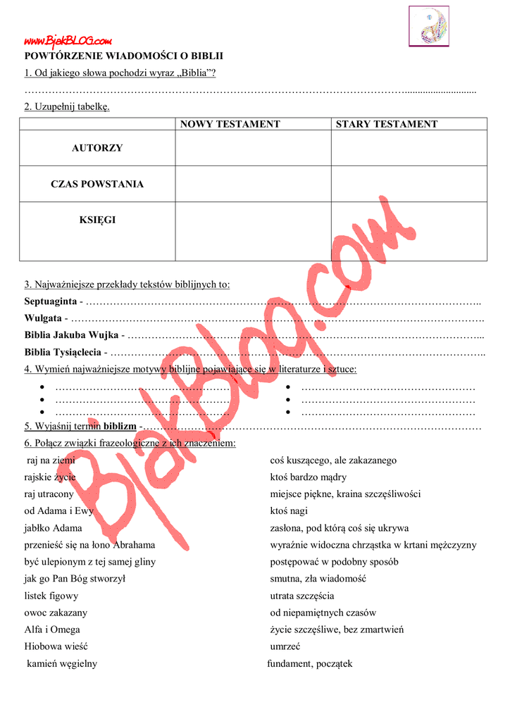 www.BjakBLOG.com POWTÓRZENIE WIADOMOŚCI O BIBLII 1. Od jakiego słowa pochodzi wyraz „Biblia”? …………………………………………………………………………………………………............................ 2. Uzupełnij tabelkę. NOWY TESTAMENT STARY TESTAMENT AUTORZY CZAS POWSTANIA KSIĘGI 3. Najważniejsze przekłady tekstów biblijnych to: Septuaginta - …………………………………………………………………………………………………….. Wulgata - …………………………………………………………………………………………………………. Biblia Jakuba Wujka - …………………………………………………………………………………………... Biblia Tysiąclecia - ……………………………………………………………………………………………….. 4. Wymień najważniejsze motywy biblijne pojawiające się w literaturze i sztuce: …………………………………………… …………………………………………… …………………………………………… …………………………………………… …………………………………………… …………………………………………… 5. Wyjaśnij termin biblizm -……………………………………………………………………………………… 6. Połącz związki frazeologiczne z ich znaczeniem: raj na ziemi coś kuszącego, ale zakazanego rajskie życie ktoś bardzo mądry raj utracony miejsce piękne, kraina szczęśliwości od Adama i Ewy ktoś nagi jabłko Adama zasłona, pod którą coś się ukrywa przenieść się na łono Abrahama wyraźnie widoczna chrząstka w krtani mężczyzny być ulepionym z tej samej gliny postępować w podobny sposób jak go Pan Bóg stworzył smutna, zła wiadomość listek figowy utrata szczęścia owoc zakazany od niepamiętnych czasów Alfa i Omega życie szczęśliwe, bez zmartwień Hiobowa wieść umrzeć kamień węgielny fundament, początek