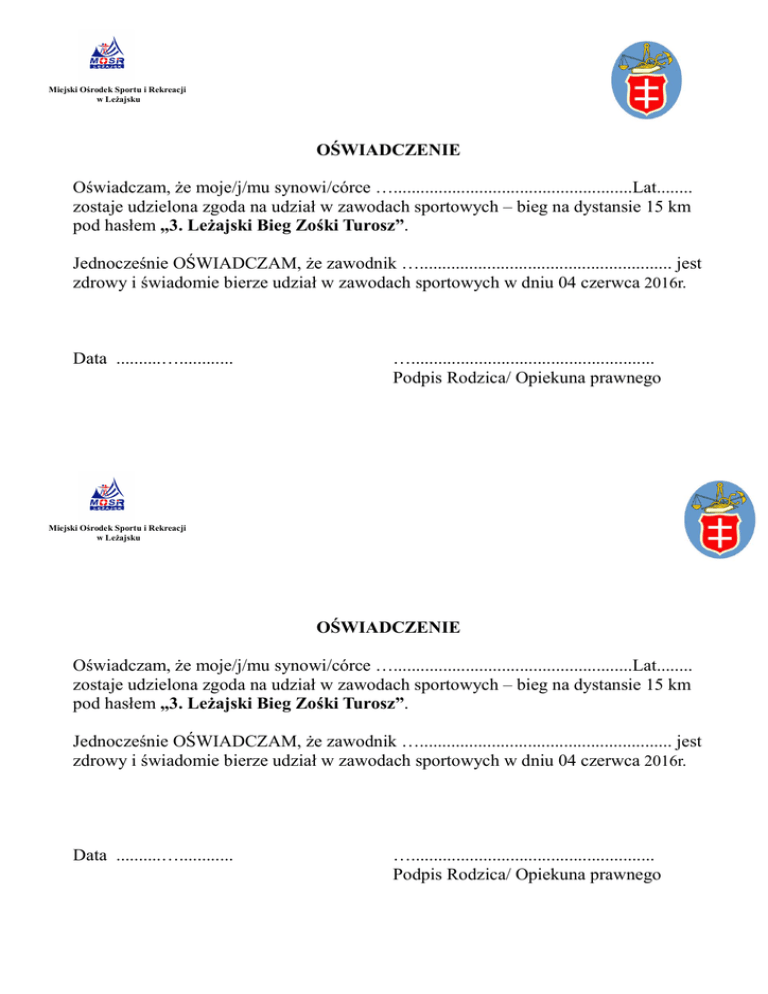 Miejski Ośrodek Sportu i Rekreacji w Leżajsku OŚWIADCZENIE Oświadczam, że moje/j/mu synowi/córce ….....................................................Lat........ zostaje udzielona zgoda na udział w zawodach sportowych – bieg na dystansie 15 km pod hasłem „3. Leżajski Bieg Zośki Turosz”. Jednocześnie OŚWIADCZAM, że zawodnik …........................................................ jest zdrowy i świadomie bierze udział w zawodach sportowych w dniu 04 czerwca 2016r. Data ..........…............ …...................................................... Podpis Rodzica/ Opiekuna prawnego Miejski Ośrodek Sportu i Rekreacji w Leżajsku OŚWIADCZENIE Oświadczam, że moje/j/mu synowi/córce ….....................................................Lat........ zostaje udzielona zgoda na udział w zawodach sportowych – bieg na dystansie 15 km pod hasłem „3. Leżajski Bieg Zośki Turosz”. Jednocześnie OŚWIADCZAM, że zawodnik …........................................................ jest zdrowy i świadomie bierze udział w zawodach sportowych w dniu 04 czerwca 2016r. Data ..........…............ …...................................................... Podpis Rodzica/ Opiekuna prawnego
