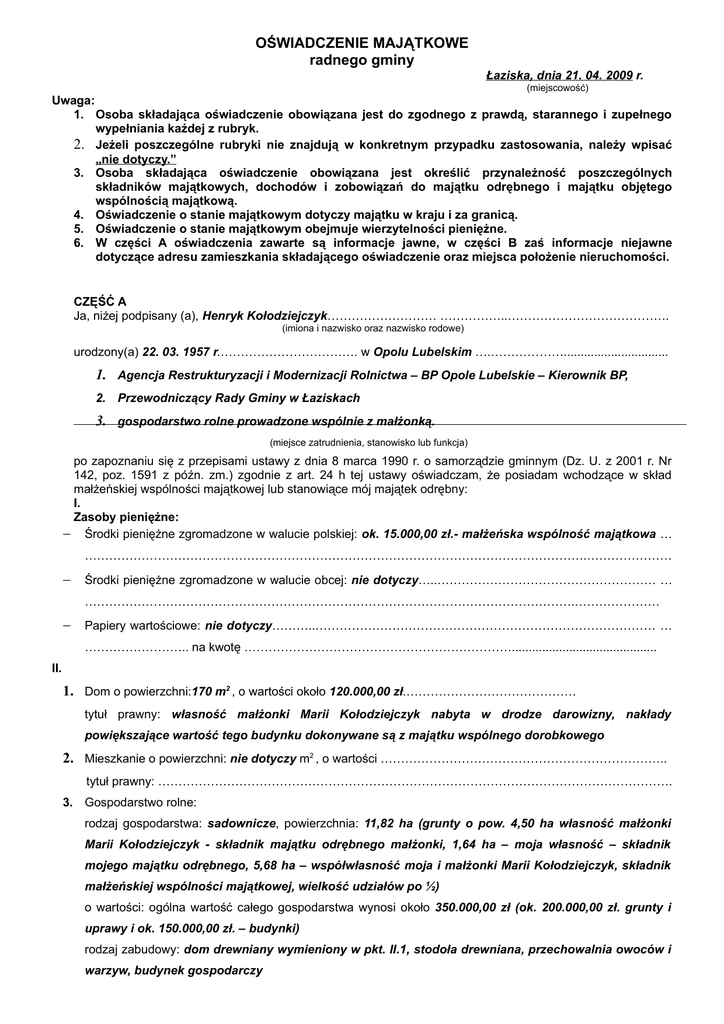 OŚWIADCZENIE MAJĄTKOWE radnego gminy Łaziska, dnia 21. 04. 2009 r. (miejscowość) Uwaga: 1. Osoba składająca oświadczenie obowiązana jest do zgodnego z prawdą, starannego i zupełnego wypełniania każdej z rubryk. 2. Jeżeli poszczególne rubryki nie znajdują w konkretnym przypadku zastosowania, należy wpisać „nie dotyczy.” 3. Osoba składająca oświadczenie obowiązana jest określić przynależność poszczególnych składników majątkowych, dochodów i zobowiązań do majątku odrębnego i majątku objętego wspólnością majątkową. 4. Oświadczenie o stanie majątkowym dotyczy majątku w kraju i za granicą. 5. Oświadczenie o stanie majątkowym obejmuje wierzytelności pieniężne. 6. W części A oświadczenia zawarte są informacje jawne, w części B zaś informacje niejawne dotyczące adresu zamieszkania składającego oświadczenie oraz miejsca położenie nieruchomości. CZĘŚĆ A Ja, niżej podpisany (a), Henryk Kołodziejczyk……………………… ……………..…………………………………. (imiona i nazwisko oraz nazwisko rodowe) urodzony(a) 22. 03. 1957 r.……………………………. w Opolu Lubelskim ….………………............................... 1. Agencja Restrukturyzacji i Modernizacji Rolnictwa – BP Opole Lubelskie – Kierownik BP, 2. Przewodniczący Rady Gminy w Łaziskach 3. gospodarstwo rolne prowadzone wspólnie z małżonką. (miejsce zatrudnienia, stanowisko lub funkcja) po zapoznaniu się z przepisami ustawy z dnia 8 marca 1990 r. o samorządzie gminnym (Dz. U. z 2001 r. Nr 142, poz. 1591 z późn. zm.) zgodnie z art. 24 h tej ustawy oświadczam, że posiadam wchodzące w skład małżeńskiej wspólności majątkowej lub stanowiące mój majątek odrębny: I. Zasoby pieniężne: − Środki pieniężne zgromadzone w walucie polskiej: ok. 15.000,00 zł.- małżeńska wspólność majątkowa … …………………………………………………………………………………………………………….………………… − Środki pieniężne zgromadzone w walucie obcej: nie dotyczy…..……………………………………………… … ………………………………………………………………………………………………………….………………… − Papiery wartościowe: nie dotyczy………..………………………………………………………………………… … …………………….. na kwotę …………………………………………………………........................................... II. 1. Dom o powierzchni:170 m2 , o wartości około 120.000,00 zł.…………………………………… tytuł prawny: własność małżonki Marii Kołodziejczyk nabyta w drodze darowizny, nakłady powiększające wartość tego budynku dokonywane są z majątku wspólnego dorobkowego 2. Mieszkanie o powierzchni: nie dotyczy m2 , o wartości …………………………………………………………….. tytuł prawny: ………………………………………………………………………………………………………………. 3. Gospodarstwo rolne: rodzaj gospodarstwa: sadownicze, powierzchnia: 11,82 ha (grunty o pow. 4,50 ha własność małżonki Marii Kołodziejczyk - składnik majątku odrębnego małżonki, 1,64 ha – moja własność – składnik mojego majątku odrębnego, 5,68 ha – współwłasność moja i małżonki Marii Kołodziejczyk, składnik małżeńskiej wspólności majątkowej, wielkość udziałów po ½) o wartości: ogólna wartość całego gospodarstwa wynosi około 350.000,00 zł (ok. 200.000,00 zł. grunty i uprawy i ok. 150.000,00 zł. – budynki) rodzaj zabudowy: dom drewniany wymieniony w pkt. II.1, stodoła drewniana, przechowalnia owoców i warzyw, budynek gospodarczy tytuł prawny: budynki wymienione wyżej znajdują się na działce gruntu stanowiącej własność małżonki – Marii Kołodziejczyk Z tego tytułu osiągnąłem(ęłam) do dnia 31. 12. 2008 r. przychód i dochód w wysokości: 22.112 zł. przychód i ok. 20.000 strata (małżeńska wspólność majątkowa)…………………………. 4. Inne nieruchomości: powierzchnia: nie dotyczy………………………………………………………………………………………………. ………………………………………………………………………………………………………………………………. o wartości: nie dotyczy …………………………………………………………………………………………………. ………………………………………………………………………………………………………………………………. tytuł prawny: nie dotyczy ……………………………………………………………………………………………….. ………………………………………………………………………………………………………………………………. III. 1. Posiadam udziały w spółkach handlowych z udziałem gminnych osób prawnych lub przedsiębiorców, w których uczestniczą takie osoby – należy podać liczbę i emitenta udziałów. ………………………………………………… nie dotyczy …….……………………….…………………………….. ……………………………………………………………………………………………………………………………… ……………………………………………………………………………………………………………………………… udziały te stanowią pakiet większy niż 10 % udziałów w spółce: nie dotyczy ……………………………………. ………………………………………………………………………………………………………………………………. Z tego tytułu