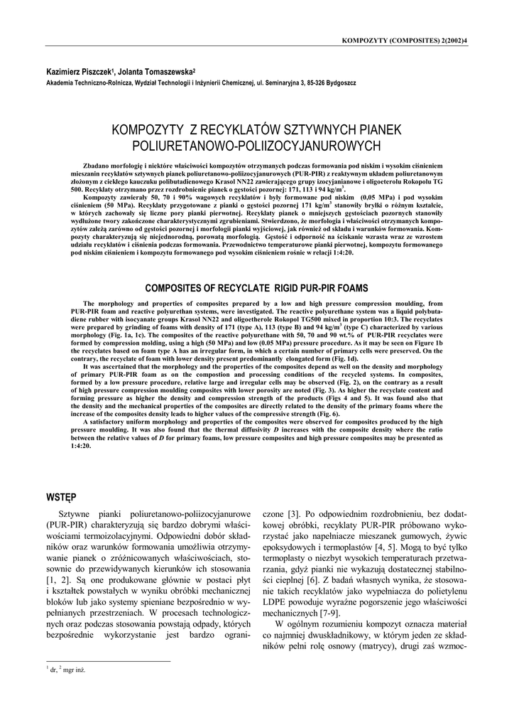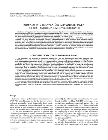 KOMPOZYTY (COMPOSITES) 2(2002)4 Kazimierz Piszczek1, Jolanta Tomaszewska2 Akademia Techniczno-Rolnicza, Wydział Technologii i Inżynierii Chemicznej, ul. Seminaryjna 3, 85-326 Bydgoszcz KOMPOZYTY Z RECYKLATÓW SZTYWNYCH PIANEK POLIURETANOWO-POLIIZOCYJANUROWYCH Zbadano morfologię i niektóre właściwości kompozytów otrzymanych podczas formowania pod niskim i wysokim ciśnieniem mieszanin recyklatów sztywnych pianek poliuretanowo-poliizocyjanurowych (PUR-PIR) z reaktywnym układem poliuretanowym złożonym z ciekłego kauczuku polibutadienowego Krasol NN22 zawierającego grupy izocyjanianowe i oligoeterolu Rokopolu TG 500. Recyklaty otrzymano przez rozdrobnienie pianek o gęstości pozornej: 171, 113 i 94 kg/m3. Kompozyty zawierały 50, 70 i 90% wagowych recyklatów i były formowane pod niskim (0,05 MPa) i pod wysokim ciśnieniem (50 MPa). Recyklaty przygotowane z pianki o gęstości pozornej 171 kg/m3 stanowiły bryłki o różnym kształcie, w których zachowały się liczne pory pianki pierwotnej. Recyklaty pianek o mniejszych gęstościach pozornych stanowiły wydłużone twory zakończone charakterystycznymi zgrubieniami. Stwierdzono, że morfologia i właściwości otrzymanych kompozytów zależą zarówno od gęstości pozornej i morfologii pianki wyjściowej, jak również od składu i warunków formowania. Kompozyty charakteryzują się niejednorodną, porowatą morfologią. Gęstość i odporność na ściskanie wzrasta wraz ze wzrostem udziału recyklatów i ciśnienia podczas formowania. Przewodnictwo temperaturowe pianki pierwotnej, kompozytu formowanego pod niskim ciśnieniem i kompozytu formowanego pod wysokim ciśnieniem rośnie w relacji 1:4:20. COMPOSITES OF RECYCLATE RIGID PUR-PIR FOAMS The morphology and properties of composites prepared by a low and high pressure compression moulding, from PUR-PIR foam and reactive polyurethan systems, were investigated. The reactive polyurethane system was a liquid polybutadiene rubber with isocyanate groups Krasol NN22 and oligoetherole Rokopol TG500 mixed in proportion 10:3. The recyclates were prepared by grinding of foams with density of 171 (type A), 113 (type B) and 94 kg/m3 (type C) characterized by various morphology (Fig. 1a, 1c). The composites of the reactive polyurethane with 50, 70 and 90 wt.% of PUR-PIR recyclates were formed by compression molding, using a high (50 MPa) and low (0.05 MPa) pressure procedure. As it may be seen on Figure 1b the recyclates based on foam type A has an irregular form, in which a certain number of primary cells were preserved. On the contrary, the recyclate of foam with lower density present predominantly elongated form (Fig. 1d). It was ascertained that the morphology and the properties of the composites depend as well on the density and morphology of primary PUR-PIR foam as on the compostion and processing conditions of the recycled systems. In composites, formed by a low pressure procedure, relative large and irregular cells may be observed (Fig. 2), on the contrary as a result of high pressure compression moulding composites with lower porosity are noted (Fig. 3). As higher the recyclate content and forming pressure as higher the density and compression strength of the products (Figs 4 and 5). It was found also that the density and the mechanical properties of the composites are directly related to the density of the primary foams where the increase of the composites density leads to higher values of the compressive strength (Fig. 6). A satisfactory uniform morphology and properties of the composites were observed for composites produced by the high pressure moulding. It was also found that the thermal diffusivity D increases with the composite density where the ratio between the relative values of D for primary foams, low pressure composites and high pressure composites may be presented as 1:4:20. WSTĘP Sztywne pianki poliuretanowo-poliizocyjanurowe (PUR-PIR) charakteryzują się bardzo dobrymi właściwościami termoizolacyjnymi. Odpowiedni dobór składników oraz warunków formowania umożliwia otrzymywanie pianek o zróżnicowanych właściwościach, stosownie do przewidywanych kierunków ich stosowania [1, 2]. Są one produkowane głównie w postaci płyt i kształtek powstałych w wyniku obróbki mechanicznej bloków lub jako systemy spieniane bezpośrednio w wypełnianych przestrzeniach. W procesach technologicznych oraz podczas stosowania powstają odpady, których bezpośrednie wykorzystanie jest bardzo ograni- 1 dr, 2 mgr inż. czone [3]. Po odpowiednim rozdrobnieniu, bez dodatkowej obróbki, recyklaty PUR-PIR próbowano wykorzystać jako napełniacze mieszanek gumowych, żywic epoksydowych i termoplastów [4, 5]. Mogą to być tylko termoplasty o niezbyt wysokich temperaturach przetwarzania, gdyż pianki nie wykazują dostatecznej stabilności cieplnej [6]. Z badań własnych wynika, że stosowanie takich recyklatów jako wypełniacza do polietylenu LDPE powoduje wyraźne pogorszenie jego właściwości mechanicznych [7-9]. W ogólnym rozumieniu kompozyt oznacza materiał co najmniej dwuskładnikowy, w którym jeden ze składników pełni rolę osnowy (matrycy), drugi zaś wzmoc- Kompozyty z recyklatów sztywnych pianek poliuretanowo-poliizocyjanurowych nienia [10, 11]. Składnika tworzącego wzmocnienie nie można w zasadzie stosować samodzielnie. Dopiero po jego umiejętnym połączeniu z drugim składnikiem razem tworzą materiał o określonych właściwościach. W przypadku recyklatów sztywnych pianek PUR-PIR trudno oczekiwać efektu wzmocnienia, jednak ich połączenie z innym polimerem może doprowadzić do utworzenia materiału o korzystnych właściwościach. Stosunkowo duże koszty wytwarzania pianek PUR-PIR oraz duża objętość odpadów przy ich niewielkiej gęstości powodują, że najgorszym sposobem utylizacji jest ich składowanie. Uwzględniając powyższe argumenty podjęto badania nad wykorzystaniem rozdrobnionych odpadów sztywnych pianek PUR-PIR