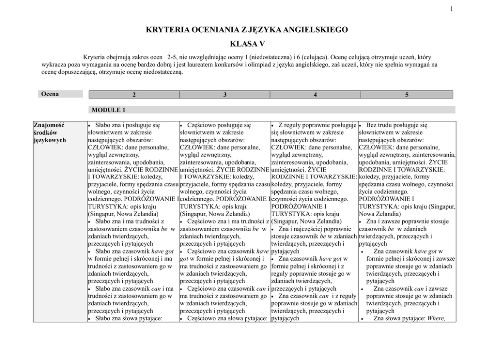 KRYTERIA OCENIANIA Z JĘZYKA ANGIELSKIEGO KLASA V