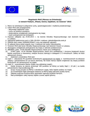 Regulamin MnO (Marszu na Orientację) w ramach Festynu „Pieszo, konno, kajakiem, na rowerze” 2015 1. Marsz na orientację to połączenie ruchu, spostrzegawczości i myślenia przestrzennego. 2. Celem MnO jest propagowanie: - aktywnego spędzania czasu - ruchu na świeżym powietrzu - doskonalenia umiejętności posługiwania się mapą - nauki posługiwania się kompasem 3. Impreza odbędzie się 24.05.2015 r. na terenie Ośrodka Wypoczynkowego nad Jeziorem Dużym w Lubaszu. 4. Zgłoszenia telefoniczne pod nr 509-159-954 i mailowe: [email protected] 5. UWAGA ilość miejsc OGRANICZONA!!! Liczy się kolejność zgłoszeń. 6. W zabawie biorą udział zespoły max 3 osobowe lub osoby indywidualnie. 7. Terenem MnO jest teren Ośrodka Wypoczynkowego nad Jeziorem Dużym w Lubaszu. 8. Wymagana umiejętność posługiwania się mapą w zakresie podstawowym. 9. ZBIÓRKA: godz. 14:00 Ośrodek Wypoczynkowy /teren przy amfiteatrze/. 10. START godz. 14:30 Ośrodek Wypoczynkowy /teren przy amfiteatrze/: I drużyna (kolejność drużyn będzie wyłoniona w losowaniu), kolejne drużyny startują w odstępach 2-3 minutowych. Zależy od ilości zgłoszonych drużyn. 11. Zadaniem uczestników MnO jest: a) część I - odszukanie PK (punktów kontrolnych) zaznaczonych na mapie, a rozmieszczonych na obszarze zabawy i potwierdzenie ich na karcie startowej. Na trasie marszu będzie znajdować się więcej punktów kontrolnych niż zaznaczonych na mapie b) część II – poszukiwanie Skarbu Wójta (wg oddzielnej mapki). 12. Każda drużyna na starcie otrzymuje 100 punktów od której za każdy błąd (- 10 pkt ) za każde potwierdzenie nieprawidłowego PK . 13. Grupy muszą przyjść na METĘ w określonym czasie, który będzie podany na mapie. 14. Za wcześniejsze bądź późniejsze dotarcie na METĘ będą naliczane punkty karne. 15. Zabawę wygrywa drużyna która zgromadzi najmniej punktów karnych. 16. Nad przebiegiem całej imprezy będzie czuwać sędzia główny.