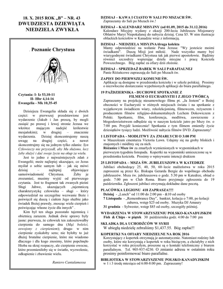 18. X. 2015 ROK „B” – NR. 43 DWUDZIESTA DZIEWIĄTA NIEDZIELA ZWYKŁA . Poznanie Chrystusa DZISIAJ – KAWA I CIASTO W SALI PO MSZACH ŚW. Zapraszamy do Sali po Mszach św.! DZISIAJ – KALENDARZ MISYJNY (od 01.09, 2015 do 31.12.2016) Kalendarz Misyjny wydany z okazji 200-lecia Jubileuszu Misjonarzy Oblatów Maryi Niepokalanej do nabycia dzisiaj. Cena $5. W nim ilustracje oblackich kościołów w Kanadzie wraz z informacją. DZISIAJ – NIEDZIELA MISYJNA/druga kolekta Mamy odpowiedzieć na wołanie Pana Jezusa: "Wy jesteście moimi świadkami". Duszą Misji jest miłość. Nade wszystko mamy być wiarygodnymi świadkami Chrystusa tak jak pierwsi apostołowie. Bądźmy również szczodrzy wspierając dzieła misyjne i pracę Kościoła Powszechnego. Bóg zapłać za ofiary dziś złożone. DZISIAJ – SPRZEDAŻ BABEK W SALI PARAFIALNEJ Panie Różańcowe zapraszają do Sali po Mszach św. ZAPISY DO PIERWSZEJ KOMUNII ŚW. Aplikacje są dostępne w przedsionku kościoła i w szkole polskiej. Prosimy o niezwłoczne dostarczanie wypełnionych aplikacji do biura parafialnego. Czytania: I- Iz 53,10-11 II- Hbr 4,14-16 Ewangelia - Mk 10,35-45 Dzisiejsza Ewangelia składa się z dwóch części: w pierwszej przedstawione jest wydarzenie (Jakub i Jan proszą, by mogli zasiąść po prawej i lewej stronie Jezusa we wkrótce mającym nadejść królestwie mesjańskim); w drugiej – znaczenie wydarzenia. Dzisiaj skoncentrujemy naszą uwagę na drugiej części, a nawet skoncentrujmy się na jednym tylko zdaniu: Syn Człowieczy nie przyszedł, aby Mu służono, lecz żeby służyć i dać swoje życie na okup za wielu. Jest to jedno z najważniejszych zdań z Ewangelii; może najlepiej ukazujące, co Jezus myślał o sobie samym lub – jak się mówi dzisiaj – najlepiej objawiające samoświadomość Chrystusa. Żeby je zrozumieć, musimy wyjść od pierwszego czytania. Jest to fragment tak zwanych pieśni Sługi Jahwe, ukazujących „tajemniczą charakterystykę człowieka – sługi – który odpowiedział na szczególne wezwanie Boże i poświęcił się duszą i ciałem Jego służbie jako świadek Bożej prawdy, znosząc wiele cierpień i poświęcając własne życie dla innych” . Kim był ten sługa pozostało tajemnicą i obietnicą zarazem. Jednak dwie sprawy były jasne: pierwsza, że człowiek ten zakosztowałby cierpienia do samego dna (Mąż boleści, oswojony z cierpieniem); druga- w nim cierpienie zyskałoby sens; nie byłoby to już dłużej brutalne cierpienie, które nie wiadomo dlaczego i dla kogo znosimy, które popchnęło Hioba na skraj rozpaczy, ale cierpienie owocne, które przemieniłoby się w światło, wyzwolenie, odkupienie i zbawienie wielu. Raniero Cantalamessa 19 PAŹDZIERNIKA - DUCHOWE SPOTKANIE Z FILMEM O EUCHARYSTII I Z JEGO TWÓRCĄ Zapraszamy na projekcję niesamowitego filmu pt. „Ja Jestem” o Bożej obecności w Eucharystii w różnych miejscach świata i na spotkanie z wyjątkowym świadkiem wiary, rekolekcjonistą, filmowcem, reżyserem i producentem filmów religijno-dokumentalnych Lechem Dokowiczem z Polski. Spotkanie, film, konferencja, modlitwa, zawierzenie z błogosławieństwem odbędzie się w naszym kościele jutro po Mszy św. o 7:00 pm. Przyjdź koniecznie! Spotkania z tym filmem zmieniły życie dziesiątków tysięcy ludzi. Możliwość nabycia filmów DVD. Zapraszamy! 1 LISTOPADA - MODLITWY ZA ZMARŁYCH O 3:00 PM w Mauzoleum cmentarza Victoria Lawn. Udajmy się na groby bliskich i znajomych i módlmy się za nich. Różaniec i Msze św za zmarłych wymienionych w wypominkach w pierwszym tygodniu listopada. Kopertki na wypominki umieszczone są w przedsionku kościoła. Prosimy o wpisywanie intencji drukiem 25 LISTOPADA – MSZA ŚW. JUBILEUSZOWA W KATEDRZE Jubilaci obchodzący 25, 40, 50, 60–lecie małżeństwa w roku 2015 zaproszeni są przez Ks. Biskupa Gerarda Bergie do wspólnego obchodu jubileuszów. Msza św. jubileuszowa o godz. 5:30 pm w Katedrze, obiad o godz. 7:00 pm w Club Roma. Biuro przyjmuje zgłoszenia do 19 października. Zgłoszeni jubilaci otrzymają dokładne dane pocztą. PLACÓWKA LEGIONU 418 ZAPRASZA!!!! Dzisiaj - „Lunch” od 11:00 do 2:00 pm - &10 od osoby 7 Listopada - „Remembrance Day”, bankiet, kolacja o 7:00, po kolacji zabawa, wstęp $25 od osoby. Muzyka DJ Amaury 31 grudnia - Sylwester, wstęp $85 od osoby, szczegóły później. WYDARZENIA W STOWARZYSZENIU POLSKO-KANADYJSKIM Fish & Chips - w piątek 30 października godz. 4:00 do 7:00 pm SKŁADKA DLA UCHODŹCÓW W SYRII W ubiegłą niedzielę zebraliśmy $1,437.55. Bóg zapłać!! KOPERTKI NA OFIARY NIEDZIELNE NA ROK 2016 Korzystający z kopertek otrzymają je automatycznie. Natomiast rodziny lub osoby, które nie korzystają z kopertek w roku bieżącym, a chciałyby z nich korzystać w roku przyszłym, proszone są o kontakt telefoniczny z biurem parafialnym. Tel. 905-937-4230. O zmianie adresu w ostatnim roku prosimy poinformować biuro parafialne. BIBLIOTEKA W STOWARZYSZENIU POLSKO-KANADYJSKIM w 1 i 3 środę miesiąca od 6:00-8:00 pm. Zapraszamy! INTENCJE MSZALNE ** MASS INTENTIONS 17. X. SOBOTA* SATURDAY 5:30 pm † Stanisława Kamińskiego 18. X. NIEDZIELA * SUNDAY 8:30 am Za Parafian żyjących i zmarłych 10:00 am † Józefa Szeląga i Stefanię Sanocką 11:30 am For † Henryka Napieraj - Żona z dziećmi - OMI Dzieci - Children with family 19. X. PONIEDZIAŁEK * MONDAY św. Jana i Izaaka i Towarzyszy 6:00 pm Nabożeństwo Różańcowe 6:30 pm † Zenobię i Wincentego Miękina - Córka z rodziną 20. X. WTOREK * TUESDAY 9:00 am O światło Ducha Świętego dla wnucząt - Babcia 21 X. ŚRODA * WEDNESDAY 6:00 pm Nabożeństwo Różańcowe 6:30 pm † Zbiorowa Msza. Św./Group Mass 22 X. CZWARTEK * THURSDAY św. Jana Pawła II 9:00 am † Rodziców Franciszka i Marię 23. X. PIĄTEK * FRIDAY 6:00 pm Nabożeństwo Różańcowe 6:30 pm † Antoniego Kubowicz 24. X. SOBOTA* SATURDAY 9:00 am W intencji syna Jacka - Córka Danuta - Żona z r