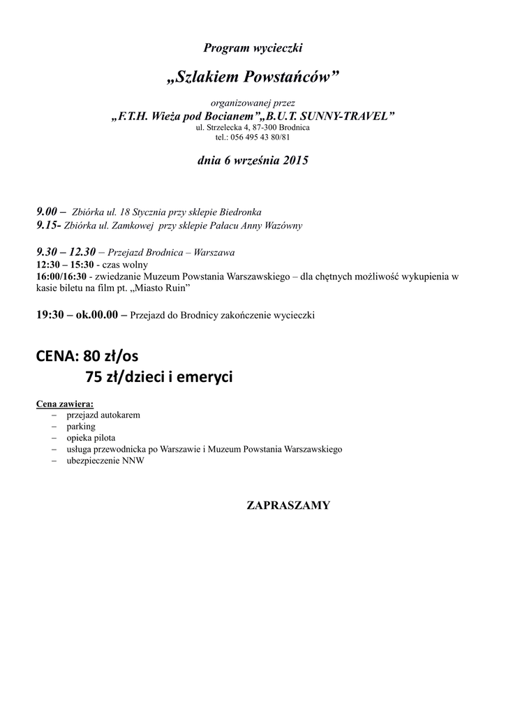 Program wycieczki „Szlakiem Powstańców” organizowanej przez „F.T.H. Wieża pod Bocianem”„B.U.T. SUNNY-TRAVEL” ul. Strzelecka 4, 87-300 Brodnica tel.: 056 495 43 80/81 dnia 6 września 2015 9.00 – Zbiórka ul. 18 Stycznia przy sklepie Biedronka 9.15- Zbiórka ul. Zamkowej przy sklepie Pałacu Anny Wazówny 9.30 – 12.30 – Przejazd Brodnica – Warszawa 12:30 – 15:30 - czas wolny 16:00/16:30 - zwiedzanie Muzeum Powstania Warszawskiego – dla chętnych możliwość wykupienia w kasie biletu na film pt. „Miasto Ruin” 19:30 – ok.00.00 – Przejazd do Brodnicy zakończenie wycieczki CENA: 80 zł/os 75 zł/dzieci i emeryci Cena zawiera: przejazd autokarem parking opieka pilota usługa przewodnicka po Warszawie i Muzeum Powstania Warszawskiego ubezpieczenie NNW ZAPRASZAMY Program wycieczki „Szlakiem Powstańców” organizowanej przez „F.T.H. Wieża pod Bocianem”„B.U.T. SUNNY-TRAVEL” ul. Strzelecka 4, 87-300 Brodnica tel.: 056 495 43 80/81 dnia 6 września 2015 9.00 – Zbiórka ul. 18 Stycznia przy sklepie Biedronka 9.15- Zbiórka ul. Zamkowej przy sklepie Pałacu Anny Wazówny 9.30 – 12.30 – Przejazd Brodnica – Warszawa 12:30 – 15:30 - czas wolny 16:00/16:30 - zwiedzanie Muzeum Powstania Warszawskiego – dla chętnych możliwość wykupienia w kasie biletu na film pt. „Miasto Ruin” 19:30 – ok.00.00 – Przejazd do Brodnicy zakończenie wycieczki Cena zawiera: przejazd autokarem parking opieka pilota usługa przewodnicka po Warszawie i Muzeum Powstania Warszawskiego ubezpieczenie NNW ZAPRASZAMY J