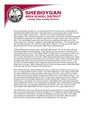 Koj tus menyuam tau raug xaiv los nrog koom lub teevxwm uas yuav los pab qhia tus menyuam kom paub nyeem ntawv losis pab kom nws txawj nyeem ntawv thiaj yuav los pab rau nws txojkev kawm ntawv. Lub teevxwm no hu ua ELI (Early Literacy Intervention). Kev loj hlob rau ntawm kev nyeem ntawv yob ib qhov tseemceeb rau hoob qib ib thiab ob, thiab yuav los muab kev pab rau nws txojkev kawm ntawv rau yam tom ntev. Cov zaj lub qhia (lesson) uas yuav kawm yuav muaj feem los pab rau nws kev nyeem ntawv, kev sau ntawv, thiab kev kawm lub suab tsiaj ntawv. Cov menyuam yuav mus sib ntsib nrog lawv tus xibfwb uas qhia ELI li 30 feeb , 4-5 zaus ntawm ib vastim nrog rau lawm kev kawm nyeem ntawv hauv lawm lub hoob kawm. Txhua hnub koj tus menyuam yuav nqa ib lub hnyab ntawv los tsev uas yuav muaj tej yam kawm thiab uasi nyob rau hauv. Lub hnyab, uas yuav tau nqa rov qab tuaj, yuav mauj ib phau ntawv hu ua “Take-Home Book”, ib daim ntawv uas xyuam sau ntawv, kev uasi hais txog nyeem ntawv, ib cov pib lus (word card), losis tej yam ntaub ntawv uas lawv ua hauv lub hoob txeevxwm ELI. Phau Take-Home Book yog ib phau ntawv luam uas koj tus menyuam tau nyeem hauv tsev kawm ntawv lawm. Koj tus menyuam nyeem tau phau ntawv laum rau lwm tus nyob hauv nej tsevneeg losis tus uas zov nws. Yog sawvdaw tsi khoom mloog, koj tus menyuam nyeem tau rau nws ib tus menyuam roj hmab uas nws nyiam. Qhov tseemceeb yog xav kom nws nyeem ntawv txhua hmo thiab xyaum tej yam uas nws kawm tau los nyeem ntawv. Hauv lub hnyab yuav muaj ib tshab ntawv rau cov niam txiv los pab tawm tswvyim rau kev yuav nyeem thiab sua ntawv uakev. Tej zaum tshab ntawv yuav muaj tej lub ntsiab lus rau koj thiab koj tus menyuam tham uakev txog, los tej kev yuav uasi li cas, thiab lwm lub tswvyim los pab koj tus menyuam loj hlob rau kev nyeem thiab sau ntawv. Tej yam uas muaj nyob hauv lub hnyav ntawv tsi yog ntawv nqa mus ua tom tsev tabsi yog los pab tawm tswvyim thiab txhawb ntxiv rau kev nyeem ntawv thiab los ua kom kev nyeem ntawv yog ib qhov kev lomzem rau nws. Koj thiab koj tus menyuam muaj feem ua tau tagnrho tej yam kev uasi uas muaj hauv lub hnyab, losis ua ntau npaum li nej muaj sijhawm rau xwb. Yog nej muaj sijhawm rau ib yam kev uasi xwb, yog zoo no thov nyeem phau Take-Home Book uas yuav los pab rau nws kev xyaum nyeem ntawv. Tus xibfwb ELI yuav txaus siab los teb nej tej lus nug txog lub teevxwm no thiab tej lus hais txog nej tus menyuam kev khoom rau qhov no. Tsi txhob ua siab deb thiab tuaj ntsib losis hu rau tsev kawm ntawv txog tej yam teebmeem uas koj muaj. Kev sib koomtes yuav pab koj tus menyuam kev loj hlob rau ntawm kev nyeem ntawv thiab sau ntawv kom los tau kev muaj yeej rau txojkev kawm ntaub ntawv yav tom ntej.