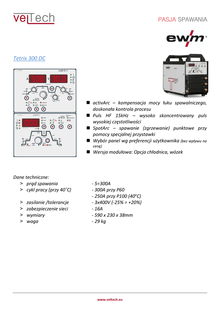 PASJA SPAWANIA Tetrix 300 DC activArc – kompensacja mocy łuku spawalniczego, doskonała kontrola procesu Puls HF 15kHz – wysoko skoncentrowany puls wysokiej częstotliwości SpotArc – spawanie (zgrzewanie) punktowe przy pomocy specjalnej przystawki Wybór panel wg preferencji użytkownika (bez wpływu na cenę) Wersja modułowa: Opcja chłodnica, wózek Dane techniczne: > prąd spawania > cykl pracy (przy 40˚C) > > > > zasilanie /tolerancje zabezpieczenie sieci wymiary waga - 5÷300A - 300A przy P60 - 250A przy P100 (40oC) - 3x400V (-25% ÷ +20%) - 16A - 590 x 230 x 38mm - 29 kg www.veltech.eu