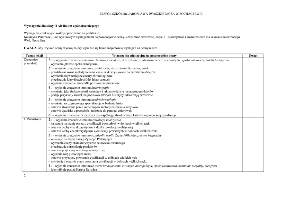 ZESPÓŁ SZKÓŁ im. JAROSŁAWA IWASZKIEWICZA W SOCHACZEWIE Wymagania dla klasy II AB liceum ogólnokształcącego Wymagania edukacyjne zostały opracowane na podstawie; Katarzyna Panimasz „Plan wynikowy z wymaganiami na poszczególne oceny. Zrozumieć przeszłość, część 1 – starożytność i średniowiecze dla zakresu rozszerzonego” Wyd. Nowa Era UWAGA; aby uzyskać ocenę wyższą należy wykazać się także znajomością wymagań na oceny niższe. Temat lekcji Zrozumieć przeszłość 1. Prehistoria 1 Wymagania edukacyjne na poszczególne oceny 2: – wyjaśnia znaczenie terminów: historia, kalendarz, starożytność, średniowiecze, czasy nowożytne, epoka najnowsza, źródło historyczne – wymienia główne epoki historyczne. 3: – wyjaśnia znaczenie terminów: prehistoria, starożytność klasyczna, antyk – przedstawia różne metody liczenia czasu wykorzystywane na przestrzeni dziejów – wymienia najważniejsze cezury chronologiczne – przedstawia klasyfikację źródeł historycznych – wyjaśnia znaczenie źródeł dla poznawania przeszłości. 4: – wyjaśnia znaczenie terminu historiografia – wyjaśnia, jaką funkcję pełnił kalendarz i jak zmieniał się na przestrzeni dziejów – podaje przykłady źródeł, na podstawie których historycy odtwarzają przeszłość. 5: – wyjaśnia znaczenie terminu dendrochronologia – wyjaśnia, na czym polega specjalizacja w badaniu historii – omawia stosowane przez archeologów metody datowania zabytków – omawia zjawiska z przeszłości należące do pamięci zbiorowej. 6: – wyjaśnia znaczenie przeszłości dla wspólnego dziedzictwa i kształtu współczesnej cywilizacji. 2: – wyjaśnia znaczenie terminu rewolucja neolityczna – wskazuje na mapie obszary cywilizacji powstałych w dolinach wielkich rzek – omawia cechy charakterystyczne i skutki rewolucji neolitycznej – omawia cechy charakterystyczne cywilizacji powstałych w dolinach wielkich rzek. 3: – wyjaśnia znaczenie terminów: paleolit, neolit, Żyzny Półksiężyc, system irygacyjny – wskazuje na mapie zasięg Żyznego Półksiężyca – wymienia cechy charakterystyczne człowieka rozumnego – przedstawia chronologię pradziejów – omawia przyczyny rewolucji neolitycznej – wyjaśnia rolę pierwszych miast – omawia przyczyny powstania cywilizacji w dolinach wielkich rzek – wymienia i omawia etapy powstania cywilizacji w dolinach wielkich rzek. 4: – wyjaśnia znaczenie terminów: teoria kreacjonizmu, ewolucja, antropologia, epoka lodowcowa, hominidy, megality, ideogram – identyfikuje postać Karola Darwina Uwagi ZESPÓŁ SZKÓŁ im. JAROSŁAWA IWASZKIEWICZA W SOCHACZEWIE 2. Mezopotamia i jej dzieje 2 – wskazuje na mapie kierunki rozprzestrzeniania się człowieka współczesnego – omawia teorię Karola Darwina – wyjaśnia, na czym polegała ewolucja człowieka – opisuje tryb życia społeczeństw w paleolicie. 5: – wskazuje na mapie najstarsze miasta świata (Jerycho, Çatal Höyük) – wymienia etapy ewolucji człowieka i charakteryzuje poszczególne formy hominidów – opisuje cechy charakterystyczne sztuki prehistorycznej – opisuje cechy charakterystyczne najstarszych osad miejskich. 6: – ocenia kontrowersje związane z teorią Karola Darwina. 2: – wyjaśnia znaczenie terminów: Międzyrzecze, Sumerowie, kodeks, Kodeks Hammurabiego, politeizm, pismo klinowe – identyfikuje postać Hammurabiego – wskazuje na mapie obszar Międzyrzecza – wymienia cechy charakterystyczne cywilizacji Sumerów – wyjaśnia znaczenie pisma dla rozwoju cywilizacji Mezopotamii. 3: – wyjaśnia znaczenie terminów: zikkurat, imperium, Babilon, Asyria – zna daty: rozwoju cywilizacji Sumerów (IV–III tysiąclecie p.n.e.), spisania Kodeksu Hammurabiego (XVIII w. p.n.e.) – identyfikuje postać Sargona Wielkiego – wskazuje na mapie siedziby Sumerów, Babilon – opisuje warunki naturalne Mezopotamii – przedstawia panowanie Hammurabiego – omawia Kodeks Hammurabiego – wymienia cechy charakterystyczne państw i społeczeństw Mezopotamii – wymienia osiągnięcia cywilizacyjne ludów Międzyrzecza. 4: – wyjaśnia znaczenie terminów: Akadowie, prawo talionu, muszkeni – identyfikuje postać Nabuchodonozora II – wskazuje na mapie Akad, Asyrię, największy zasięg państw: babilońskiego i asyryjskiego – omawia okoliczności powstania i cechy charakterystyczne imperium akadyjskiego – omawia kierunki ekspansji Babilonii i Asyrii – przedstawia okoliczności powstania oraz upadku imperiów: babilońskiego i asyryjskiego – opisuje wierzenia religijne ludów Mezopotamii – omawia architekturę i sztukę Mezopotamii. 5: – wyjaśnia znaczenie terminu Epos o Gilgameszu – zna czas rozwoju poszczególnych cywilizacji na terenie Mezopotamii oraz daty: zdobycia Babilonu przez Persów (539 r. p.n.e.), upadku Asyrii (614 r. p.n.e.) – identyfikuje postać Asurbanipala – wymienia etapy przemian politycznych na terenie Mezopotamii od IV do II tysiąclecia p.n.e. – omawia i ocenia politykę władców asyryjskich wobec podbitych ludów. 6: – wyjaśnia pochodzenie Sumerów ZESPÓŁ SZKÓŁ im. JAROSŁAWA IWASZKIEWICZA W SOCHACZEWIE 3. Cywilizacja egipska 4. Inne cywilizacje Bliskiego Wschodu 3 – ocenia znaczenie Kodeksu Hammurabiego dla organizacji państwa i funkcjonowania społeczeństwa. 2: – wyjaśnia znaczenie terminów: faraon, piramida, mumifikacja, pismo hieroglificzne – zna datę powstania cywilizacji egipskiej (IV tysiąclecie p.n.e.) – wskazuje na mapie Górny i Dolny Egipt – wyjaśnia znaczenie Nilu dla gospodarki Egiptu – wymienia cechy charakterystyczne religii egipskiej. 3: – wyjaśnia znaczenie terminów: katarakta, wezyr, Księga umarłych – zna datę podboju Egiptu przez Aleksandra Wielkiego (332 r. p.n.e.) – identyfikuje postać Ramzesa II – omawia warunki naturalne Egiptu – omawia ustrój polityczny Egiptu – opisuje strukturę społeczną starożytnego Egiptu 