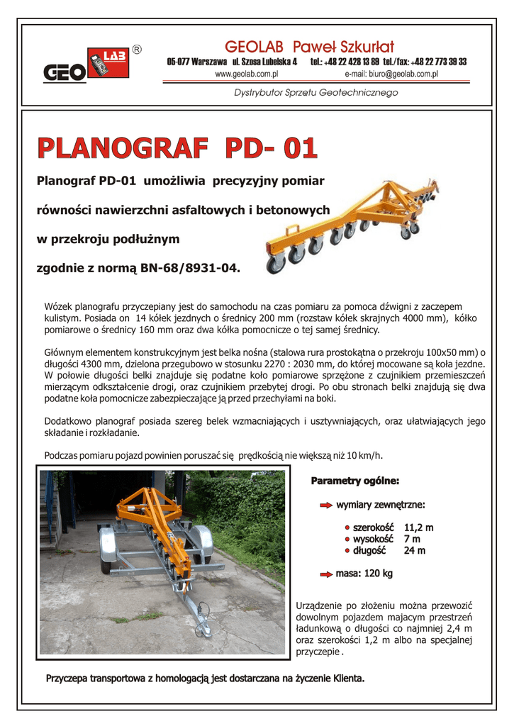 PLANOGRAF PD- 01 Planograf PD-01 umo¿liwia precyzyjny pomiar równoœci nawierzchni asfaltowych i betonowych w przekroju pod³u¿nym zgodnie z norm¹ BN-68/8931-04. Wózek planografu przyczepiany jest do samochodu na czas pomiaru za pomoca dŸwigni z zaczepem kulistym. Posiada on 14 kó³ek jezdnych o œrednicy 200 mm (rozstaw kó³ek skrajnych 4000 mm), kó³ko pomiarowe o œrednicy 160 mm oraz dwa kó³ka pomocnicze o tej samej œrednicy. G³ównym elementem konstrukcyjnym jest belka noœna (stalowa rura prostok¹tna o przekroju 100x50 mm) o d³ugoœci 4300 mm, dzielona przegubowo w stosunku 2270 : 2030 mm, do której mocowane s¹ ko³a jezdne. W po³owie d³ugoœci belki znajduje siê podatne ko³o pomiarowe sprzê¿one z czujnikiem przemieszczeñ mierz¹cym odkszta³cenie drogi, oraz czujnikiem przebytej drogi. Po obu stronach belki znajduj¹ siê dwa podatne ko³a pomocnicze zabezpieczaj¹ce j¹ przed przechy³ami na boki. Dodatkowo planograf posiada szereg belek wzmacniaj¹cych i usztywniaj¹cych, oraz u³atwiaj¹cych jego sk³adanie i rozk³adanie. Podczas pomiaru pojazd powinien poruszaæ siê prêdkoœci¹ nie wiêksz¹ ni¿ 10 km/h. Parametry ogólne: wymiary zewnêtrzne: szerokoœæ wysokoœæ d³ugoœæ 11,2 m 7m 24 m masa: 120 kg Urz¹dzenie po z³o¿eniu mo¿na przewoziæ dowolnym pojazdem majacym przestrzeñ ³adunkow¹ o d³ugoœci co najmniej 2,4 m oraz szerokoœci 1,2 m albo na specjalnej przyczepie . Przyczepa transportowa z homologacj¹ jest dostarczana na ¿yczenie Klienta. System elektronicznej rejestracji i obróbki danych sk³ada siê z: czujnika przebytej drogi wysy³aj¹cego impuls po przebyciu przez planograf ka¿dego kolejnego 25 cm odcinka drogi urz¹dzenia przetwarzaj¹cego dane wraz z czujnikiem odkszta³cenia drogi kabla po³¹czeniowego zasilacza z ³adowark¹ komputera osobistego laptop, na który wgrywane jest odpowiednie oprogramowanie (wyposa¿enie opcjonalne) oprogramowania komputerowego (system Windows) umo¿liwiaj¹cego przetworzenie danych pomiarowych do postaci czytelnych i zgodnych z wymaganiami protoko³ów badania Wyposa¿enie : Dane techniczne: instrukcja przygotowania planografu wraz z kart¹ gwarancyjn¹ dok³adnoœæ pomiaru nierównoœci 0,1 mm instrykcja rejestracji wyników - p³yta CD próbkowanie nierównoœci co 0,1 ms (10 000 próbek na sekundê) kabel po³¹czeniowy 6mb. zasilacz akumulatorowy zakres pomiaru czujnika nierównoœci do 32 mm (np. od 10 mm do + 22mm) zasilacz sieciowy czujnik pomiaru odkszta³cenia ( bezstykowy) jest zwi¹zany sztywn¹ przek³adni¹ z kó³kiem pomiarowym kabel ³adowania pomiar odleg³oœci odbywa siê za pomoc¹ czujnika bezstykowego bezpoœrednio na kó³ku Laptop (opcjonalnie) wtyczka przejœciowa przyczepa transportowa (opcjonalnie) oprogramowanie pracuj¹ce w œrodowiskach Windows 95/98/NT/2000/XP automatyczny eksport danych do programu MS EXCEL dowolna liczba serii pomiarowych w raporcie (np. pas lewy, pas prawy, pobocze) mo¿liwoœæ szybkiej obróbki danych i generacji raportów mo¿liwoœæ dokonania kalibracji dystansu i odkszta³cenia w ka¿dej chwili (nawet po pomiarze)