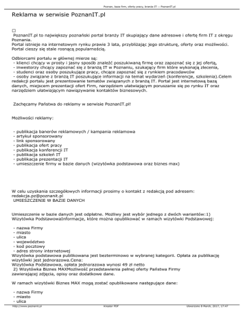 Poznan, baza firm, oferty pracy, branża IT :: PoznanIT.pl Reklama w serwisie PoznanIT.pl PoznanIT.pl to największy poznański portal branży IT skupiający dane adresowe i ofertę firm IT z okręgu Poznania. Portal istnieje na internetowym rynku prawie 3 lata, przybliżając jego strukturę, oferty oraz możliwości. Portal cieszy się stale rosnącą popularnością. Odbiorcami portalu w głównej mierze są: - klienci chcący w prosty i jasny sposób znaleźć poszukiwaną firmę oraz zapoznać się z jej ofertą, - inwestorzy chcący zapoznać się z branżą IT w Poznaniu, szukający firm które wykonają zlecenia, - studenci oraz osoby poszukujące pracy, chcące zapoznać się z rynkiem pracodawców - osoby związane z branżą IT poszukujące informacji na temat wydarzeń (konferencje, szkolenia).Celem redakcji portalu jest prezentowanie tematów związanych z branżą IT. Portal jest internetową bazą danych, miejscem prezentacji ofert Firm, narzędziem ułatwiającym poruszanie się po rynku IT oraz narzędziem ułatwiającym nawiązywanie kontaktów biznesowych. Zachęcamy Państwa do reklamy w serwisie PoznanIT.pl! Możliwości reklamy: - publikacja banerów reklamowych / kampania reklamowa artykuł sponsorowany link sponsorowany publikacja ofert pracy publikacja konferencji IT publikacja szkoleń IT publikacja prezentacji IT umieszczenie firmy w bazie danych (wizytówka podstawowa oraz biznes max) W celu uzyskania szczegółowych informacji prosimy o kontakt z redakcją pod adresem: [email protected] UMIESZCZENIE W BAZIE DANYCH Umieszczenie w bazie danych jest odpłatne. Możliwy jest wybór jednego z dwóch wariantów:1) Wizytówka PodstawowaInformacje, które można opublikować w ramach wizytówki Podstawowej: - nazwa Firmy - miasto - ulica - województwo - kod pocztowy - adres strony internetowej Wizytówka podstawowa publikowana jest bezterminowo w wybranej kategorii. Opłata za publikację wizytówki jest jednorazowa.Cena: Wizytówka Podstawowa, opłata jednorazowa wynosi 49 zł netto 2) Wizytówka Biznes MAXMożliwość przedstawienia pełnej oferty Państwa Firmy zawierającej zdjęcia, opisy oraz dodatkowe dane. W ramach wizytówki Biznes MAX mogą zostać opublikowane następujące dane: - nazwa Firmy - miasto - ulica http://www.poznanit.pl Kreator PDF Utworzono 8 March, 2017, 17:47 Poznan, baza firm, oferty pracy, branża IT :: PoznanIT.pl - kod pocztowy adres strony internetowej logo Firmy zdjęcie (5 sztuk - np. oddziały firmy, salony) - pełny opis działalności firmy, w treści może zostać opublikowana grafika lub zdjęcia (maksymalna objętość opisu - w przybliżeniu dwie kartki formatu A4) - profil Firmy - rozbudowana - pełne dane kontaktowe (adresy oddziałów, e-maile itp.) Ponadto: - wizytówka oznaczona jest symbolem 5 gwiazdek - Biznes MAX - wizytówka jest promowana na łamach portalu (na stronie głównej oraz w kategoriach) - w wizytówce nie są publikowane reklamy - wizytówka jest lepiej indexowana przez wyszukiwarki - zwiększa to prawdopodobieństwo odnalezienia Firmy przez Państwa klientów Wizytówka Biznes MAX publikowana jest w wybranej kategorii na okres jednego roku. Opłata za publikację wizytówki jest cykliczna (raz na rok). Cena:Wizytówka Biznes MAX, opłata roczna wynosi 129 zł netto (jest to najtańsza forma reklamy prezentująca w sposób kompleksowy Państwa Firmę i jej ofertę) Publikacja wizytówki Podstawowej lub BIZNES MAX to tylko 4 kroki! Zobacz! Zamów! Istnieje możliwość dostosowania prezentacji do wymagań reklamodawcy - cena negocjowana indywidualnie. Zapraszamy do skorzystania z możliwości serwisu PoznanIT.pl!(publikacja artykułów, ofert, reklama) Na wszystkie usługi wystawiamy Fakturę VAT. Przy większych zamówieniach atrakcyjne rabaty! Przykładowe rozmieszczenie reklam - strona główna portalu: http://www.poznanit.pl Kreator PDF Utworzono 8 March, 2017, 17:47