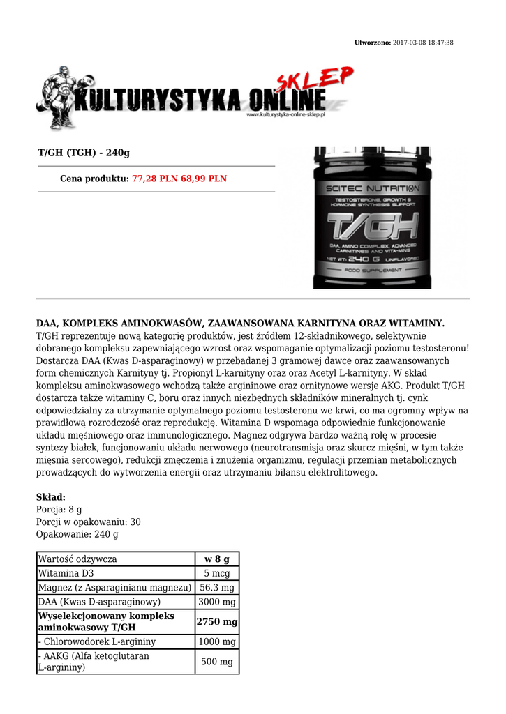 Utworzono: 2017-03-08 18:47:38 T/GH (TGH) - 240g Cena produktu: 77,28 PLN 68,99 PLN DAA, KOMPLEKS AMINOKWASÓW, ZAAWANSOWANA KARNITYNA ORAZ WITAMINY. T/GH reprezentuje nową kategorię produktów, jest źródłem 12-składnikowego, selektywnie dobranego kompleksu zapewniającego wzrost oraz wspomaganie optymalizacji poziomu testosteronu! Dostarcza DAA (Kwas D-asparaginowy) w przebadanej 3 gramowej dawce oraz zaawansowanych form chemicznych Karnityny tj. Propionyl L-karnityny oraz oraz Acetyl L-karnityny. W skład kompleksu aminokwasowego wchodzą także argininowe oraz ornitynowe wersje AKG. Produkt T/GH dostarcza także witaminy C, boru oraz innych niezbędnych składników mineralnych tj. cynk odpowiedzialny za utrzymanie optymalnego poziomu testosteronu we krwi, co ma ogromny wpływ na prawidłową rozrodczość oraz reprodukcję. Witamina D wspomaga odpowiednie funkcjonowanie układu mięśniowego oraz immunologicznego. Magnez odgrywa bardzo ważną rolę w procesie syntezy białek, funcjonowaniu układu nerwowego (neurotransmisja oraz skurcz mięśni, w tym także mięsnia sercowego), redukcji zmęczenia i znużenia organizmu, regulacji przemian metabolicznych prowadzących do wytworzenia energii oraz utrzymaniu bilansu elektrolitowego. Skład: Porcja: 8 g Porcji w opakowaniu: 30 Opakowanie: 240 g Wartość odżywcza w8g Witamina D3 5 mcg Magnez (z Asparaginianu magnezu) 56.3 mg DAA (Kwas D-asparaginowy) 3000 mg Wyselekcjonowany kompleks aminokwasowy T/GH 2750 mg - Chlorowodorek L-argininy 1000 mg - AAKG (Alfa ketoglutaran L-argininy) 500 mg - Glicyna 500 mg - Chlorowodorek L-lizyny 500 mg - OKG (Alfa ketoglutaran L-ornityny) 250 mg Cynk 1.5 mg Bor 3.6 mg Zaawansowany kompleks kreatynowy 1000 mg - Chlorowodorek acetylo L-karnityny 500 mg - Propionian L-karnityny 500 mg zawartość karnityny 634 mg Dawkowanie: Wymieszać jedną porcję produktu (8g) w 100 ml wody, spożywać przed snem. Adres: http://www.ko.sklep.pl/ Telefon: kom. 782 010 880 Email: [email protected]