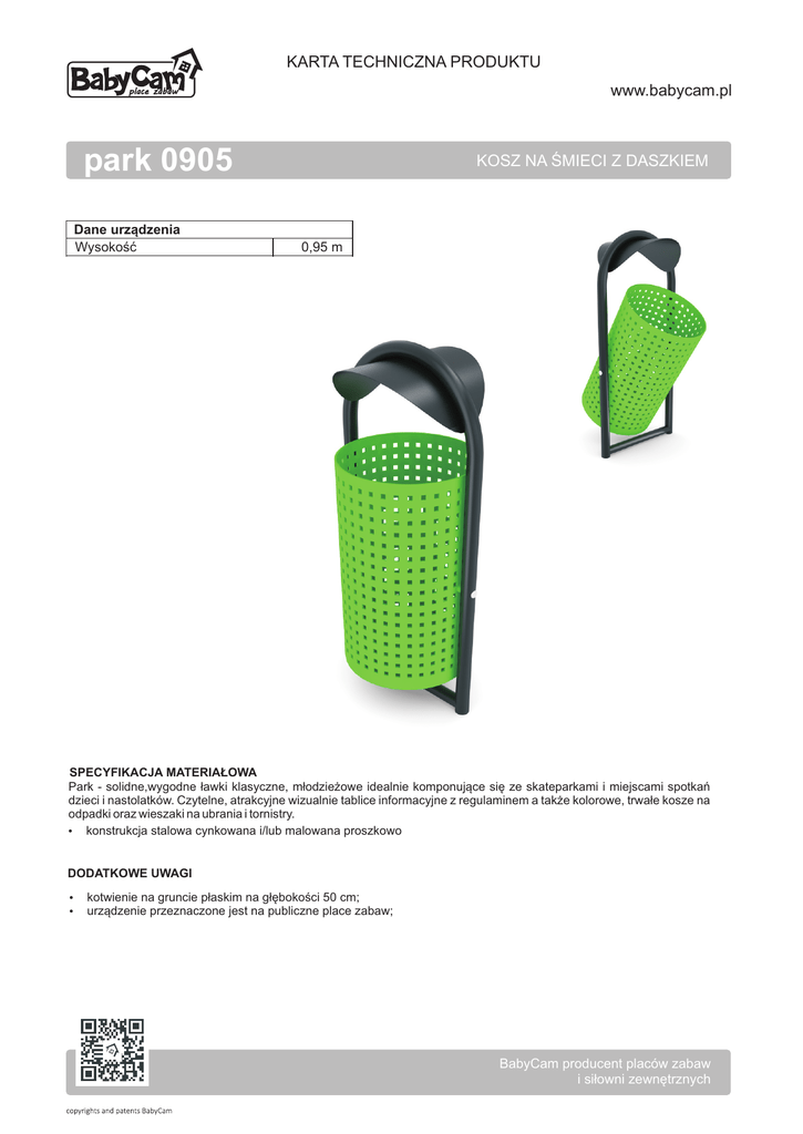 KARTA TECHNICZNA PRODUKTU www.babycam.pl place zabaw park 0905 Dane urz¹dzenia Wysokoœæ KOSZ NA ŒMIECI Z DASZKIEM 0,95 m SPECYFIKACJA MATERIA£OWA Park - solidne,wygodne ³awki klasyczne, m³odzie¿owe idealnie komponuj¹ce siê ze skateparkami i miejscami spotkañ dzieci i nastolatków. Czytelne, atrakcyjne wizualnie tablice informacyjne z regulaminem a tak¿e kolorowe, trwa³e kosze na odpadki oraz wieszaki na ubrania i tornistry. ? konstrukcja stalowa cynkowana i/lub malowana proszkowo DODATKOWE UWAGI ? kotwienie na gruncie p³askim na g³êbokoœci 50 cm; ? urz¹dzenie przeznaczone jest na publiczne place zabaw; BabyCam producent placów zabaw i si³owni zewnêtrznych