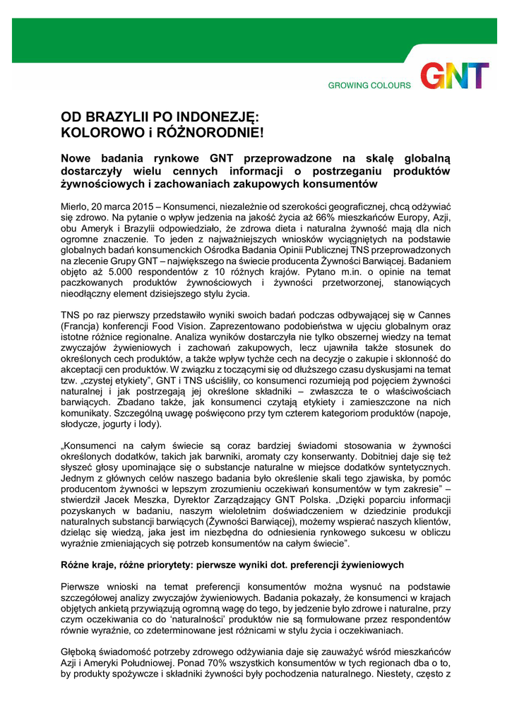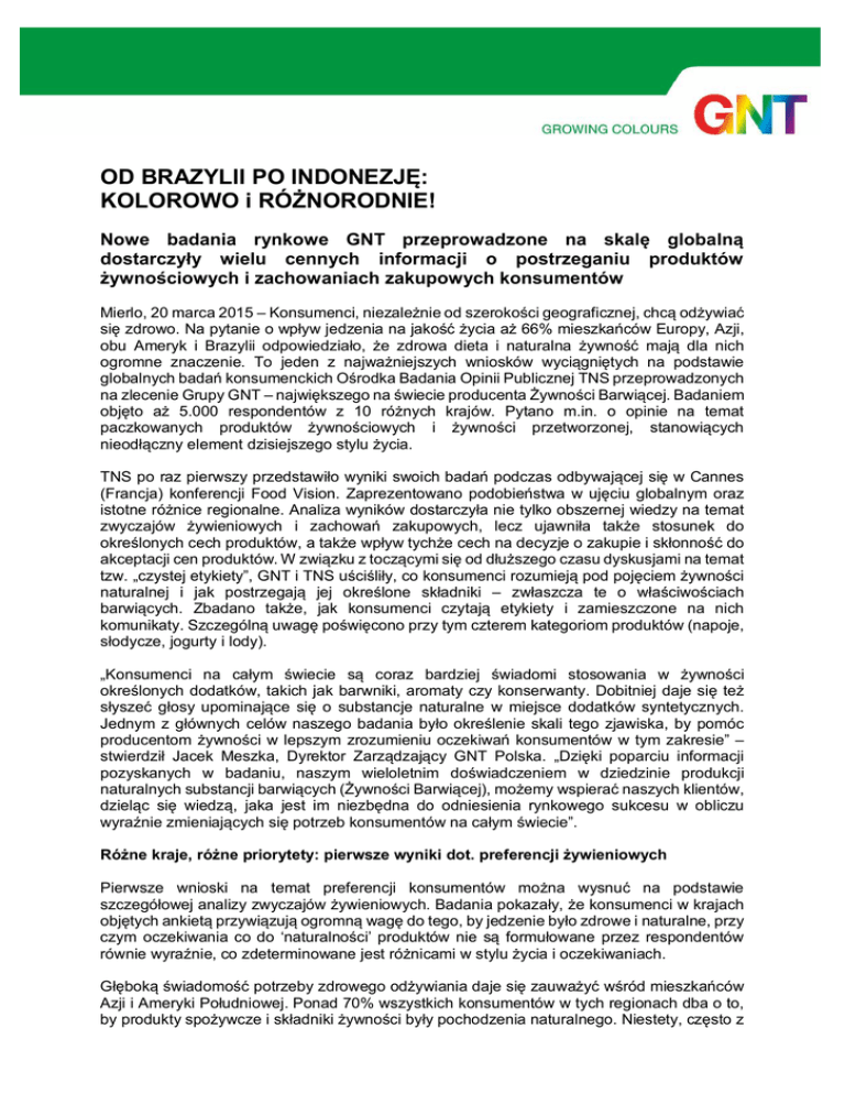 OD BRAZYLII PO INDONEZJ : KOLOROWO i RÓ NORODNIE! Nowe badania rynkowe GNT przeprowadzone na skal globaln dostarczy y wielu cennych informacji o postrzeganiu produktów ywno ciowych i zachowaniach zakupowych konsumentów Mierlo, 20 marca 2015 – Konsumenci, niezale nie od szeroko ci geograficznej, chc od ywia si zdrowo. Na pytanie o wp yw jedzenia na jako ycia a 66% mieszka ców Europy, Azji, obu Ameryk i Brazylii odpowiedzia o, e zdrowa dieta i naturalna ywno maj dla nich ogromne znaczenie. To jeden z najwa niejszych wniosków wyci gni tych na podstawie globalnych bada konsumenckich O rodka Badania Opinii Publicznej TNS przeprowadzonych na zlecenie Grupy GNT – najwi kszego na wiecie producenta ywno ci Barwi cej. Badaniem obj to a 5.000 respondentów z 10 ró nych krajów. Pytano m.in. o opinie na temat paczkowanych produktów ywno ciowych i ywno ci przetworzonej, stanowi cych nieod czny element dzisiejszego stylu ycia. TNS po raz pierwszy przedstawi o wyniki swoich bada podczas odbywaj cej si w Cannes (Francja) konferencji Food Vision. Zaprezentowano podobie stwa w uj ciu globalnym oraz istotne ró nice regionalne. Analiza wyników dostarczy a nie tylko obszernej wiedzy na temat zwyczajów ywieniowych i zachowa zakupowych, lecz ujawni a tak e stosunek do okre lonych cech produktów, a tak e wp yw tych e cech na decyzje o zakupie i sk onno do akceptacji cen produktów. W zwi zku z tocz cymi si od d szego czasu dyskusjami na temat tzw. „czystej etykiety”, GNT i TNS u ci li y, co konsumenci rozumiej pod poj ciem ywno ci naturalnej i jak postrzegaj jej okre lone sk adniki – zw aszcza te o w ciwo ciach barwi cych. Zbadano tak e, jak konsumenci czytaj etykiety i zamieszczone na nich komunikaty. Szczególn uwag po wi cono przy tym czterem kategoriom produktów (napoje, odycze, jogurty i lody). „Konsumenci na ca ym wiecie s coraz bardziej wiadomi stosowania w ywno ci okre lonych dodatków, takich jak barwniki, aromaty czy konserwanty. Dobitniej daje si te ysze g osy upominaj ce si o substancje naturalne w miejsce dodatków syntetycznych. Jednym z g ównych celów naszego badania by o okre lenie skali tego zjawiska, by pomóc producentom ywno ci w lepszym zrozumieniu oczekiwa konsumentów w tym zakresie” – stwierdzi Jacek Meszka, Dyrektor Zarz dzaj cy GNT Polska. „Dzi ki poparciu informacji pozyskanych w badaniu, naszym wieloletnim do wiadczeniem w dziedzinie produkcji naturalnych substancji barwi cych ( ywno ci Barwi cej), mo emy wspiera naszych klientów, dziel c si wiedz , jaka jest im niezb dna do odniesienia rynkowego sukcesu w obliczu wyra nie zmieniaj cych si potrzeb konsumentów na ca ym wiecie”. Ró ne kraje, ró ne priorytety: pierwsze wyniki dot. preferencji ywieniowych Pierwsze wnioski na temat preferencji konsumentów mo na wysnu na podstawie szczegó owej analizy zwyczajów ywieniowych. Badania pokaza y, e konsumenci w krajach obj tych ankiet przywi zuj ogromn wag do tego, by jedzenie by o zdrowe i naturalne, przy czym oczekiwania co do ‘naturalno ci’ produktów nie s formu owane przez respondentów równie wyra nie, co zdeterminowane jest ró nicami w stylu ycia i oczekiwaniach. bok wiadomo potrzeby zdrowego od ywiania daje si zauwa w ród mieszka ców Azji i Ameryki Po udniowej. Ponad 70% wszystkich konsumentów w tych regionach dba o to, by produkty spo ywcze i sk adniki ywno ci by y pochodzenia naturalnego. Niestety, cz sto z uwagi na brak czasu lub informacji pozwalaj cych na rzeteln ocen produktów i ich sk adu, respondenci w tych krajach cz sto decyduj si na odst pstwa od stosowania dobrze zbilansowanej diety. Wyra nie te wida , e ywno ci naturalnej oczekuj te mieszka cy Europy i Stanów Zjednoczonych, przy czym na tych rynkach zaobserwowano pewne ró nice w stosunku do Azji i Ameryki Po udniowej. Du a cz konsumentów nie tylko doskonale zdaje sobie spraw , e zdrowe od ywianie jest niezwykle wa ne, lecz ma tak e mo liwo ci oraz ch ci po wi cenia czasu i pieni dzy na to, by ich dieta by a optymalna. A 20-35% mieszka ców Francji, Niemiec, Polski, Hiszpanii, Wielkiej Brytanii i Stanów Zjednoczonych z pe wiadomo ci analizuje sk ad nabywanych produktów pod k tem naturalno ci sk adników. „Bior c pod uwag wyniki uzyskane w ród wszystkich grup respondentów dbaj cych o swoj diet , nasze badania dowodz , e czasy, kiedy konsumenci kupowali i/lub spo ywali produkty, nie zwa aj c na to, co zawieraj i jakimi metodami s wytwarzane nale zdecydowanie do przesz ci. Na ca ym wiecie daje si zauwa rosn ce zainteresowanie zdrow ywno ci pochodzenia naturalnego, zawieraj wy cznie sk adniki naturalne. Cho zainteresowanie to przybiera nieco inne formy w ró nych regionach wiata, ich wspólnym mianownikiem jest powszechne zrozumienie znaczenia tej kwestii” – twierdzi Jacek Meszka. „Producenci ywno ci powinni uwzgl dni te tendencje i u atwi konsumentom wyszukiwanie zdrowych produktów, zaspokajaj cych ich potrzeby. Jako pionierzy w dziedzinie wykorzystywania owoców i warzyw do barwienia ywno ci (produkcji tzw. ywno ci Barwi cej), wyra amy ogromne zadowolenie, i mo emy podzieli si tymi informacjami z naszymi klientami. Dzi ki wsparciu GNT producenci ywno ci mog opracowywa nowe, atrakcyjne produkty i napoje o intensywnych barwach, spe niaj ce jednocze nie oczekiwania konsumentów, które zapewni im rynkowy sukces w przysz ci”. Wi cej informacji na temat GNT znale mo na na: gnt-group.com. Uwagi dla redaktorów Reprezentatywne badania konsumenckie obj y 5.000 respondentów w wieku od 18 do 70 lat, zamieszkuj cych Brazyli , Chiny, Francj , Niemcy, Indonezj , Polsk , Hiszpani , Tajlandi , Wielk Brytani i Stany Zjednoczone. Badania ilo ciowe przeprowadzone zosta y za po rednictwem Internetu w grudniu 2014 roku przez TNS, na zlecenie Grupy GNT. Kwestionariusz opracowano na podstawie wst pnych bada jako ciowych, dokonuj c analizy spostrze i opinii konsumentów z siedmiu krajach. GNT GNT Group (gnt-group.com) jest wiatowym liderem w produkcji ywno ci Barwi cej. Firma dost
