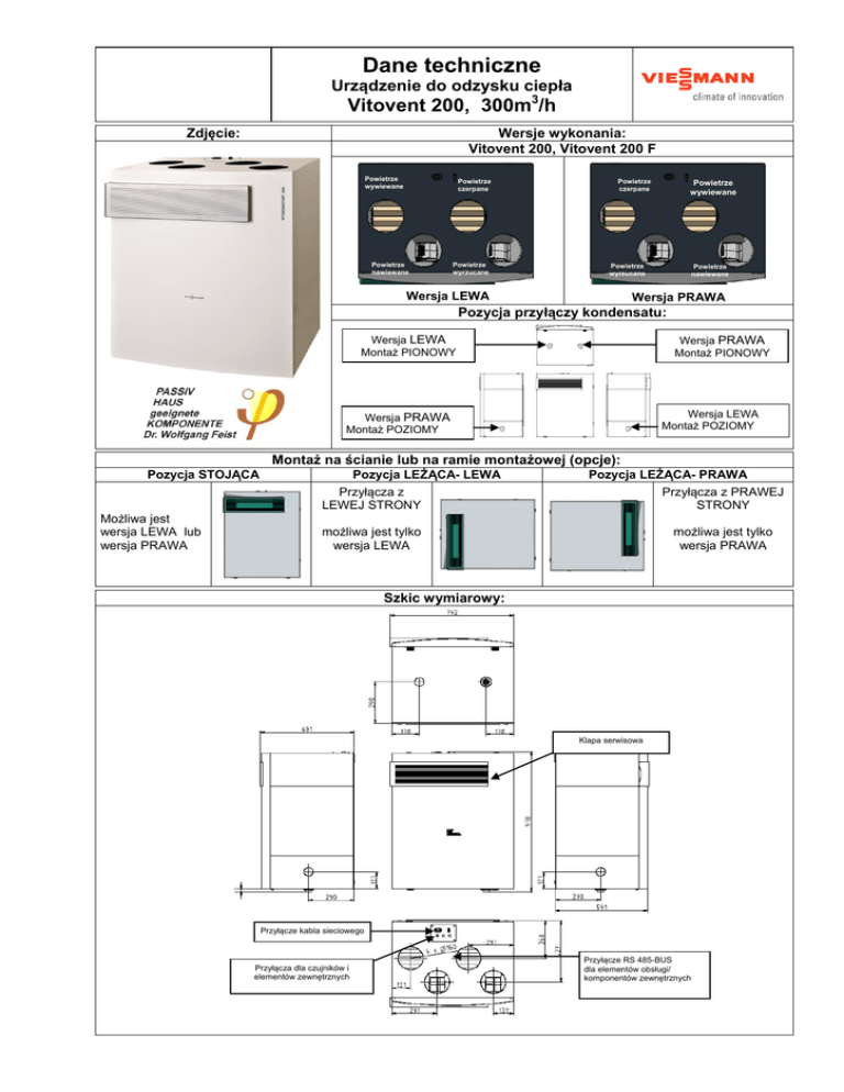 Dane techniczne Urządzenie do odzysku ciepła Vitovent 200, 300m3/h Zdjęcie: Wersje wykonania: Vitovent 200, Vitovent 200 F Powietrze wywiewane Powietrze czerpane Powietrze nawiewane Powietrze wyrzucane Powietrze czerpane Powietrze wywiewane Powietrze wyrzucane Wersja LEWA Powietrze nawiewane Wersja PRAWA Pozycja przyłączy kondensatu: Wersja LEWA Montaż PIONOWY Wersja PRAWA Montaż PIONOWY Wersja LEWA Montaż POZIOMY Wersja PRAWA Montaż POZIOMY Montaż na ścianie lub na ramie montażowej (opcje): Pozycja STOJĄCA Możliwa jest wersja LEWA lub wersja PRAWA Pozycja LEŻĄCA- LEWA Przyłącza z LEWEJ STRONY Pozycja LEŻĄCA- PRAWA Przyłącza z PRAWEJ STRONY możliwa jest tylko wersja LEWA możliwa jest tylko wersja PRAWA Szkic wymiarowy: Klapa serwisowa Przyłącze kabla sieciowego Przyłącza dla czujników i elementów zewnętrznych Przyłącze RS 485-BUS dla elementów obsługi/ komponentów zewnętrznych Komponenty urządzenia: Układ sterowniczy: Elementy obsługi: Wymiennik ciepła: * zależne od powietrza czerpanego i wywiewnego Granica zamarzania: Materiał: Wentylatory: Filtry: Obudowa: Przyłącza rur: Odpływ kondensatu: Bypass: Ciężar: Przyłącze elektryczne: Klasa zabezpieczenia (wg EN 60335): Rodzaj zabezpieczenia (wg DIN 40050): Tworzywo sztuczne (standardowy wymiennik ciepła, patent firmy < 0°C PAUL) Celuloza (membranowy wymiennik ciepła z odzyskiem wilgoci) < -10°C Wentylatory promieniowe EC ze zintegrowanym systemem elektronicznym, regulowane stałą objętością (V-konstant) Klasa filtracji: G4 (powietrze czerpane i powietrze wywiewane) Opcja: Filtry pyłków F7 (powietrze czerpane) – zwiększone ciśnienie Blacha stalowa ocynkowana, powlekana proszkowo DN 160 (rozmiar złączki) Zawór zbiornika AG 1¼“ Bypass letni sterowany silnikiem, regulowany na podstawie wskazań czujników, w 100 % szczelnie zamykający się 50 kg Kabel zasilający 230 V, 50 Hz, o długości 2 m ze złączem wtykowym I IP 40 -20 do 40 °C (możliwe jest wyłączenie urządzenia prze automatyczne zabezpieczenie przed zamarzaniem) W poziomie i pionie na ścianie lub na podstawie (opcja) Ustawienie w miejscu nienarażonym na zamarzanie, jeżeli jest to możliwe w temperaturze >10 °C Granice zastosowań: Montaż: Dane eksploatacyjne: Moc przyłączeniowa: Kryterium wydajności (prąd): Strumień objętości: Stopień odzysku ciepła: Poziom ciśnienia akustycznego: (wg DIN EN ISO 3744, odstęp 3 m) 140 W 0,23 Wh/m³ przy 200 m³/h; 0,24 Wh/m³ przy 145 m³/h 80 m³/h do 300 m³/h 93 % przy 200 m³/h; 94,4 % przy 145 m³/h (wartości mierzone po stronie powietrza odprowadzanego na podstawie certyfikatu domu pasywnego) Strumień objętości powietrza (m³/h) Poziom ciśnienia akustycznego [dB(A)] 200 21 300 26 Krzywa charakterystyczna z wybranymi danymi mocy: Ciśnienie [Pa] Wskazówki do danych technicznych i eksploatacyjnych: Wszystkie dane są zgodne z certyfikatem domów pasywnych dla urządzeń ze standardowym wymiennikiem ciepła Wartości liczbowe podane w polach tekstowych krzywej charakterystycznej p-V podają pobór mocy w [W] dla poszczególnych punktów eksploatacji. Zakres stosowania 3 Ilość powietrza [m /h] Stopnie wentylatora: STANDBY, NIEOBECNOŚCI, STOPIEŃ 1,2 i 3* Stopnie wentylatora: STANDBY, STOPIEŃ 1 do STOPNIA 7** Tryb „Tylko powietrze nawiewane“ lub „Tylko powietrze wywiewane”“ ** (tryb „Tylko powietrze wywiewane“ zostaje zablokowany podczas użytkowania jednocześnie z paleniskiem) Programowanie stopni wentylator w krokach 1% (80-300 m³/h) odbywa się indywidualne dla każdego st. wentylatora powietrza nawiewanego i wywiewanego* Możliwość indywidualnego ustawienia tygodniowego programu czasowego* Automatyka czujników (CO2, wilgotność, czystość powietrza); opcjonalnie z zewnętrznym czujnikiem* Interfejs cyfrowy I/O (np. wejście dla opcji WYŁĄCZ z zewnątrz) Możliwość podłączenia przycisku wentylacji uderzeniowej Kontrola okresu użytkowania filtra Zabezpieczenie przed zamarzaniem (wraz z ochroną przeciwoblodzeniową dla wodnej nagrzewnicy wtórnej) Układ sterowniczy wewnętrznego bypassu lato-zima Urządzenie jest przygotowane do użytkowania jednocześnie z paleniskiem. Pobór mocy w funkcji standby < 1 W Opcje (moduł dodatkowy) Układ sterowniczy zewnętrznej nagrzewnicy odmrażającej Układ sterowniczy obiegu grzewczego lub nagrzewnicy wtórnej Układ sterowniczy elektrycznej przepustnicy nastawczej na gruntownym wymienniku ciepła Uwagi dotyczące poszczególnych rodzajów urządzeń sterowniczych: * Funkcja sterowania tylko z panelem dotykowym TFT * Funkcja sterowania tylko z panelem obsługi LED Panel obsługi LED (szer. x wys. x gł. w mm: 80x80x12) w programie przełączników PEHA Panel dotykowy TFT (szer. x wys. x gł. w mm: 102x78x14) Uwagi dotyczące podłączenia elementów obsługi / komponentów zewnętrznych: Kabel CAT-5 o długości 1,5m pomiędzy gniazdkiem RJ-45 urządzenia wentylacyjnego a gniazdkiem wtykowym RJ-45 płyty adaptera (zakres dostawy) Montaż elementów obsługi w puszce montażowej Przewód sterowniczy: J-Y(St)Y 2x2x0,6 ekranowany, maksymalnie 25m Wymagana jest puszka zaciskowa w pobliżu urządzenia wentylacyjnego