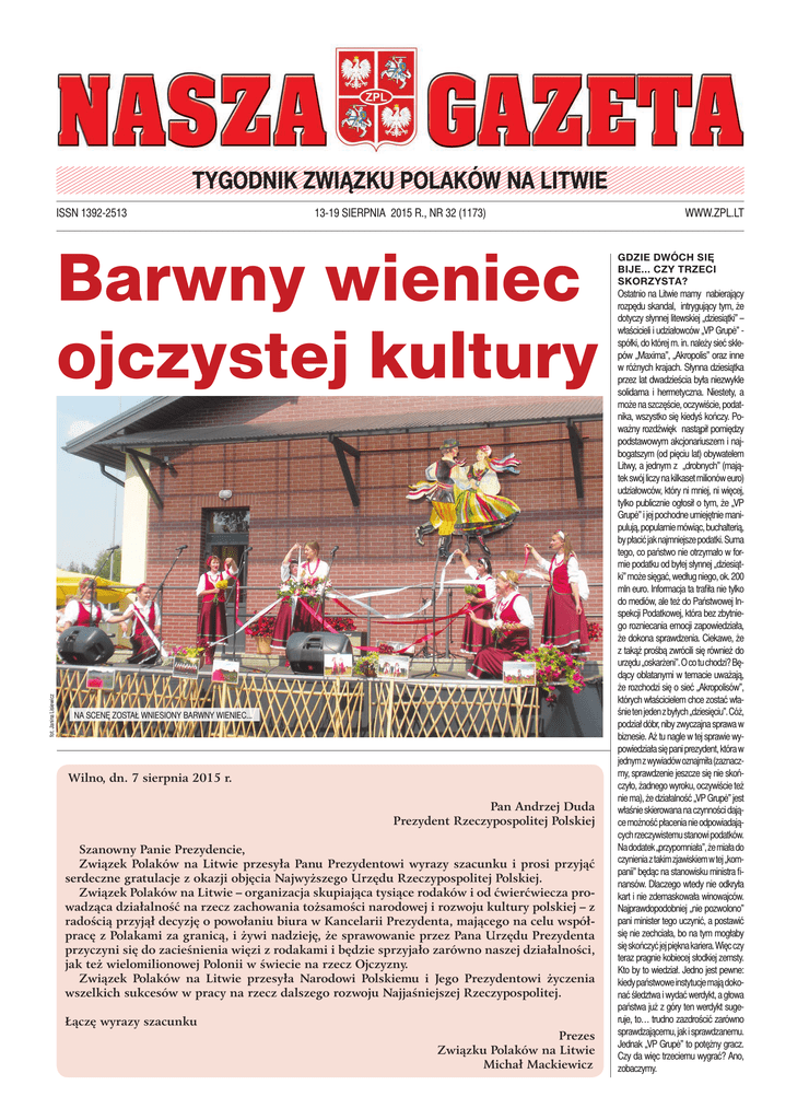 TYGODNIK ZWIĄZKU POLAKÓW NA LITWIE ISSN 1392-2513 13-19 SIERPNIA 2015 R., NR 32 (1173) fot. Janina Lisiewicz Barwny wieniec ojczystej kultury NA SCENĘ ZOSTAŁ WNIESIONY BARWNY WIENIEC... Wilno, dn. 7 sierpnia 2015 r. Pan Andrzej Duda Prezydent Rzeczypospolitej Polskiej Szanowny Panie Prezydencie, Związek Polaków na Litwie przesyła Panu Prezydentowi wyrazy szacunku i prosi przyjąć serdeczne gratulacje z okazji objęcia Najwyższego Urzędu Rzeczypospolitej Polskiej. Związek Polaków na Litwie – organizacja skupiająca tysiące rodaków i od ćwierćwiecza prowadząca działalność na rzecz zachowania tożsamości narodowej i rozwoju kultury polskiej – z radością przyjął decyzję o powołaniu biura w Kancelarii Prezydenta, mającego na celu współpracę z Polakami za granicą, i żywi nadzieję, że sprawowanie przez Pana Urzędu Prezydenta przyczyni się do zacieśnienia więzi z rodakami i będzie sprzyjało zarówno naszej działalności, jak też wielomilionowej Polonii w świecie na rzecz Ojczyzny. Związek Polaków na Litwie przesyła Narodowi Polskiemu i Jego Prezydentowi życzenia wszelkich sukcesów w pracy na rzecz dalszego rozwoju Najjaśniejszej Rzeczypospolitej. Łączę wyrazy szacunku Prezes Związku Polaków na Litwie Michał Mackiewicz WWW.ZPL.LT GDZIE DWÓCH SIĘ BIJE... CZY TRZECI SKORZYSTA? Ostatnio na Litwie mamy nabierający rozpędu skandal, intrygujący tym, że dotyczy słynnej litewskiej „dziesiątki” – właścicieli i udziałowców „VP Grupė” spółki, do której m. in. należy sieć sklepów „Maxima”, „Akropolis” oraz inne w różnych krajach. Słynna dziesiątka przez lat dwadzieścia była niezwykle solidarna i hermetyczna. Niestety, a może na szczęście, oczywiście, podatnika, wszystko się kiedyś kończy. Poważny rozdźwięk nastąpił pomiędzy podstawowym akcjonariuszem i najbogatszym (od pięciu lat) obywatelem Litwy, a jednym z „drobnych” (majątek swój liczy na kilkaset milionów euro) udziałowców, który ni mniej, ni więcej, tylko publicznie ogłosił o tym, że „VP Grupė” i jej pochodne umiejętnie manipulują, popularnie mówiąc, buchalterią, by płacić jak najmniejsze podatki. Suma tego, co państwo nie otrzymało w formie podatku od byłej słynnej „dziesiątki” może sięgać, według niego, ok. 200 mln euro. Informacja ta trafiła nie tylko do mediów, ale też do Państwowej Inspekcji Podatkowej, która bez zbytniego rozniecania emocji zapowiedziała, że dokona sprawdzenia. Ciekawe, że z takąż prośbą zwrócili się również do urzędu „oskarżeni”. O co tu chodzi? Będący oblatanymi w temacie uważają, że rozchodzi się o sieć „Akropolisów”, których właścicielem chce zostać właśnie ten jeden z byłych „dziesięciu”. Cóż, podział dóbr, niby zwyczajna sprawa w biznesie. Aż tu nagle w tej sprawie wypowiedziała się pani prezydent, która w jednym z wywiadów oznajmiła (zaznaczmy, sprawdzenie jeszcze się nie skończyło, żadnego wyroku, oczywiście też nie ma), że działalność „VP Grupė” jest właśnie skierowana na czynności dające możność płacenia nie odpowiadających rzeczywistemu stanowi podatków. Na dodatek „przypomniała”, że miała do czynienia z takim zjawiskiem w tej „kompanii” będąc na stanowisku ministra finansów. Dlaczego wtedy nie odkryła kart i nie zdemaskowała winowajców. Najprawdopodobniej „nie pozwolono” pani minister tego uczynić, a postawić się nie zechciała, bo na tym mogłaby się skończyć jej piękna kariera. Więc czy teraz pragnie kobiecej słodkiej zemsty. Kto by to wiedział. Jedno jest pewne: kiedy państwowe instytucje mają dokonać śledztwa i wydać werdykt, a głowa państwa już z góry ten werdykt sugeruje, to… trudno zazdrościć zarówno sprawdzającemu, jak i sprawdzanemu. Jednak „VP Grupė” to potężny gracz. Czy da więc trzeciemu wygrać? Ano, zobaczymy. 2 13-19 sierpnia 2015 r., nr 32 (1173) www.zpl.lt fot. Janina Lisiewicz Barwny wieniec ojczyste „WESOŁE BABKI” WRAZ Z PROWADZĄCĄ EDYTĄ TAMOŠIŪNAITĖ 8 sierpnia w osiedlu Szawle odbył się XI Festyn Kultury Polskiej Rejonu Szyrwinckiego „Śpiewaj z nami”. Organizowane przez Szyrwincki Oddział Rejonowy ZPL oraz lokalne wspólnoty święto, stało się barwną prezentacją zarówno polskiej, jak i innych kultur mieszkańców tej ziemi oraz bliższych i dalszych sąsiadów. SENIORKI WYKONAŁY PIOSENKI, KTÓRE W CIĄGU DZIESIĄTKÓW LAT PRZETRWAŁY NA TEJ ZIEMI do użytku nowoczesny ośrodek wspólnoty lokalnej i odpowiednio zagospodarowany plac przy nim i właśnie tu zorganizować święto, co zarówno artystom jak i widzom zapewniło bardziej komfortowe warunki. Prawda, organizatorzy trochę się obawiali, czy wierna publiczność przybędzie do Szawel. Ale, jak się okazało, nawet panujący skwar, chętnych do wzięcia udziału w Festynie nie wystraszył. Trzeba przyznać, że organizatorzy już tradycyjnie zadbali o to, by goście czuli się tu dobrze – ustawiono parasole od słońca, urządzono odpowiednią ilość miejsc do siedzenia, a estetycznie udekorowana scena i teren wokół niej zachęcały do wzięcia udziału w imprezie. Inauguracja Festynu rozpoczęła się od wniesienia na scenę przez zespolanki z „Czerwonych Maków” imponującego wieńca, uwitego z różnobarwnych kwiatów, który miał symbolizować różnorodność i bogactwo kultur tej ziemi. Do tego symbolu nieraz sobotniego popołudnia powracali w swych przemówieniach goście oraz prowadząca imprezę Edyta Tamošiūnaitė, która poetycko, ciepło i serdecznie witała zebranych oraz przedstawiła uczestników Festynu. Przed zgromadzoną licznie widownią obok gospodarzy – zespołu ludowego „Czerwone Maki” (kierownik Stefania Tomaszun), na szawelskiej scenie wystąpili: grupa folklorystyczna „Wesołe Babki” (kierownik Wśród zgromadzonej publiczności obecna była posłanka na Sejm RL, przewodnicząca Frakcj