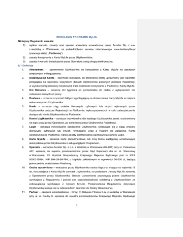 REGULAMIN PROGRAMU MyLife Niniejszy Regulamin określa: 1) ogólne warunki, zasady oraz sposób sprzedaży prowadzonej przez Acceler Sp. z o.o. z siedzibą w Warszawie, za pośrednictwem serwisu internetowego www.kartamylife.pl (zwanego dalej: „Platformą”) 2) zasady korzystania z Karty MyLife przez Użytkowników, 3) zasady i warunki świadczenia przez Operatora usług drogą elektroniczną. § 1 Definicje 1. Abonament – uprawnienie Użytkownika do korzystania z Karty MyLife na zasadach określonych w Regulaminie. 2. Dezaktywacja Konta – czynność faktyczna, do dokonania której uprawniony jest Operator polegająca na usunięciu wszystkich danych Użytkownika podanych podczas Rejestracji, w wyniku której określony Użytkownik traci możliwość korzystania z Platformy i Karty MyLife. 3. Dni Robocze – oznacza dni tygodnia od poniedziałku do piątku z wyłączeniem dni ustawowo wolnych od pracy. 4. Dostawa – oznacza czynność faktyczną polegającą na dostarczeniu Karty MyLife w miejsce wskazane przez Użytkownika. 5. Hasło – oznacza ciąg znaków literowych, cyfrowych lub innych wybranych przez Użytkownika podczas Rejestracji na Platformie, wykorzystywanych w celu zabezpieczenia dostępu do Konta Użytkownika na Platformie. 6. Konto Użytkownika – oznacza indywidualny dla każdego Użytkownika panel, uruchomiony na jego rzecz przez Operatora, po dokonaniu przez Użytkownika Rejestracji. 7. Login – oznacza indywidualne oznaczenie Użytkownika, składające się z ciągu znaków literowych, cyfrowych lub innych, wymagane wraz z Hasłem do założenia Konta Użytkownika na Platformie. Adres poczty elektronicznej Użytkownika stanowi Login. 8. Karta MyLife – oznacza kartę abonamentową lub inną formę zastępczą umożliwiającą skorzystanie przez Użytkownika z usług objętych Programem, 9. Operator – oznacza Acceler Sp. z o.o. z siedzibą w Warszawie (02-801) przy ul. Puławskiej 427, wpisaną do rejestru przedsiębiorców przez Sąd Rejonowy dla m. st. Warszawy w Warszawie, XII Wydział Gospodarczy Krajowego Rejestru Sądowego pod nr KRS 0000315094, NIP 894-29-59-764, o kapitale zakładowym w wysokości 50.000 zł, będącą jednocześnie właścicielem Platformy. 10. Osoba uprawniona – wskazana przez Użytkownika osoba fizyczna, mająca co najmniej 16 lat, korzystająca z Karty MyLife zamiast Użytkownika, na podstawie Umowy MyLife zawartej z Operatorem przez Użytkownika. Osobie Uprawnionej przysługują prawa Użytkownika wynikające z Regulaminu i ponosi ona odpowiedzialność solidarną z Użytkownikiem za zobowiązania wynikające z Umowy MyLife. Postanowienia Regulaminu dotyczące Użytkownika stosuje się w odpowiednim zakresie do Osoby Uprawnionej. 11. Partner – oznacza przedsiębiorcę - firmy: (i) Calypso Fitness S.A. z siedzibą w Warszawie przy ul. A. Fredry 6, wpisaną do rejestru przedsiębiorców Krajowego Rejestru Sądowego 1 przez Sąd Rejonowy dla m.st. Warszawy, XII Wydział Gospodarczy Krajowego Rejestru Sądowego pod numerem KRS: 0000400719, NIP: 525-251-96-84, o kapitale zakładowym w wysokości 148.932 zł., w całości opłaconym (ii) Fitness MCG Sp. z o.o. z siedzibą w Warszawie przy ul. Canaletta 4 (00-099 Warszawa) wpisaną do rejestru przedsiębiorców przez Sąd Rejonowy dla m.st. Warszawy, XII Wydział Gospodarczy Krajowego Rejestru Sądowego pod nr KRS 0000384688, NIP 525-250-73-33, o kapitale zakładowym w wysokości 500.000 zł,; (iii) Baltic Fitness Center Sp. z o.o. z siedzibą w Warszawie przy ul. Canaletta 4 (00-099 Warszawa) wpisaną do rejestru przedsiębiorców przez Sąd Rejonowy dla m.st. Warszawy, XII Wydział Gospodarczy Krajowego Rejestru Sądowego pod nr KRS 0000431757, NIP 525-253-81-96, o kapitale zakładowym w wysokości 5.000 zł,; (iv) EFC Fitness S.A. z siedzibą w Warszawie przy ul. Al. Komisji Edukacji Narodowej 60, wpisanej do rejestru przedsiębiorców przez Sąd Rejonowy dla m.st. Warszawy, XIII Wydział Gospodarczy Krajowego Rejestru Sądowego pod numerem KRS 0000500499, NIP 951-23777-12, o kapitale zakładowym w wysokości 100.000 zł, w całości opłaconym, (v) Fitness Academy Sp. z o.o. S.K.A, z siedzibą przy ul. Kutnowskiej 1-3, 53-135 Wrocław, zarejestrowaną przez Sąd Rejonowy dla Wrocławia-Fabrycznej we Wrocławiu VI Wydział Gospodarczy Krajowego Rejestru Sądowego pod nr KRS 0000403652, NIP 8992731738, o kapitale zakładowym w wysokości 60.000 zł., w całości opłaconym; - które świadczą na rzecz Użytkowników usługi objęte Programem na podstawie umowy z Operatorem, w zakresie usług fitness; 12. Partner medyczny – oznacza przedsiębiorcę - firmę Lux Med Sp. z o.o., z siedzibą w Warszawie przy ul. Postępu 21C, 02-676 Warszawa, wpisaną do rejestru przedsiębiorców Krajowego Rejestru Sądowego prowadzonego przez Sąd Rejonowy dla m.st. Warszawy, XIII Wydział Gospodarczy Krajowego Rejestru Sądowego pod nr KRS 0000265353, NIP 5272523080, o kapitale zakładowym w wysokości 516.078.000,00 zł, - która na podstawie odrębnej umowy świadczy na rzecz Użytkowników usługi objęte Programem, w zakresie pakietu usług medycznych. 13. Płatnik – osoba trzecia wskazana przez Użytkownika, która jest zobowiązana do regulowania bieżących opłat wynikających z Umowy MyLife. Płatnik ponosi odpowiedzialność solidarną z Użytkownikiem za zobowiązania wynikające z Umowy MyLife. 14. Program MyLife/Program - skierowana do Użytkowników oferta (i) korzystania z sieci obiektów sportowych oraz fitness Partnera, a także (ii) pakietu usług medycznych obsługiwanego przez Partnera medycznego, na podstawie Karty MyLife i na warunkach określonych w Regulaminie oraz Regulaminie Pakietu Medycznego. 15. Regulamin – oznacza niniejszy regulamin. 16. Regulamin Pakietu Medycznego / ubezpieczenia zdrowotnego – oznacza Ogólne Warunki Udzielania Świadczeń Zdrowotnych (dalej „OWU”) oraz Plan Opieki Medycznej (dalej „POM”), na podstawie których Użytkownik może k