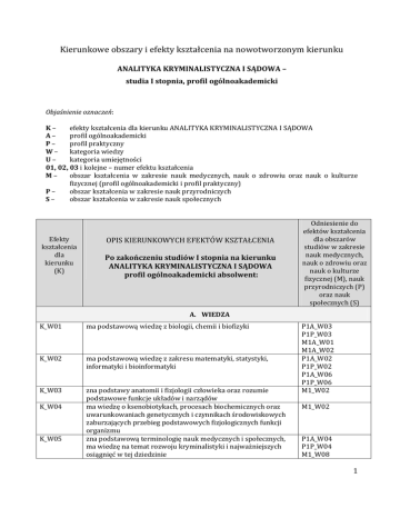 Kierunkowe obszary i efekty kształcenia na nowotworzonym kierunku ANALITYKA KRYMINALISTYCZNA I SĄDOWA – studia I stopnia, profil ogólnoakademicki Objaśnienie oznaczeń: K – efekty kształcenia dla kierunku ANALITYKA KRYMINALISTYCZNA I SĄDOWA A – profil ogólnoakademicki P – profil praktyczny W – kategoria wiedzy U – kategoria umiejętności 01, 02, 03 i kolejne – numer efektu kształcenia M – obszar kształcenia w zakresie nauk medycznych, nauk o zdrowiu oraz nauk o kulturze fizycznej (profil ogólnoakademicki i profil praktyczny) P – obszar kształcenia w zakresie nauk przyrodniczych S – obszar kształcenia w zakresie nauk społecznych Odniesienie do efektów kształcenia Efekty dla obszarów OPIS KIERUNKOWYCH EFEKTÓW KSZTAŁCENIA kształcenia studiów w zakresie dla nauk medycznych, Po zakończeniu studiów I stopnia na kierunku kierunku nauk o zdrowiu oraz ANALITYKA KRYMINALISTYCZNA I SĄDOWA (K) nauk o kulturze profil ogólnoakademicki absolwent: fizycznej (M), nauk przyrodniczych (P) oraz nauk społecznych (S) A. WIEDZA K_W01 ma podstawową wiedzę z biologii, chemii i biofizyki K_W02 ma podstawową wiedzę z zakresu matematyki, statystyki, informatyki i bioinformatyki K_W03 zna podstawy anatomii i fizjologii człowieka oraz rozumie podstawowe funkcje układów i narządów ma wiedzę o ksenobiotykach, procesach biochemicznych oraz uwarunkowaniach genetycznych i czynnikach środowiskowych zaburzających przebieg podstawowych fizjologicznych funkcji organizmu zna podstawową terminologię nauk medycznych i społecznych, ma wiedzę na temat rozwoju kryminalistyki i najważniejszych osiągnięć w tej dziedzinie K_W04 K_W05 P1A_W03 P1P_W03 M1A_W01 M1A_W02 P1A_W02 P1P_W02 P1A_W06 P1P_W06 M1_W02 M1_W02 P1A_W04 P1P_W04 M1_W08 1 K_W06 K_W07 K_W08 K_W09 K_W10 K_W11 posiada wiedzę z zakresu pojęć i zjawisk genetyki ogólnej, genetyki populacyjnej oraz genetyki człowieka ma wiedzę na temat roślin i substancji naturalnych o działaniu psychogennym i toksycznym oraz śladów mikrobiologicznych ma wiedzę w zakresie podstawowych technik molekularnych i technologii wykorzystywanych w badaniach materiału genetycznego zna zasady izolacji i analizy materiału dowodowego oraz zasady pracy w laboratorium analitycznym zna chemiczne i biochemiczne podstawy mechanizmu działania ksenobiotyków zna właściwości fizyko‐chemiczne substancji chemicznych oraz metody klasyczne i instrumentalne analizy chemicznej zna typy i mechanizmy reakcji chemicznych M1_W01 P1A_W04 P1P_W04 P1A_W05 P1P_W05 P1A_W05 P1P_W05 P1A_W07 P1P_W07 M1_W03 K_W13 P1A_W03 P1P_W03 P1A_W03 P1P_W03 zna kryteria wyboru metody analitycznej oraz zasady jej walidacji P1P_W07 K_W14 ma podstawową wiedzę z zakresu chemii medycznej M1_W01 K_W15 zna podstawowe narzędzia i techniki stosowane w naukach chemicznych, biologicznych i medycznych K_W16 ma wiedzę na temat środowiska przyrodniczego i jego zanieczyszczenia, w tym zagrożeń żywieniowych i konsekwencji zdrowotnych zna zasady pracy w pracowniach chemicznych i biologicznych (przepisy BHP, zasady dobrej praktyki laboratoryjnej, zagrożenia) zna pojęcia związane z toksykologią oraz mechanizmy toksycznego działania ksenobiotyków, metody ich identyfikacji i oznaczania P1A_W04 P1A_W05 P1A_W07 P1P_W04 K_W12 K_W17 K_W18 P1A_W09 P1P_W09 P1A_W04 P1P_W04 P1A_W05 P1P_W05 P1A_W04 P1P_W04 S1A_W07 M1_W04 K_W19 zna zagadnienia związane z zafałszowaniem leków i żywności K_W20 K_W23 zna podstawowe zagadnienia związane z nadużywaniem leków, środków odurzających i dopalaczy oraz zasady prowadzenia działań profilaktycznych w tym zakresie zna zasady wyboru materiału do badania (krew, mocz, ślina, włosy, wymiociny, popłuczyny żołądka, kał), sposoby pobierania, zabezpieczania, transportu i przechowywania analizowania materiału dowodowego zna wpływ czynników biologicznych, fizycznych i chemicznych na wartość wyniku toksykologicznego zna i rozumie pojęcie śmierci gwałtownej K_W24 zna podstawy sądowo‐lekarskiego badania zwłok M1_W03 K_W25 zna pojęcie dowodu i śladu oraz identyfikacji kryminalistycznej M1_W03 K_W26 zna podstawy prawa karnego materialnego i prawa karnego procesowego oraz wybrane zagadnienia postępowania S1A_W02 S1P_W02 K_W21 K_W22 M1_W08 M1_W09 M1_W08 M1_W03 2 K_W27 K_W28 K_W29 K_W30 przygotowawczego w procesie karnym zna zasady opracowania raportu z wykonywanych badań oraz przygotowania ekspertyz sądowych zna struktury zarządzania firmą, formy prawne oraz podstawowe pojęcia dotyczące przedsiębiorczości i polityki ekonomicznej posiada wiedzę filozoficzno‐społeczną przydatną w rozumieniu współczesnego świata i poruszaniu się w nim zna złożone zależności w dziedzinie nauk medycznych, społecznych oraz na styku dziedzin pokrewnych P1A_W05 P1P_W05 P1A_W11 M1_W12 M1_W08 M1_W09 B. UMIEJĘTNOŚCI K_U01 K_U02 K_U03 K_U04 K_U05 K_U06 K_U07 K_U08 K_U09 K_U10 K_U11 K_U12 K_U13 K_U14 K_U15 K_U16 K_U17 stosuje podstawowe narzędzia badawcze i techniki właściwe dla nauk chemicznych, biologicznych, medycznych i społecznych P1A_U01 P1P_U01 M1_U01 M1_U02 rozumie literaturę z zakresu analityki kryminalistycznej i sądowej P1A_U02 w języku polskim, czyta ze zrozumieniem literaturę fachową P1P_U02 i teksty naukowe w języku angielskim potrafi korzystać z technik informatycznych do pozyskiwania P1A_U03 i przechowywania danych P1P_U03 M1_U06 wykorzystuje wiedzę o właściwościach substancji M1_U05 nieorganicznych, organicznych i pochodzenia roślinnego w analityce kryminalistycznej i sądowej prowadzi analizę materiału dowodowego M1_U09 P1A_U05 potrafi ocenić i zinterpretować wyniki badań związanych M1_U10 z zafałszowaniem leków i żywności stosuje podstawowe techniki i narzędzia badawcze właściwe dla P1A_U01 studiowanego kierunku P1A_U06 realizuje zadania badawcze pod nadzorem opiekuna naukowego P1A_U04 potrafi prowadzić dokumentację w zakresie podejmowanych M1_U09 działań korzysta z baz danych i r