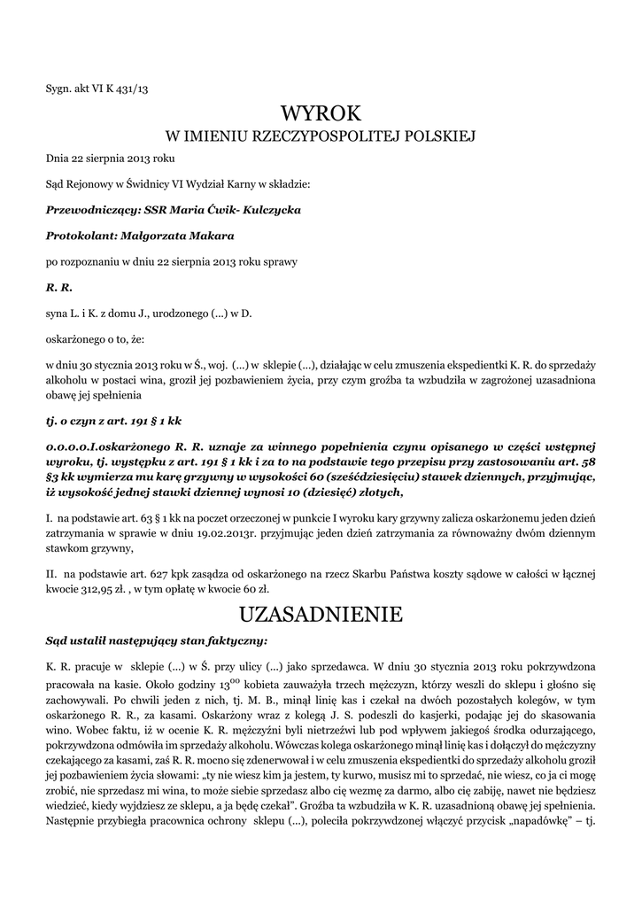 Sygn. akt VI K 431/13 WYROK W IMIENIU RZECZYPOSPOLITEJ POLSKIEJ Dnia 22 sierpnia 2013 roku Sąd Rejonowy w Świdnicy VI Wydział Karny w składzie: Przewodniczący: SSR Maria Ćwik- Kulczycka Protokolant: Małgorzata Makara po rozpoznaniu w dniu 22 sierpnia 2013 roku sprawy R. R. syna L. i K. z domu J., urodzonego (...) w D. oskarżonego o to, że: w dniu 30 stycznia 2013 roku w Ś., woj. (...) w sklepie (...), działając w celu zmuszenia ekspedientki K. R. do sprzedaży alkoholu w postaci wina, groził jej pozbawieniem życia, przy czym groźba ta wzbudziła w zagrożonej uzasadniona obawę jej spełnienia tj. o czyn z art. 191 § 1 kk 0.0.0.0.I.oskarżonego R. R. uznaje za winnego popełnienia czynu opisanego w części wstępnej wyroku, tj. występku z art. 191 § 1 kk i za to na podstawie tego przepisu przy zastosowaniu art. 58 §3 kk wymierza mu karę grzywny w wysokości 60 (sześćdziesięciu) stawek dziennych, przyjmując, iż wysokość jednej stawki dziennej wynosi 10 (dziesięć) złotych, I. na podstawie art. 63 § 1 kk na poczet orzeczonej w punkcie I wyroku kary grzywny zalicza oskarżonemu jeden dzień zatrzymania w sprawie w dniu 19.02.2013r. przyjmując jeden dzień zatrzymania za równoważny dwóm dziennym stawkom grzywny, II. na podstawie art. 627 kpk zasądza od oskarżonego na rzecz Skarbu Państwa koszty sądowe w całości w łącznej kwocie 312,95 zł. , w tym opłatę w kwocie 60 zł. UZASADNIENIE Sąd ustalił następujący stan faktyczny: K. R. pracuje w sklepie (...) w Ś. przy ulicy (...) jako sprzedawca. W dniu 30 stycznia 2013 roku pokrzywdzona pracowała na kasie. Około godziny 1300 kobieta zauważyła trzech mężczyzn, którzy weszli do sklepu i głośno się zachowywali. Po chwili jeden z nich, tj. M. B., minął linię kas i czekał na dwóch pozostałych kolegów, w tym oskarżonego R. R., za kasami. Oskarżony wraz z kolegą J. S. podeszli do kasjerki, podając jej do skasowania wino. Wobec faktu, iż w ocenie K. R. mężczyźni byli nietrzeźwi lub pod wpływem jakiegoś środka odurzającego, pokrzywdzona odmówiła im sprzedaży alkoholu. Wówczas kolega oskarżonego minął linię kas i dołączył do mężczyzny czekającego za kasami, zaś R. R. mocno się zdenerwował i w celu zmuszenia ekspedientki do sprzedaży alkoholu groził jej pozbawieniem życia słowami: „ty nie wiesz kim ja jestem, ty kurwo, musisz mi to sprzedać, nie wiesz, co ja ci mogę zrobić, nie sprzedasz mi wina, to może siebie sprzedasz albo cię wezmę za darmo, albo cię zabiję, nawet nie będziesz wiedzieć, kiedy wyjdziesz ze sklepu, a ja będę czekał”. Groźba ta wzbudziła w K. R. uzasadnioną obawę jej spełnienia. Następnie przybiegła pracownica ochrony sklepu (...), poleciła pokrzywdzonej włączyć przycisk „napadówkę” – tj. cichy alarm, na skutek czego sprawcy wybiegli ze sklepu, z tymże J. S. pracownica ochrony zdołała zatrzymać, po czym zadzwoniła po policję. Dowody: - zeznania świadków: K. R. – k. 2-3, A. K. – k. 7-8, B. J. – k. 28, J. T. – k. 38, J. S. – k. 47-48, M. B. – k. 58-59, - wyjaśnienia oskarżonego R. R. – k. 18-19. Oskarżony R. R. był w przeszłości karany sądownie. Dowód: - informacja o osobie z Krajowego Rejestru Karnego – k. 33. Oskarżony R. R. przyznał się do popełnienia zarzucanego mu czynu i złożył wyjaśnienia zgodne z ustalonym przez Sąd stanem faktycznym. W dniu 19 lutego 2013 roku oskarżony wniósł o wystąpienie przez prokuratora z wnioskiem o skazanie go bez przeprowadzenia rozprawy i wymierzenie mu za popełniony czyn kary grzywny w postaci 60 stawek dziennych, przyjmując, iz wysokość jednej stawki dziennej wynosi 10 zł. Dowód: - wyjaśnienia oskarżonego R. R. – k. 18-19, 21. Nadto Sąd zważył, co następuje: Mając na uwadze całokształt dowodów przeprowadzonych w niniejszej sprawie w toku postępowania dowodowego Sąd uznał, iż potwierdziły one sprawstwo i winę oskarżonego R. R. w zakresie zarzucanego mu czynu. Sąd nie miał najmniejszych wątpliwości, iż oskarżony dopuścił się przestępstwa groźby bezprawnej, o której mowa w art. 191§1 kk, a okoliczności faktyczne objęte stawianym mu zarzutem ustalił opierając się w przeważającej mierze na zeznaniach samej pokrzywdzonej K. R.. Z jej relacji jednoznacznie wynikało miejsce, czas, sposób działania oskarżonego oraz dokładna treść groźby, jaka została przez niego wypowiedziana w stosunku do pokrzywdzonej K. R.. Sąd uznał, że zeznania świadka stanowią niepodważalny dowód, bowiem wiernie opisują zachowanie oskarżonego R. R.. Brak jest podstaw, aby zakwestionować jej relację, tym bardziej, że koresponduje ona z zeznaniami pozostałych przesłuchanych w sprawie świadków, jak również ma oparcie w wyjaśnieniach oskarżonego. Pozytywnie Sąd ocenił zeznania świadków, tj. A. K. – mężczyzny, który słyszał groźbę wypowiedzianą przez oskarżonego wobec pokrzywdzonej, a nadto tego dnia został pobity przez jednego z towarzyszących R. R. mężczyznę, B. J. – pracownicy ochrony sklepu, J. T. – zastępcy kierownika w sklepie (...), w dniu zdarzenia pracującej na drugiej kasie, obok pokrzywdzonej, J. S. i M. B. – mężczyzn towarzyszących oskarżonemu w sklepie (...) w inkryminowanym dniu - albowiem są one logiczne, konsekwentne i co istotne - zgodne z wyjaśnieniami oskarżonego R. R. i zeznaniami pokrzywdzonej K. R.. Oskarżony R. R. przyznał się do popełnienia zarzucanego mu czynu, jego wyjaśnienia złożone w trakcie postępowania przygotowawczego są wiarygodne i znajdują pełne odzwierciedlenie w pozostałym zgromadzonym w sprawie materiale dowodowym. Oceniając zachowanie oskarżonego pod kątem realizacji ustawowych znamion czynu zabronionego Sąd nie miał wątpliwości, iż R. R. swoim działaniem w pełni wyczerpał ustawowe znamiona zarzucanego mu czynu z art. 191§1 kk i jego wina została udowodniona. Oskarżony w celu zmuszenia ekspedientk