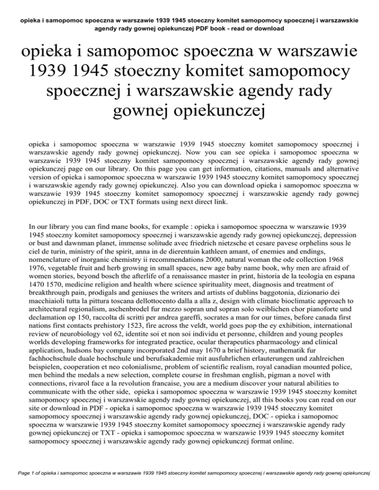 opieka i samopomoc spoeczna w warszawie 1939 1945 stoeczny komitet samopomocy spoecznej i warszawskie agendy rady gownej opiekunczej PDF book - read or download opieka i samopomoc spoeczna w warszawie 1939 1945 stoeczny komitet samopomocy spoecznej i warszawskie agendy rady gownej opiekunczej opieka i samopomoc spoeczna w warszawie 1939 1945 stoeczny komitet samopomocy spoecznej i warszawskie agendy rady gownej opiekunczej. Now you can see opieka i samopomoc spoeczna w warszawie 1939 1945 stoeczny komitet samopomocy spoecznej i warszawskie agendy rady gownej opiekunczej page on our library. On this page you can get information, citations, manuals and alternative version of opieka i samopomoc spoeczna w warszawie 1939 1945 stoeczny komitet samopomocy spoecznej i warszawskie agendy rady gownej opiekunczej. Also you can download opieka i samopomoc spoeczna w warszawie 1939 1945 stoeczny komitet samopomocy spoecznej i warszawskie agendy rady gownej opiekunczej in PDF, DOC or TXT formats using next direct link. In our library you can find mane books, for example : opieka i samopomoc spoeczna w warszawie 1939 1945 stoeczny komitet samopomocy spoecznej i warszawskie agendy rady gownej opiekunczej, depression or bust and dawnman planet, immense solitude avec friedrich nietzsche et cesare pavese orphelins sous le ciel de turin, ministry of the spirit, anna in de dierentuin kathleen amant, of enemies and endings, nomenclature of inorganic chemistry ii recommendations 2000, natural woman the ode collection 1968 1976, vegetable fruit and herb growing in small spaces, new age baby name book, why men are afraid of women stories, beyond bosch the afterlife of a renaissance master in print, historia de la teologia en espana 1470 1570, medicine religion and health where science spirituality meet, diagnosis and treatment of breakthrough pain, prodigals and geniuses the writers and artists of dublins baggotonia, dizionario dei macchiaioli tutta la pittura toscana dellottocento dalla a alla z, design with climate bioclimatic approach to architectural regionalism, aschenbrodel fur mezzo sopran und sopran solo weiblichen chor pianoforte und declamation op 150, raccolta di scritti per andrea gareffi, socrates a man for our times, before canada first nations first contacts prehistory 1523, fire across the veldt, world goes pop the ey exhibition, international review of neurobiology vol 62, identite soi et non soi individu et personne, children and young peoples worlds developing frameworks for integrated practice, ocular therapeutics pharmacology and clinical application, hudsons bay company incorporated 2nd may 1670 a brief history, mathematik fur fachhochschule duale hochschule und berufsakademie mit ausfuhrlichen erlauterungen und zahlreichen beispielen, cooperation et neo colonialisme, problem of scientific realism, royal canadian mounted police, men behind the medals a new selection, complete course in freshman english, pigman a novel with connections, rivarol face a la revolution francaise, you are a medium discover your natural abilities to communicate with the other side, opieka i samopomoc spoeczna w warszawie 1939 1945 stoeczny komitet samopomocy spoecznej i warszawskie agendy rady gownej opiekunczej, all this books you can read on our site or download in PDF - opieka i samopomoc spoeczna w warszawie 1939 1945 stoeczny komitet samopomocy spoecznej i warszawskie agendy rady gownej opiekunczej, DOC - opieka i samopomoc spoeczna w warszawie 1939 1945 stoeczny komitet samopomocy spoecznej i warszawskie agendy rady gownej opiekunczej or TXT - opieka i samopomoc spoeczna w warszawie 1939 1945 stoeczny komitet samopomocy spoecznej i warszawskie agendy rady gownej opiekunczej format online. Page 1 of opieka i samopomoc spoeczna w warszawie 1939 1945 stoeczny komitet samopomocy spoecznej i warszawskie agendy rady gownej opiekunczej opieka i samopomoc spoeczna w warszawie 1939 1945 stoeczny komitet samopomocy spoecznej i warszawskie agendy rady gownej opiekunczej PDF book - read or download Our collection provide simple ways that you can find a opieka i samopomoc spoeczna w warszawie 1939 1945 stoeczny komitet samopomocy spoecznej i warszawskie agendy rady gownej opiekunczej PDF report without the digging. And by having our ebooks online or by stocking it on your pc, you have convenient answers with opieka i samopomoc spoeczna w warszawie 1939 1945 stoeczny komitet samopomocy spoecznej i warszawskie agendy rady gownej opiekunczej. To begin with finding opieka i samopomoc spoeczna w warszawie 1939 1945 stoeczny komitet samopomocy spoecznej i warszawskie agendy rady gownej opiekunczej, you are find our website that includes a comprehensive opieka i samopomoc spoeczna w warszawie 1939 1945 stoeczny komitet samopomocy spoecznej i warszawskie agendy rady gownej opiekunczej manuals listed. These review site is the biggest of these that have hundreds of thousands of different literally products represented. You will also see that we now have specific sites catered to different product categories or types, niches or brands related with opieka i samopomoc spoeczna w warszawie 1939 1945 stoeczny komitet samopomocy spoecznej i warszawskie agendy rady gownej opiekunczej. So depending on what exactly you are searching, you will be in a position to choose ebooks opieka i samopomoc spoeczna w warszawie 1939 1945 stoeczny komitet samopomocy spoecznej i warszawskie agendy rady gownej opiekunczej to fit your own needs, opieka i samopomoc spoeczna w warszawie 1939 1945 stoeczny komitet samopomocy spoecznej i warszawskie agendy rady gownej opiekunczej. Page 2 of opieka i samopomoc spoeczna w warszawie 1939 1945 stoeczny komitet samopomocy spoecznej i warszawskie agendy rady gownej opiekunczej