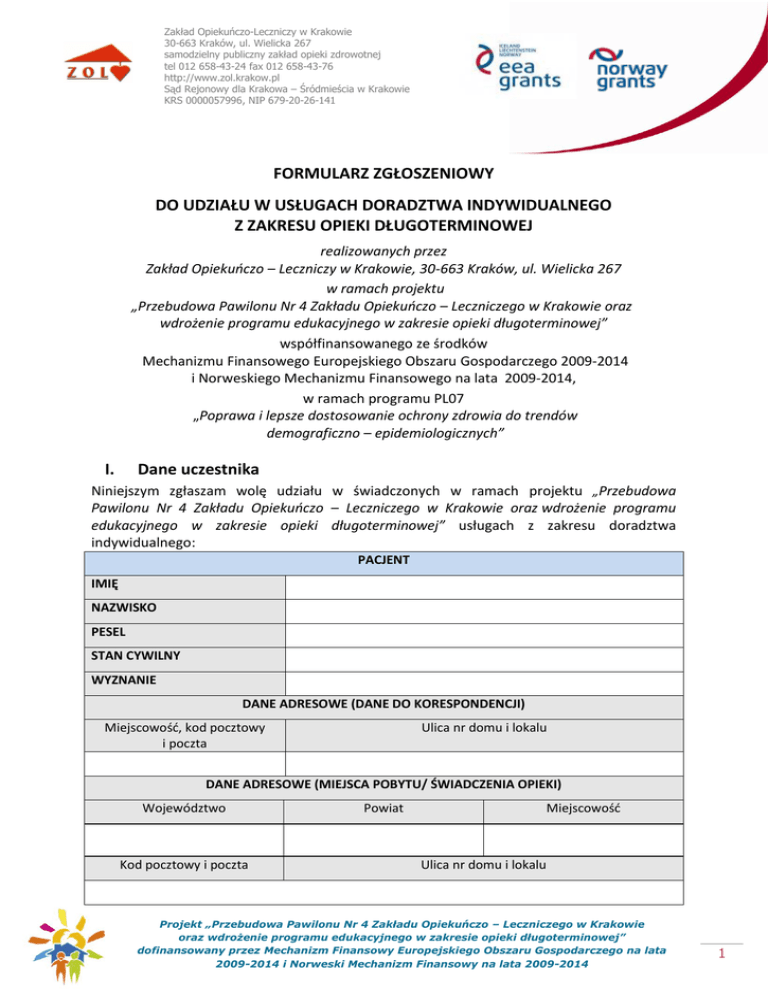 Zakład Opiekuńczo-Leczniczy w Krakowie 30-663 Kraków, ul. Wielicka 267 samodzielny publiczny zakład opieki zdrowotnej tel 012 658-43-24 fax 012 658-43-76 http://www.zol.krakow.pl Sąd Rejonowy dla Krakowa – Śródmieścia w Krakowie KRS 0000057996, NIP 679-20-26-141 FORMULARZ ZGŁOSZENIOWY DO UDZIAŁU W USŁUGACH DORADZTWA INDYWIDUALNEGO Z ZAKRESU OPIEKI DŁUGOTERMINOWEJ realizowanych przez Zakład Opiekuńczo – Leczniczy w Krakowie, 30-663 Kraków, ul. Wielicka 267 w ramach projektu „Przebudowa Pawilonu Nr 4 Zakładu Opiekuńczo – Leczniczego w Krakowie oraz wdrożenie programu edukacyjnego w zakresie opieki długoterminowej” współfinansowanego ze środków Mechanizmu Finansowego Europejskiego Obszaru Gospodarczego 2009-2014 i Norweskiego Mechanizmu Finansowego na lata 2009-2014, w ramach programu PL07 „Poprawa i lepsze dostosowanie ochrony zdrowia do trendów demograficzno – epidemiologicznych” I. Dane uczestnika Niniejszym zgłaszam wolę udziału w świadczonych w ramach projektu „Przebudowa Pawilonu Nr 4 Zakładu Opiekuńczo – Leczniczego w Krakowie oraz wdrożenie programu edukacyjnego w zakresie opieki długoterminowej” usługach z zakresu doradztwa indywidualnego: PACJENT IMIĘ NAZWISKO PESEL STAN CYWILNY WYZNANIE DANE ADRESOWE (DANE DO KORESPONDENCJI) Miejscowość, kod pocztowy i poczta Ulica nr domu i lokalu DANE ADRESOWE (MIEJSCA POBYTU/ ŚWIADCZENIA OPIEKI) Województwo Kod pocztowy i poczta Powiat Miejscowość Ulica nr domu i lokalu Projekt „Przebudowa Pawilonu Nr 4 Zakładu Opiekuńczo – Leczniczego w Krakowie oraz wdrożenie programu edukacyjnego w zakresie opieki długoterminowej” dofinansowany przez Mechanizm Finansowy Europejskiego Obszaru Gospodarczego na lata 2009-2014 i Norweski Mechanizm Finansowy na lata 2009-2014 1 Zakład Opiekuńczo-Leczniczy w Krakowie 30-663 Kraków, ul. Wielicka 267 samodzielny publiczny zakład opieki zdrowotnej tel 012 658-43-24 fax 012 658-43-76 http://www.zol.krakow.pl Sąd Rejonowy dla Krakowa – Śródmieścia w Krakowie KRS 0000057996, NIP 679-20-26-141 DANE KONTAKTOWE PACJENTA/OPIEKUNA1 Telefon kontaktowy e-mail PRZEDSTAWICIEL PRAWNY/BRAK PRZEDSTAWICIELA PRAWNEGO2 (należy dołączyć postanowienie sądu opiekuńczego o ustanowieniu opiekuna prawnego) IMIĘ NAZWISKO PESEL DANE KONTAKTOWE Telefon kontaktowy e-mail OPIEKUN FAKTYCZNY PACJENTA (należy wpisać jeżeli pacjent nie ma wyznaczonego opiekuna prawnego) IMIĘ NAZWISKO PESEL STOPIEŃ POKREWIEŃSTWA Z PACJENTEM DANE ADRESOWE (DANE DO KORESPONDENCJI) Województwo Powiat Kod pocztowy i poczta Miejscowość Ulica nr domu i lokalu DANE KONTAKTOWE Telefon kontaktowy 1 2 e-mail Zaznaczyć właściwe Zaznaczyć właściwe Projekt „Przebudowa Pawilonu Nr 4 Zakładu Opiekuńczo – Leczniczego w Krakowie oraz wdrożenie programu edukacyjnego w zakresie opieki długoterminowej” dofinansowany przez Mechanizm Finansowy Europejskiego Obszaru Gospodarczego na lata 2009-2014 i Norweski Mechanizm Finansowy na lata 2009-2014 2 Zakład Opiekuńczo-Leczniczy w Krakowie 30-663 Kraków, ul. Wielicka 267 samodzielny publiczny zakład opieki zdrowotnej tel 012 658-43-24 fax 012 658-43-76 http://www.zol.krakow.pl Sąd Rejonowy dla Krakowa – Śródmieścia w Krakowie KRS 0000057996, NIP 679-20-26-141 II. Opis stanu zdrowia pacjenta …………………………………………………………………………………… …………………………………………………………………………………… …………………………………………………………………………………… Na potwierdzenie stanu zdrowia przedstawiam3: 1. …………………………… 2. …………………………… III. Kryteria udziału w projekcie (należy zaznaczyć właściwe pola) Czy Pacjent jest osobą przewlekle chorą 4 Czy Pacjent jest osobą samodzielną Czy u Pacjenta występuje uszkodzenie lub upośledzenie funkcji organizmu (w następstwie choroby lub urazu) Czy Pacjent wymaga stałej opieki osób drugich w wykonywaniu czynności życiowych TAK NIE TAK NIE TAK NIE TAK NIE Proszę o potwierdzenie, w którym z poniższych obszarów u Pacjenta występuje dysfunkcja: Spożywanie posiłków TAK NIE Przemieszczanie się (z łóżka na krzesło i z powrotem, siadanie) TAK NIE Utrzymanie higieny osobistej TAK NIE Korzystanie z toalety TAK NIE Mycie, kąpiel całego ciała TAK NIE Poruszanie się (po powierzchniach płaskich) TAK NIE Należy wskazać dokumenty, których kopie uczestnik dołącza do formularza zgłoszeniowego Kategorię chorób przewlekłych należy rozpatrywać w kontekście dokumentów Organizacji Narodów Zjednoczonych i Światowej Organizacji Zdrowia. Za chorobę przewlekłą uznaje się chorobę, która: jest chorobą długotrwałą i nie rokuje całkowitego wyleczenia, stanowi zagrożenie epidemiologiczne – jest jedną z głównych przyczyn umieralności, zachorowalności i niepełnosprawności w Europie, nie jest chorobą zakaźną. 3 4 Projekt „Przebudowa Pawilonu Nr 4 Zakładu Opiekuńczo – Leczniczego w Krakowie oraz wdrożenie programu edukacyjnego w zakresie opieki długoterminowej” dofinansowany przez Mechanizm Finansowy Europejskiego Obszaru Gospodarczego na lata 2009-2014 i Norweski Mechanizm Finansowy na lata 2009-2014 3 Zakład Opiekuńczo-Leczniczy w Krakowie 30-663 Kraków, ul. Wielicka 267 samodzielny publiczny zakład opieki zdrowotnej tel 012 658-43-24 fax 012 658-43-76 http://www.zol.krakow.pl Sąd Rejonowy dla Krakowa – Śródmieścia w Krakowie KRS 0000057996, NIP 679-20-26-141 Wchodzenie i schodzenie po schodach TAK NIE Ubieranie się i rozbieranie TAK NIE Kontrolowanie stolca/zwieracza odbytu TAK NIE Kontrolowanie moczu/zwieracza pęcherza moczowego TAK NIE …………………………………………. Miejscowość, data ……………………………………………………………………………………………… Podpis (pacjenta/przedstawiciela prawnego pacjenta/op