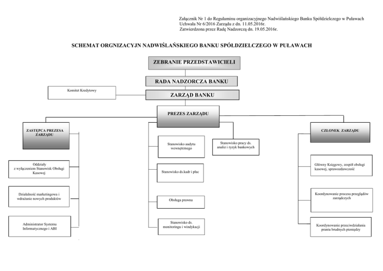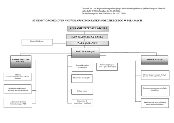 Załącznik Nr 1 do Regulaminu organizacyjnego Nadwiślańskiego Banku Spółdzielczego w Puławach Uchwała Nr 6/2016 Zarządu z dn. 11.05.2016r. Zatwierdzona przez Radę Nadzorczą dn. 19.05.2016r. SCHEMAT ORGNIZACYJN NADWIŚLAŃSKIEGO BANKU SPÓŁDZIELCZEGO W PUŁAWACH ZEBRANIE PRZEDSTAWICIELI RADA NADZORCZA BANKU Komitet Kredytowy ZARZĄD BANKU PREZES ZARZĄDU ZASTĘPCA PREZESA ZARZĄDU CZŁONEK ZARZĄDU Stanowisko audytu wewnętrznego Oddziały z wyłączeniem Stanowisk Obsługi A Kasowej Stanowisko ds.kadr i płac Działalność marketingowa i wdrażanie nowych produktów Obsługa prawna Administrator Systemu Informatycznego i ABI Stanowisko ds. monitoringu i windykacji Stanowisko pracy ds. analiz i ryzyk bankowych Główny Księgowy, zespół obsługi kasowej, sprawozdawczość Koordynowanie procesu przeglądów zarządczych Koordynowanie przeciwdziałania praniu brudnych pieniędzy