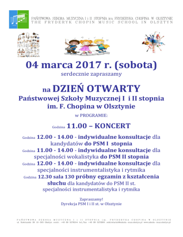 04 marca 2017 r. (sobota) serdecznie zapraszamy na DZIEŃ OTWARTY Państwowej Szkoły Muzycznej I i II stopnia im. F. Chopina w Olsztynie w PROGRAMIE: Godzina 11.00 – KONCERT 12.00 - 14.00 - indywidualne konsultacje dla kandydatów do PSM I stopnia Godzina 11.00 - 14.00 - indywidualne konsultacje dla specjalności wokalistyka do PSM II stopnia Godzina 12.00 - 14.00 - indywidualne konsultacje dla specjalności instrumentalistyka i rytmika Godzina 12.30 sala 130 próbny egzamin z kształcenia słuchu dla kandydatów do PSM II st. Godzina specjalności instrumentalistyka i rytmika Zapraszamy! Dyrekcja PSM I i II st. w Olsztynie