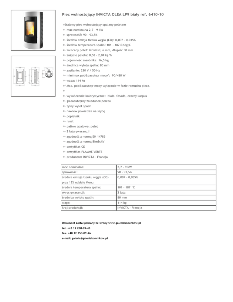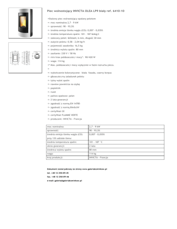 Piec wolnostojący INVICTA OLEA LP9 biały ref. 6410-10 Stalowy piec wolnostojący opalany peletem - moc nominalna 2,7 - 9 kW - sprawność: 90 - 93,5% - średnia emisja tlenku węgla (CO): 0,007 - 0,035% - średnia temperatura spalin: 101 - 187 °C - zalecany pelet: Ø 6 mm, długość 30 mm - zużycie peletu: 0,58 - 2,04 kg/h - pojemność zasobnika: 16,5 kg - średnica wylotu spalin: 80 mm - zasilanie: 230 V / 50 Hz - min/max pobór mocy*: 90/420 W - waga: 114 kg * Max. pobór mocy wyłącznie w fazie rozruchu pieca. - wykończenie kolorystyczne: biała fasada, czarny korpus - górny załadunek peletu - tylny wylot spalin - nawiew powietrza na szybę - popielnik - ruszt - paliwo opałowe: pelet - 2 lata gwarancji - zgodność z normą EN 14785 - zgodność z normą BImSchV - certyfikat CE - certyfikat FLAMME VERTE - producent: INVICTA - Francja moc nominalna: 2,7 - 9 kW sprawność: 90 - 93,5% średnia emisja tlenku węgla (CO) 0,007 - 0,035% przy 13% udziale tlenu: średnia temperatura spalin: 101 - 187 °C okres gwarancji: 2 lata średnica wylotu spalin: 80 mm waga: 114 kg kraj produkcji: INVICTA - Francja Dokument został pobrany ze strony www.galeriakominkow.pl tel. +48 12 250-09-45 fax. +48 12 250-09-46 e-mail: [email protected]