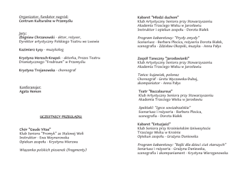 Organizator, fundator nagród: Centrum Kulturalne w Przemyœlu Jury: Zbigniew Chrzanowski - aktor, re¿yser, Dyrektor artystyczny Polskiego Teatru we Lwowie Kazimierz £ysy - muzykolog Krystyna Meresch-Knapek Meresch-Knape - aktorka, Prezes Teatru Dramatycznego “Fredreum” w Przemyœlu Krystyna Trojanowska - choreograf Kabaret “M³odzi duchem” Klub Artystyczny Seniora przy Stowarzyszeniu Akademia Trzeciego Wieku w Jaros³awiu Instruktor i opiekun zespo³u - Dorota Bia³ek Program kabaretowy: “Prys³y zmys³y” Scenariusz - Barbara P³ocica, re¿yseria Dorota Bia³ek, scenografia - Zdzis³aw Okopski, muzyka - Anna Pa³ys Zespó³ Taneczny “Jaros³awianki” Klub Artystyczny Seniora przy Stowarzyszeniu Akademia Trzeciego Wieku w Jaros³awiu Tañce: kujawiak, polonez Choreograf - Greta Wyczawska-Dubaj, akompaniator - Anna Pa³ys Konferansjer: Agata Hemon UCZESTNICY PRZEGL¥DU: Chór “Gaude Vitae” Klub Seniora “Promyk” ze Stalowej Woli Instruktor - Ewa Woynarowska Opiekun zespo³u - Krystyna Mierzwa Wi¹zanka polskich piosenek (fragmenty) Teatr “Baccalaureus” Klub Artystyczny Seniora przy Stowarzyszeniu Akademia Trzeciego Wieku w Jaros³awiu Spektakl: “Igrce sowizdrzalskie” Scenariusz i re¿yseria - Barbara P³ocica, scenografia - Dorota Bia³ek Kabaret “Entuzjaœci” Klub Seniora przy Kroœnieñskim Uniwesytecie Trzeciego Wieku w Kroœnie Opiekun zespo³u - Gra¿yna Daniewska Program kabaretowy: “Bajki dla dzieci ciut starszych” Senariusz i re¿yseria - Gra¿yna Daniewska, scenografia i akompaniament - Krystyna Wierzganowska