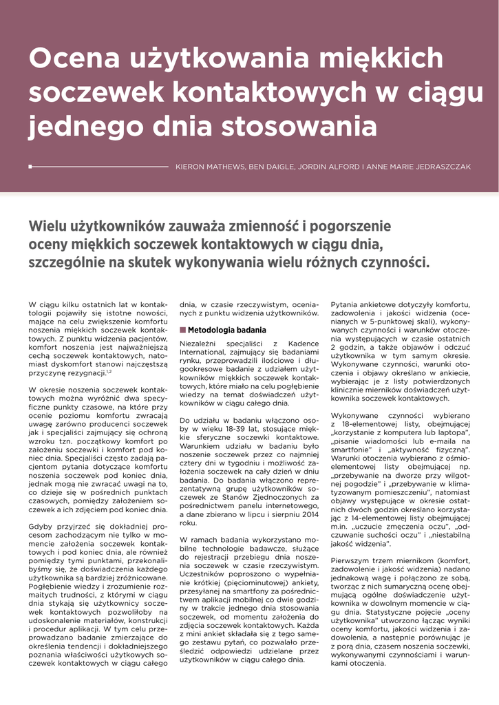 Ocena użytkowania miękkich soczewek kontaktowych w ciągu jednego dnia stosowania KIERON MATHEWS, BEN DAIGLE, JORDIN ALFORD I ANNE MARIE JEDRASZCZAK Wielu użytkowników zauważa zmienność i pogorszenie oceny miękkich soczewek kontaktowych w ciągu dnia, szczególnie na skutek wykonywania wielu różnych czynności. W ciągu kilku ostatnich lat w kontaktologii pojawiły się istotne nowości, mające na celu zwiększenie komfortu noszenia miękkich soczewek kontaktowych. Z punktu widzenia pacjentów, komfort noszenia jest najważniejszą cechą soczewek kontaktowych, natomiast dyskomfort stanowi najczęstszą przyczynę rezygnacji.1,2 W okresie noszenia soczewek kontaktowych można wyróżnić dwa specyficzne punkty czasowe, na które przy ocenie poziomu komfortu zwracają uwagę zarówno producenci soczewek jak i specjaliści zajmujący się ochroną wzroku tzn. początkowy komfort po założeniu soczewki i komfort pod koniec dnia. Specjaliści często zadają pacjentom pytania dotyczące komfortu noszenia soczewek pod koniec dnia, jednak mogą nie zwracać uwagi na to, co dzieje się w pośrednich punktach czasowych, pomiędzy założeniem soczewek a ich zdjęciem pod koniec dnia. Gdyby przyjrzeć się dokładniej procesom zachodzącym nie tylko w momencie założenia soczewek kontaktowych i pod koniec dnia, ale również pomiędzy tymi punktami, przekonalibyśmy się, że doświadczenia każdego użytkownika są bardziej zróżnicowane. Pogłębienie wiedzy i zrozumienie rozmaitych trudności, z którymi w ciągu dnia stykają się użytkownicy soczewek kontaktowych pozwoliłoby na udoskonalenie materiałów, konstrukcji i procedur aplikacji. W tym celu przeprowadzano badanie zmierzające do określenia tendencji i dokładniejszego poznania właściwości użytkowych soczewek kontaktowych w ciągu całego dnia, w czasie rzeczywistym, ocenianych z punktu widzenia użytkowników. ■ Metodologia badania Niezależni specjaliści z Kadence International, zajmujący się badaniami rynku, przeprowadzili ilościowe i długookresowe badanie z udziałem użytkowników miękkich soczewek kontaktowych, które miało na celu pogłębienie wiedzy na temat doświadczeń użytkowników w ciągu całego dnia. Do udziału w badaniu włączono osoby w wieku 18-39 lat, stosujące miękkie sferyczne soczewki kontaktowe. Warunkiem udziału w badaniu było noszenie soczewek przez co najmniej cztery dni w tygodniu i możliwość założenia soczewek na cały dzień w dniu badania. Do badania włączono reprezentatywną grupę użytkowników soczewek ze Stanów Zjednoczonych za pośrednictwem panelu internetowego, a dane zbierano w lipcu i sierpniu 2014 roku. W ramach badania wykorzystano mobilne technologie badawcze, służące do rejestracji przebiegu dnia noszenia soczewek w czasie rzeczywistym. Uczestników poproszono o wypełnianie krótkiej (pięciominutowej) ankiety, przesyłanej na smartfony za pośrednictwem aplikacji mobilnej co dwie godziny w trakcie jednego dnia stosowania soczewek, od momentu założenia do zdjęcia soczewek kontaktowych. Każda z mini ankiet składała się z tego samego zestawu pytań, co pozwalało prześledzić odpowiedzi udzielane przez użytkowników w ciągu całego dnia. Pytania ankietowe dotyczyły komfortu, zadowolenia i jakości widzenia (ocenianych w 5-punktowej skali), wykonywanych czynności i warunków otoczenia występujących w czasie ostatnich 2 godzin, a także objawów i odczuć użytkownika w tym samym okresie. Wykonywane czynności, warunki otoczenia i objawy określano w ankiecie, wybierając je z listy potwierdzonych klinicznie mierników doświadczeń użytkownika soczewek kontaktowych. Wykonywane czynności wybierano z 18-elementowej listy, obejmującej „korzystanie z komputera lub laptopa”, „pisanie wiadomości lub e-maila na smartfonie” i „aktywność fizyczną”. Warunki otoczenia wybierano z ośmioelementowej listy obejmującej np. „przebywanie na dworze przy wilgotnej pogodzie” i „przebywanie w klimatyzowanym pomieszczeniu”, natomiast objawy występujące w okresie ostatnich dwóch godzin określano korzystając z 14-elementowej listy obejmującej m.in. „uczucie zmęczenia oczu”, „odczuwanie suchości oczu” i „niestabilną jakość widzenia”. Pierwszym trzem miernikom (komfort, zadowolenie i jakość widzenia) nadano jednakową wagę i połączono ze sobą, tworząc z nich sumaryczną ocenę obejmującą ogólne doświadczenie użytkownika w dowolnym momencie w ciągu dnia. Statystyczne pojęcie „oceny użytkownika” utworzono łącząc wyniki oceny komfortu, jakości widzenia i zadowolenia, a następnie porównując je z porą dnia, czasem noszenia soczewki, wykonywanymi czynnościami i warunkami otoczenia. 66% 62% 59% 59% 55% 55% 59% 54% 54% 53% 50% 50% 50% 56% 56% 45% 45% 51% 50% 45% 45% 48% 48% 44% 44% 44% 43% 43% 42% 35% 35% 40% 40% 40% 40% 39% 39% 39% 39% 39% 36% 36% 39% 37% 35% 35% 37% 37% 36% 36% Jakość widzenia 25% 25% Zadowolenie 30% 30% 30% 34% 33% 33% 33% 32% 30% 30% 30% 29% 29% 29% Komfort 28% 28% 24% 24% 23% 25% 25% 25% 24% 23% 23% 23% 20% 20% 15% 15% 2,5 3 3,5 4 4,5 5 5,5 6 6,5 7 7,5 8 8,5 9 9,5 10 10,5 11 11,5 12 12,5 13 13.5 14 14,5 Czas noszenia soczewek (godziny) Uwaga: komfort, zadowolenie i jakość widzenia wykazują silną korelację przy 95% przedziale ufności ■ Wyniki Nie wszyscy respondenci odczuwali pogorszenie właściwości użytkowych soczewek w ten sam sposób. W grupie Soczewki Reusable jednodniowe 60% 50% 41% 41% 40% 30% 39% 39% 31% 33% 31% 33% 24% 30% 20% 24% 15% 16% 20% 10% 15% 16% 14% 14% 11% 11% 14% 14% 10% 3 4 5 6 7 8 9 10 11 12 7% 7% 7% 7% 13 14 Czas noszenia soczewek (godziny) Utrzymanie właściwości użytkowych – 41% Ocena użytkownika (odsetek najwyższych ocen) 70% 70% 60% 60% 50% 50% 40% 40% 30% 80% 49% 46% 43% 43% 49% 42% 42% 40% 46% 38% 43% 43% 40% 42% 42% 38% 46% 41% 46% 41% 43% 44% 43% 44% 70% 60% 50% 40% 30% 20% 30% 20% 10% 20% 10% 0% 10% 0% 3 4 5 6 7 8